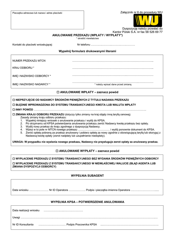 Załącznik nr 6 do procedury WU Pieczątka adresowa lub nazwa i adres placówki Dyspozycję należy przesłać do Kantor Polski S.A. nr fax 58 526 69 77 ANULOWANIE PRZEKAZU (WPŁATY / WYPŁATY*) * skreślić niewłaściwe Kontakt do placówki wnioskującej: Nr telefonu ………….………..……….…….………. Wypełnij formularz drukowanymi literami NUMER PRZEKAZU MTCN ……………………………………………………………………….. KRAJ ODBIORU * ……………………………………………………………………….. IMIĘ I NAZWISKO ODBIORCY * ………………………………………………..……………………… IMIĘ I NAZWISKO NADAWCY * …………………………………………………………..…………… * należy wpisać dane przed zmianą ANULOWANIE WPŁATY – zaznacz powód NIEPRZYJĘCIE OD NADAWCY ŚRODKÓW PIENIĘŻNYCH Z TYTUŁU NADANIA PRZEKAZU BŁĘDNIE WPROWADZONA DO SYSTEMU TRANSAKCYJNEGO KWOTA LUB WALUTA WPŁATY INNY POWÓD ……………………………………………………………………………………………………………….. ZMIANA KRAJU ODBIORU PRZEKAZU (dotyczy tylko zmiany na kraj objęty inną taryfą cenową). Zasady zmiany kraju odbioru przekazu: 1. Wypełnij niniejszy wniosek o anulowanie przekazu i wyślij do KPSA. 2. Po otrzymaniu od KPSA potwierdzenia anulowania przekazu zwróć Nadawcy kwotę przekazu bez opłaty. 3. Wyślij nowy przekaz do kraju zgodnego z dyspozycją Nadawcy. 4. Wpisz w to pole nr MTCN nowego przekazu ……………………………… i wyślij ponownie dokument do KPSA. 5. Zwróć opłatę pobraną za przekaz anulowany i pobierz opłatę za nowy zgodnie z obowiązującą taryfą lub skoryguj z Nadawcą kwotę opłaty (zwrot nadpłaty lub uzupełnienie niedopłaty). UWAGA: W przypadku nie wysłania nowego przekazu, Nadawcy nie przysługuje zwrot opłaty za anulowany przekaz. ANULOWANIE WYPŁATY – zaznacz powód WYPŁACENIE PRZEKAZU Z SYSTEMU TRANSAKCYJNEGO BEZ WYDANIA ŚRODKÓW PIENIĘŻNYCH ODBIORCY WYPŁACENIE PRZEKAZU Z SYSTEMU TRANSAKCYJNEGO W NIEWŁAŚCIWEJ WALUCIE (BŁĄD AGENTA LUB ZMIANA DYSPOZYCJI ODBIORCY) WYPEŁNIA SUBAGENT Data wniosku …………………. Nr ID Operatora ………………. Podpis i pieczątka imienna Operatora ………………………...... WYPEŁNIA KPSA – POTWIERDZENIE ANULOWANIA Data realizacji wniosku …………………..…………………. Uwagi …………………………………………………………………………………………………..………………………………….… Nr ID Konsultanta …………….…………… Podpis Pracownika KPSA ....……………………………………….……………..