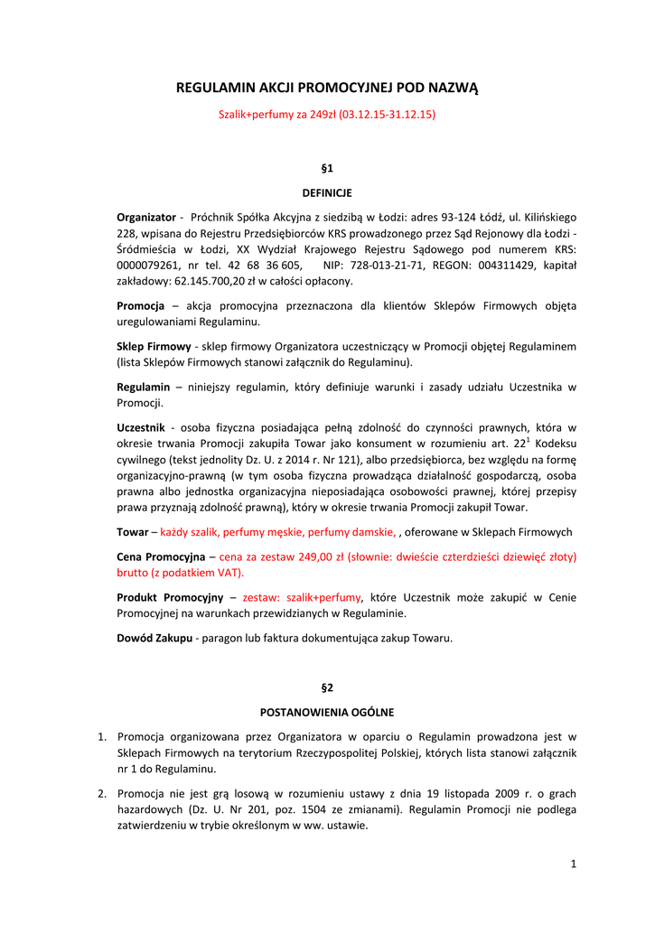 REGULAMIN AKCJI PROMOCYJNEJ POD NAZWĄ Szalik+perfumy za 249zł (03.12.15-31.12.15) §1 DEFINICJE Organizator - Próchnik Spółka Akcyjna z siedzibą w Łodzi: adres 93-124 Łódź, ul. Kilińskiego 228, wpisana do Rejestru Przedsiębiorców KRS prowadzonego przez Sąd Rejonowy dla Łodzi Śródmieścia w Łodzi, XX Wydział Krajowego Rejestru Sądowego pod numerem KRS: 0000079261, nr tel. 42 68 36 605, NIP: 728-013-21-71, REGON: 004311429, kapitał zakładowy: 62.145.700,20 zł w całości opłacony. Promocja – akcja promocyjna przeznaczona dla klientów Sklepów Firmowych objęta uregulowaniami Regulaminu. Sklep Firmowy - sklep firmowy Organizatora uczestniczący w Promocji objętej Regulaminem (lista Sklepów Firmowych stanowi załącznik do Regulaminu). Regulamin – niniejszy regulamin, który definiuje warunki i zasady udziału Uczestnika w Promocji. Uczestnik - osoba fizyczna posiadająca pełną zdolność do czynności prawnych, która w okresie trwania Promocji zakupiła Towar jako konsument w rozumieniu art. 221 Kodeksu cywilnego (tekst jednolity Dz. U. z 2014 r. Nr 121), albo przedsiębiorca, bez względu na formę organizacyjno-prawną (w tym osoba fizyczna prowadząca działalność gospodarczą, osoba prawna albo jednostka organizacyjna nieposiadająca osobowości prawnej, której przepisy prawa przyznają zdolność prawną), który w okresie trwania Promocji zakupił Towar. Towar – każdy szalik, perfumy męskie, perfumy damskie, , oferowane w Sklepach Firmowych Cena Promocyjna – cena za zestaw 249,00 zł (słownie: dwieście czterdzieści dziewięć złoty) brutto (z podatkiem VAT). Produkt Promocyjny – zestaw: szalik+perfumy, które Uczestnik może zakupić w Cenie Promocyjnej na warunkach przewidzianych w Regulaminie. Dowód Zakupu - paragon lub faktura dokumentująca zakup Towaru. §2 POSTANOWIENIA OGÓLNE 1. Promocja organizowana przez Organizatora w oparciu o Regulamin prowadzona jest w Sklepach Firmowych na terytorium Rzeczypospolitej Polskiej, których lista stanowi załącznik nr 1 do Regulaminu. 2. Promocja nie jest grą losową w rozumieniu ustawy z dnia 19 listopada 2009 r. o grach hazardowych (Dz. U. Nr 201, poz. 1504 ze zmianami). Regulamin Promocji nie podlega zatwierdzeniu w trybie określonym w ww. ustawie. 1 3. Promocja trwa od dnia 03.12.2015 roku do dnia 31.12.2015 roku, nie później jednak niż do wyczerpania puli Produktów Promocyjnych. 4. Regulamin Promocji dostępny jest na stronie internetowej Organizatora pod adresem: http://www.prochnik.pl §3 WARUNKI UCZESTNICTWA W PROMOCJI 1. Uczestnictwo w Promocji jest dobrowolne i uzależnione od spełnienia warunków określonych w Regulaminie. 2. Z udziału w Promocji wyklucza się osoby będące pracownikami lub zleceniobiorcami Organizatora, w tym zatrudnione w Salonach Firmowych. §4 ZASADY I PRZEBIEG PROMOCJI 1. Uczestnik przystępujący do Promocji, który zakupi w Sklepie Firmowym Produkt Promocyjny, otrzyma możliwość jego zakupu w Cenie Promocyjnej. 2. Produkt Promocyjny nie może być wymieniony przez Organizatora na gotówkę bądź inny towar. 3. Każdy z Uczestników może wziąć udział w Promocji wielokrotnie w trakcie jej trwania, po każdorazowym spełnieniu warunków określonych w ust. 1. 4. Promocja nie łączy się z innymi zniżkami i promocjami organizowanymi przez Organizatora. 5. Decyzję w przedmiocie skorzystania z możliwości zakupu Produktu Promocyjnego Uczestnik winien przekazać sprzedawcy Sklepu Firmowego najpóźniej przed wystawieniem faktury lub zaewidencjonowaniem sprzedaży za pomocą kasy rejestrującej. Zakup Produktu Promocyjnego podlega ujęciu w Dowodzie Zakupu. §5 REKLAMACJE Reklamacje Towarów i Produktów Promocyjnych rozpatrywane są na podstawie następujących przepisów prawnych: a) w przypadku, gdy Towar lub Produkt Promocyjny został zakupiony przez Uczestnika będącego konsumentem w rozumieniu art. 221 Kodeksu cywilnego zastosowanie znajdują przepisy Kodeksu Cywilnego oraz ustawa z dnia 30 maja 2014 r. o prawach konsumenta (Dz. U. 2014 r. poz. 827); b) w przypadku, gdy Towar lub Produkt Promocyjny został zakupiony przez Uczestnika nie będącego konsumentem ww. rozumieniu, zastosowanie znajdują przepisy Kodeksu cywilnego. 2 §6 POSTANOWIENIA KOŃCOWE 1. Regulamin dostępny jest w siedzibie Organizatora, Sklepach Firmowych oraz pod adresem pod adresem: http://www.prochnik.pl 2. Udział Uczestnika w akcji promocyjnej oznacza akceptację zasad Promocji zawartych w Regulaminie. 3. W wypadku wątpliwości dotyczących postanowień Regulaminu, Uczestnik ma prawo w okresie trwania Promocji zwrócić się do Organizatora o dokonanie wyjaśnień postanowień Regulaminu. 4. Do rozstrzygania wszelkich sporów wynikłych ze stosowania Regulaminu właściwy jest sąd powszechny właściwy ze względu na przepisy obowiązującego prawa. 5. W sprawach nieuregulowanych Regulaminem mają zastosowanie przepisy powszechnie obowiązującego prawa. 6. Regulamin obowiązuje od dnia 03.12.2015 roku do dnia zakończenia Promocji. 7. Organizator ma prawo do zmiany postanowień Regulaminu w razie zmiany stosunków gospodarczych, finansowych i ekonomicznych wywierających wpływ na realizację Promocji 3 Załącznik nr 1 [Lista Sklepów Firmowych] Lp. 1 Sklepy Firmowe Atrium Biała Czesława Miłosza 2 2 15-265 Białystok Alfa Świętojańska 15 3 4 15-277 Białystok MODO ul. Łopuszańska 22 lokal A12 M1 Będzińska 80 5 41-250 Czeladź Fashion House Outlet Center Przywidzka 8 6 80-174 Gdańsk Alfa Centrum Kołobrzeska 41C 7 80-391 Gdańsk Galeria Bałtycka Grunwaldzka 141 8 80-264 Gdańsk Silesia City Center Chorzowska 107 9 40-101 Katowice Factory Wrocław Graniczna 2 10 54-610 Wrocław Galeria Echo Świetokrzyska 20 11 25-406 Kielce M1 Al. Pokoju 67 12 31-580 Kraków Factory Kraków Prof. A. Rożańskiego 32 13 20-234 Lublin Factory Outlet Dębiecka 1 15 62-030 Luboń Centrala Outlet Kilińskiego 228 16 93-124 Łódź Manufaktura Karskiego 5 17 91-071 Łód