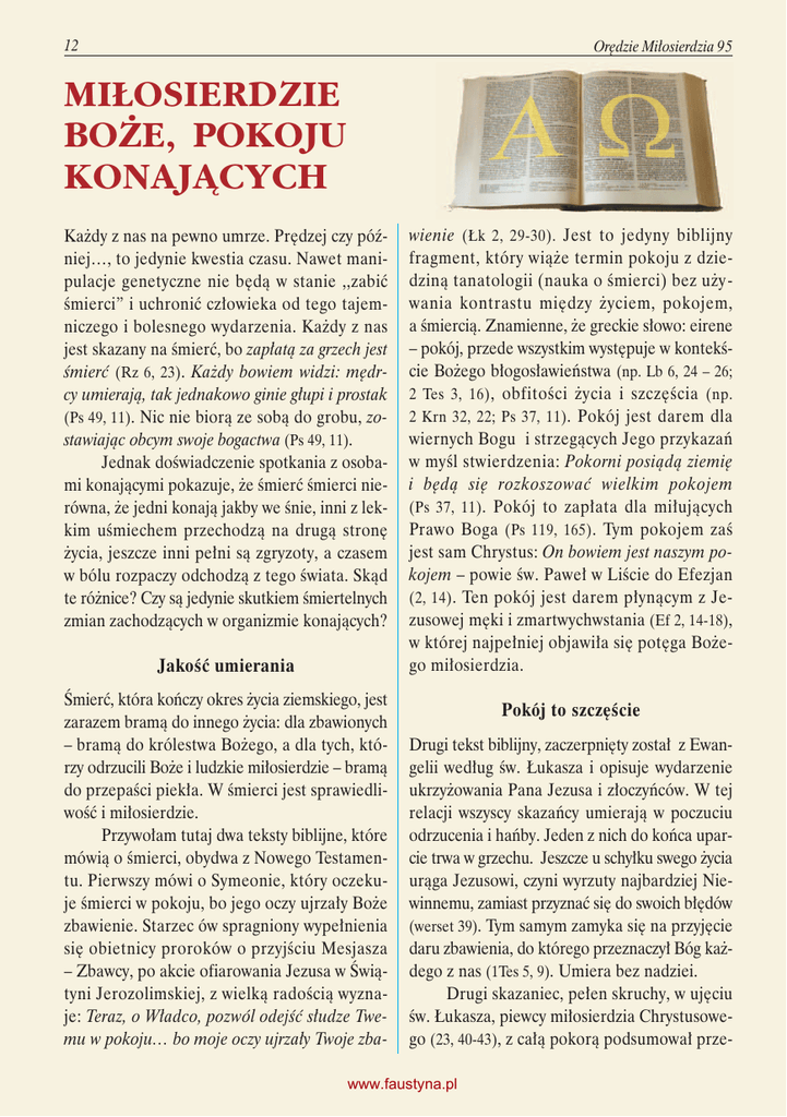 12 Orędzie Miłosierdzia 95 MIŁOSIERDZIE BOŻE, POKOJU KONAJĄCYCH Każdy z nas na pewno umrze. Prędzej czy później…, to jedynie kwestia czasu. Nawet manipulacje genetyczne nie będą w stanie ,,zabić śmierci” i uchronić człowieka od tego tajemniczego i bolesnego wydarzenia. Każdy z nas jest skazany na śmierć, bo zapłatą za grzech jest śmierć (Rz 6, 23). Każdy bowiem widzi: mędrcy umierają, tak jednakowo ginie głupi i prostak (Ps 49, 11). Nic nie biorą ze sobą do grobu, zostawiając obcym swoje bogactwa (Ps 49, 11). Jednak doświadczenie spotkania z osobami konającymi pokazuje, że śmierć śmierci nierówna, że jedni konają jakby we śnie, inni z lekkim uśmiechem przechodzą na drugą stronę życia, jeszcze inni pełni są zgryzoty, a czasem w bólu rozpaczy odchodzą z tego świata. Skąd te różnice? Czy są jedynie skutkiem śmiertelnych zmian zachodzących w organizmie konających? Jakość umierania Śmierć, która kończy okres życia ziemskiego, jest zarazem bramą do innego życia: dla zbawionych – bramą do królestwa Bożego, a dla tych, którzy odrzucili Boże i ludzkie miłosierdzie – bramą do przepaści piekła. W śmierci jest sprawiedliwość i miłosierdzie. Przywołam tutaj dwa teksty biblijne, które mówią o śmierci, obydwa z Nowego Testamentu. Pierwszy mówi o Symeonie, który oczekuje śmierci w pokoju, bo jego oczy ujrzały Boże zbawienie. Starzec ów spragniony wypełnienia się obietnicy proroków o przyjściu Mesjasza – Zbawcy, po akcie ofiarowania Jezusa w Świątyni Jerozolimskiej, z wielką radością wyznaje: Teraz, o Władco, pozwól odejść słudze Twemu w pokoju… bo moje oczy ujrzały Twoje zba- wienie (Łk 2, 29-30). Jest to jedyny biblijny fragment, który wiąże termin pokoju z dziedziną tanatologii (nauka o śmierci) bez uży wania kontrastu między życiem, pokojem, a śmiercią. Znamienne, że greckie słowo: eirene – pokój, przede wszystkim występuje w kontekście Bożego błogosławieństwa (np. Lb 6, 24 – 26; 2 Tes 3, 16) , obfitości życia i szczęścia (np. 2 Krn 32, 22; Ps 37, 11) . Pokój jest darem dla wiernych Bogu i strzegących Jego przykazań w myśl stwierdzenia: Pokorni posiądą ziemię i będą się rozkoszować wielkim pokojem (Ps 37, 11) . Pokój to zapłata dla miłujących Prawo Boga (Ps 119, 165) . Tym pokojem zaś jest sam Chrystus: On bowiem jest naszym pokojem – powie św. Paweł w Liście do Efezjan (2, 14) . Ten pokój jest darem płynącym z Jezusowej męki i zmartwychwstania (Ef 2, 14-18), w której najpełniej objawiła się potęga Bożego miłosierdzia. Pokój to szczęście Drugi tekst biblijny, zaczerpnięty został z Ewangelii według św. Łukasza i opisuje wydarzenie ukrzyżowania Pana Jezusa i złoczyńców. W tej relacji wszyscy skazańcy umierają w poczuciu odrzucenia i hańby. Jeden z nich do końca uparcie trwa w grzechu. Jeszcze u schyłku swego życia urąga Jezusowi, czyni wyrzuty najbardziej Niewinnemu, zamiast przyznać się do swoich błędów (werset 39). Tym samym zamyka się na przyjęcie daru zbawienia, do którego przeznaczył Bóg każdego z nas (1Tes 5, 9). Umiera bez nadziei. Drugi skazaniec, pełen skruchy, w ujęciu św. Łukasza, piewcy miłosierdzia Chrystusowego (23, 40-43), z całą pokorą podsumował prze- www.faustyna.pl lipiec, sierpień, wrzesień 2015 graną swego życia. Jednocześnie, nie popadając w rozpacz, poprosił o łaskę Tego, w którym dostrzegł ostatnią szansę ratunku. Jakże wielkim zaskoczeniem musiało być dla niego zapewnienie Jezusa o darze Nieba jeszcze w dniu śmierci. Ten łotr w ostatnich godzinach swego życia doświadczył Bożego pokoju i pełen nadziei odchodził z tego świata. Obaj konali w okrutnych męczarniach, wijąc się z bólu na krzyżu, ale jakość umierania dwóch łotrów była diametralnie różna. Nawrócony łotr otrzymał gwarancję bycia w Niebie, bo ze skruchą przyznał się do grzechu, żałował, wiedział, że cierpienie jest skutkiem jego złych wyborów: My przecież – przyznawał – sprawiedliwie, odbieramy bowiem słuszną karę za nasze uczynki, ale On nic złego nie uczynił (werset 41). Chociaż w omawianym fragmencie nie występuje słowo mówiące o pokoju, to jednak wyczuwa się go w słowach kruszącego swe serce łotra. Zamiast roszczeń – prośba. W miejsce urągania – samooskarżanie się. Zamiast nikczemnego zamykania siebie w braku przebaczenia, ufne spojrzenie w stronę Zbawcy. Wreszcie trzeci skazany to niewinny Jezus, który wziął na siebie cały grzech świata. 13 On, który grzechu nie popełnił, gdy konał, nie złorzeczył, nie groził, ale modlił się o przebaczenie dla oprawców (Łk 23, 34) , pozostawił testament miłości (J 19, 27) i oddawał się Ojcu Niebieskiemu (Łk 23, 46) . Na Golgocie wypełniły się słowa Psalmisty 85, 11: Łaskawość i wierność spotkają się z sobą, ucałują się sprawiedliwość i pokój. Wszystkie te przymioty w najdoskonalszym stopniu spotkały się w Osobie Jezusa Chrystusa. Paradoksalnie właśnie na wzgórzu Golgoty odsłania się tajemnica łaski szczęśliwej śmierci, czyli takiej, która dokonujące się w zjednoczeniu z Bogiem. Najdoskonalszy wzór pozostawił Jezus. Naczyniem do czerpania tego daru pokoju jest zaufanie miłosiernej wszechmocy Boga. Tym naczyniem posłużył się dobry łotr, który z ufnością prosił: Jezu, wspomnij na mnie, gdy przyjdziesz do swego królestwa (werset 42). Ta modlitwa zakłada jego wiarę w dobroć Jezusa i wstawiennictwo u Boga Ojca. Możemy więc być pewni, że Bóg nigdy nie opuści tych, którzy błagają Go o łaskę i miłosierdzie, zwłaszcza w chwilach doświadczania totalnej niemocy, a taką jest doświadczenie śmierci. s. Maria Faustyna Ciborowska ZMBM POSTANOWIENIE 1. Rozważę słowa: Śmierci Bóg nie uczynił i nie cieszy się ze zguby żyjących. Stworzył bowiem wszystko po to, aby było (Mdr 1, 13-14). Rozumiem teraz dobrze, że najś