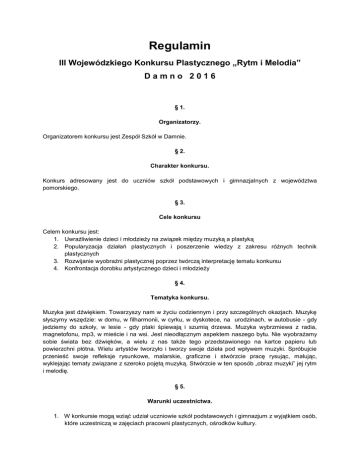 Regulamin III Wojewódzkiego Konkursu Plastycznego „Rytm i Melodia” Damno 2016 § 1. Organizatorzy. Organizatorem konkursu jest Zespół Szkół w Damnie. § 2. Charakter konkursu. Konkurs adresowany jest do uczniów szkół podstawowych i gimnazjalnych z województwa pomorskiego. § 3. Cele konkursu Celem konkursu jest: 1. Uwrażliwienie dzieci i młodzieży na związek między muzyką a plastyką 2. Popularyzacja działań plastycznych i poszerzenie wiedzy z zakresu różnych technik plastycznych 3. Rozwijanie wyobraźni plastycznej poprzez twórczą interpretację tematu konkursu 4. Konfrontacja dorobku artystycznego dzieci i młodzieży § 4. Tematyka konkursu. Muzyka jest dźwiękiem. Towarzyszy nam w życiu codziennym i przy szczególnych okazjach. Muzykę słyszymy wszędzie: w domu, w filharmonii, w cyrku, w dyskotece, na urodzinach, w autobusie - gdy jedziemy do szkoły, w lesie - gdy ptaki śpiewają i szumią drzewa. Muzyka wybrzmiewa z radia, magnetofonu, mp3, w mieście i na wsi. Jest nieodłącznym aspektem naszego bytu. Nie wyobrażamy sobie świata bez dźwięków, a wielu z nas także tego przedstawionego na kartce papieru lub powierzchni płótna. Wielu artystów tworzyło i tworzy swoje dzieła pod wpływem muzyki. Spróbujcie przenieść swoje refleksje rysunkowe, malarskie, graficzne i stwórzcie pracę rysując, malując, wyklejając tematy związane z szeroko pojętą muzyką. Stwórzcie w ten sposób „obraz muzyki” jej rytm i melodię. § 5. Warunki uczestnictwa. 1. W konkursie mogą wziąć udział uczniowie szkół podstawowych i gimnazjum z wyjątkiem osób, które uczestniczą w zajęciach pracowni plastycznych, ośrodków kultury. 2. 3. 4. 5. 6. 7. 8. 9. 10. 11. 12. 13. 14. 15. 16. 17. Uczestnicy będą oceniani w trzech grupach wiekowych: Klasy 1 -3 szkoły podstawowej Klasy 4 – 6 szkoły podstawowej Klasy I – III gimnazjum W przypadku, gdy uczestnik startuje w niewłaściwej kategorii wynik będzie uznany za nieważny. Udział w konkursie jest bezpłatny. Warunkiem uczestnictwa w konkursie jest dostarczenie karty zgłoszenia pracy oraz co najmniej jednej pracy plastycznej, która musi być pracą własną, nigdzie wcześniej niepublikowaną, nieprzedstawianą w innych konkursach. Nadesłanie pracy na konkurs jest równoznaczne ze złożeniem deklaracji o tych faktach. Jeden uczestnik konkursu może dostarczyć tylko jedną pracę plastyczną. Prace mogą być wykonane dowolną techniką plastyczną: rysunek (wykonany czarnym tuszem, kredkami różnego typu, węglem lub pastelami), malarstwo, grafika (z wyłączeniem grafiki komputerowej). Prace należy wykonać w formacie A-3 i zabezpieczyć przed zniszczeniem w trakcie przesyłki pocztowej. Prosimy nie oprawiać i nie rolować rysunków. Do każdej pracy powinien zostać dołączony opis. Opis pracy naklejony na odwrocie pracy i wykonany według wzoru w załączniku nr 1 do regulaminu. Uczniowie, nauczyciele i opiekunowie biorący udział w konkursie oraz ceremonii wręczenia nagród wyrażają zgodę na zamieszczenie przez organizatorów zdjęć, wideo oraz reportaży na stronie internetowej. Prace zgłoszone do konkursu nie będą zwracane autorom. Prace nie spełniające zasad uczestnictwa nie będą brane pod uwagę przez Komisję konkursową. Organizatorzy nie odpowiadają za zniszczenie prac w trakcie przesyłki pocztowej. Regulamin konkursu i informacje z nim związane jest dostępny na stronie www.zsdamno.pl w zakładce konkursy Rytm i Melodia Konkurs plastyczny. Organizator konkursu zachowuje prawo do aktualizacji regulaminu. Informacja o dokonanych zmianach zostanie zamieszczona na naszej stronie internetowej. Przyjmuje się, że uczestnicy, biorący udział w konkursie zapoznali się z regulaminem i go akceptują. Sytuacje nieobjęte niniejszym regulaminem rozstrzyga organizator. § 6. Termin i adres nadsyłania prac. Prace konkursowe (maksymalnie 3 prace z każdej kategorii wiekowej z jednej placówki) wraz z kartą zgłoszenia należy nadsyłać w terminie do 03 marca 2016r. (decyduje data stempla pocztowego) na adres: Zespół Szkół w Damnie, Damno 42, 76-231 Damnica dopiskiem: Konkurs Plastyczny „Rytm i Melodia”. § 7. Jury. 1. Prace oceni Jury powołane przez organizatora. 2. Decyzje Jury są ostateczne i nieodwołalne. 3. Komisja Jury sporządza z obrad protokół. § 8. Termin rozstrzygnięcia. 1. Wyniki Konkursu opublikowane zostaną na stronie internetowej Zespołu Szkół w Damnie do 12.03.2016r. 2. Wręczenie nagród nastąpi 19 marca 2016r. o godzinie 10.00 w Zespole Szkół w Damnie połączone z wystawą pokonkursową, podczas Wojewódzkiego Konkursu Piosenki „Rytm i Melodia”. 3. Organizator nie zwraca kosztów podróży. § 9. Warunki odbioru nagród i wyróżnień. 1. Nagrody i wyróżnienia należy odebrać osobiście podczas rozstrzygnięcia Konkursu. 2. W przypadku nieodebrania nagrody, po upływie 7 dni od uroczystości wręczenia, może być ona wysłana wyłącznie po uprzednim powiadomieniu organizatora na koszt odbiorcy. …………………………………………. Pieczątka szkoły zgłaszającej ………………………………………………………. miejscowość i data wypełnienia III Wojewódzki Konkurs Plastyczny „Rytm i Melodia” KARTA ZGŁOSZENIA PRAC PLASTYCZNYCH Szkoła zgłaszająca (nazwa, adres, telefon, e – mail): …………………………………………………………………………………………………….……………………………………………………… Lp. Imię i nazwisko autora Kategoria SP 1-3; SP 4-6; Gimnazjum 1. 2. 3. 4. 5. 6. 7. 8. 9. Imię i nazwisko oraz numer telefonu opiekuna: ……………………………………………………………………………. UWAGA: W przypadku wypełniania zgłoszenia ręcznie, prosimy o uzupełnienie karty wielkimi literami. …………………………………………………………..… Pieczątka i podpis dyrektora sz