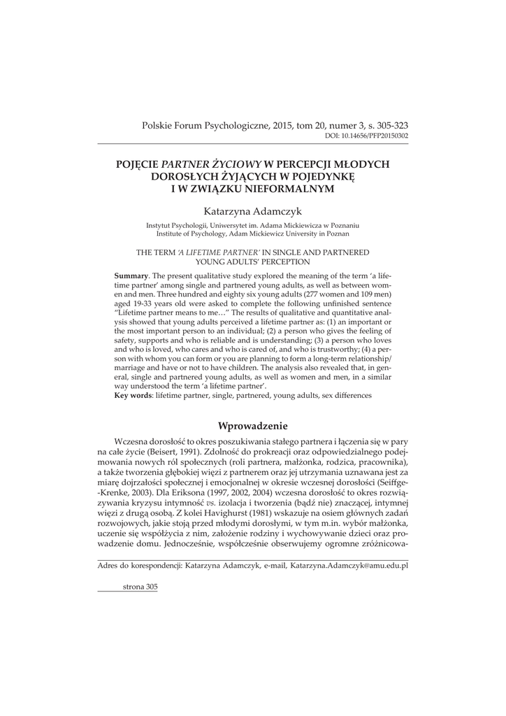 Polskie Forum Psychologiczne, 2015, tom 20, numer 3, s. 305-323 DZȱŗŖǯŗŚŜśŜȦŘŖŗśŖřŖŘ 9ȱȱ ȱȱȱR ȱ R ȱ & ȱȱ9ȱ ȱȱ&ȱ Katarzyna Adamczyk Instytut Psychologii, Uniwersytet im. Adama Mickiewicza w Poznaniu Institute of Psychology, Adam Mickiewicz University in Poznan THE TERM ȁȱȱȂ IN SINGLE AND PARTNERED YOUNG ADULTS’ PERCEPTION Summaryǯȱȱȱȱ¢ȱ¡ȱȱȱȱȱȱȁȱȱȂȱȱȱȱȱ¢ȱǰȱȱ ȱȱ ȱ ȱȱǯȱȱȱȱ¢ȱ¡ȱ¢ȱȱǻŘŝŝȱ ȱȱŗŖşȱǼȱ ȱ ŗşȬřřȱ ¢ȱ ȱ ȱ ȱ ȱ ȱ ȱ ȱ ęȱ ȱ ȃȱȱȱȱdzȄȱȱȱȱȱȱȱ¢ȱ ȱȱ¢ȱȱȱȱȱȱDZȱǻŗǼȱȱȱȱ ȱȱȱȱȱȱDzȱǻŘǼȱȱȱ ȱȱȱȱȱ ¢ǰȱȱȱ ȱȱȱȱȱDzȱǻřǼȱȱȱ ȱȱ ȱ ȱȱǰȱ ȱȱȱ ȱȱȱǰȱȱ ȱȱ ¢DzȱǻŚǼȱȱȱ ȱ ȱ¢ȱȱȱȱ¢ȱȱȱȱȱȱȬȱȦ marriage and have or not to have children. The analysis also revealed that, in general, single and partnered young adults, as well as women and men, in a similar ¢ȱȱȱȱȁȱȱȂǯȱ Key wordsDZȱȱǰȱǰȱǰȱ¢ȱǰȱ¡ȱěȱ Wprowadzenie £ȱÙï°ȱȱȱ£ ȱÙȱȱȱÙ£ȱ¿ȱ ȱ¢ȱ ȱÙȱČ¢ȱǻǰȱŗşşŗǼǯȱï°ȱȱȱ£ȱ £ȱ ȱ ¢ȱàȱÙ£¢ȱǻȱǰȱÙČǰȱ£ǰȱ Ǽǰȱ ȱČȱ £ȱÙ¿ȱ ¿£ȱ£ȱȱ£ȱȱ£¢ȱ£ ȱȱ£ȱ ¿ȱ£ÙïȱÙ£ȱȱȱ ȱȱ £ȱÙïȱǻěȬǰȱŘŖŖřǼǯȱȱȱǻŗşşŝǰȱŘŖŖŘǰȱŘŖŖŚǼȱ £ȱÙï°ȱȱȱ£ £¢ ȱ¢£¢ȱ¢ï°ȱǯȱ£ȱȱ £ȱǻĊȱǼȱ££ǰȱ¢ȱ ¿£ȱ£ȱȱǯȱȱȱ ȱǻŗşŞŗǼȱ £ȱȱȱÙà ¢ȱ£Úȱ £ ¢ǰȱȱȱ£ȱÙ¢ȱÙ¢ǰȱ ȱ¢ȱǯǯȱ ¢àȱÙČǰȱ £ȱ¿ȱ àÙČ¢ȱ£ȱǰȱ£ÙČȱ£¢ȱȱ ¢ ¢ ȱ£ȱ£ȱ £ȱ ǯȱ £ïǰȱ àÙ£ïȱ ¢ȱ ȱ £àČ ȱȱDZȱ£¢ȱ£¢ǰȱ Ȭǰȱ £¢ǯ£¢ȓǯǯ strona 305 ȱȱ£¢ £ ȱïČȱČ¢ ¢ȱ ȱȱ £ȱÙïȱǻ££ÚȱȱǯǰȱŘŖŗŗǼǰȱàȱ¢£¢ȱČȱČ¢ȱÙČÚȱȱ£ȱǻǯȱČ¢ȱ ȱ¢¿ǰȱǰȱï°ǰȱ£ £ȱȱȮȱǯȱ¢ǰȱ ŘŖŖŜDzȱ ǰȱ Ġǰȱ ŘŖŖŞǼǯȱ ȱ ȱ ȱ £¢Ùȱ ȱ ȱ ȱ ȱ ȱ £¢ȱȱǰȱ ȱ¢ȱȱ ȱǰȱ£ȱàȱČ¢¢ȱ ȱ¢¿ȱȱ ïȱ ǻǰȱ Ġǰȱ ŘŖŗŖDzȱ ¢ȱ ę£ȱ ǯȱ ȱ £ ȱ ¢ȱ ï ǰȱ ŘŖŗŘǼǯȱ ǰȱ £ȱ ¿£ȱ ££ȱ ȱ Č¢ȱ Ù¢ȱ Ù¢ȱ ȱ £ £ȱ ¢£ȱ ȱ £ȱ ÙČÚȱ ǻǰȱĴǰȱŘŖŗŖǼǯȱ £ï°ȱČ¢ȱÙČÚȱȱ£ȱ £ȱ£ȱȱ£ȱàȱ Č¢¢ȱ ȱ¢¿ȱÙȱȱ¿ȱÚȱȱ££ȱ¿ȱȱČ¢Ȭ ¢ȱ ïàȱÙ¢ȱÙ¢ oraz ïǰȱ£¢ȱ¿ȱȱČȱ¢°ȱȱ £ȱ££ȱÙ¢ȱÙ¢ȱČ¢¢ȱ ȱ£ £ȱ¢ȱȱČ¢¢ȱ ȱ¢¿ǯȱČȱ ȱ£¢££°ǰȱČȱàČȱï £ȱ ȱ£ȱ ¢£¢ȱǰȱȱ¿ȱ àÙȱȱǯȱȱȱČ¢ ǰȱȱ¢°ȱ £ȱ£ȱàČȱ ȱ£ȱ¿ȱȱČ¢ ¢ǯ ȱ¢ȱȱ ȱČ¢ȱÙ£ȱ ȱ£Ù¿ȱȱ¿ȱÚȱȱ££ȱ¿ȱȱČ¢ ¢ǰȱȱČȱ£ȱ¢ǰȱ à¢ȱ ǰȱ Čȱ ¿ȱ ȱ Č¢ ¢ (ang. ȱ Ǽǰȱ °ȱ £ȱ ȱ ȱȱȱ¿£¢£¢ȱ ȱ£ȱ£ȱȱÙ£¢ǰȱ ȱȱ£ȱ ȱàȱ¢¢ǰȱ£¿ïȱ£ȱïȱ¢¢£ȱȱȱïǯȱȱȱ£ȱȱïȱ ȱ£ȱ £ǰȱ£¢ȱ ȱȱǰȱ£¢ȱČȱȱȱȱïȱȱČ¢ ¢ǯȱȱȱ £ȱ ȱ ȱ ¢ȱ ¢£ȱ £ȱ ȱ £ȱ £ ȱ ęǰȱ àȱ¢£ Ù¢ȱȱ Ùȱ ££ïȱ£ȱïȱ ȱï ¢ȱ ¢£ȱ¿ȱȱČ¢ ¢ǯȱȱ£ £ȱ£ȱ¢ǰȱ ȱ£ ¢ȱȱ ȱ ȱ Ùà ȱ ȱ £DZȱ ǻŗǼȱ ïȱ ȱ £ȱ ¿ȱȱČ¢ ¢ȱ£ȱǻŘǼ ïȱÙ£ȱ£ȱ¿ȱpartner Č¢ ¢ȱ ïàȱÙ¢ȱÙ¢ǯȱ ǰȱȱÚȱ£¢ȱà ȱ£ȱ¿ȱȱČ¢ ¢ȱ££ȱÙ¢ȱÙ¢ȱČ¢¢ȱ ȱ¢¿ȱȱ ȱ£ £ȱ¢ȱ£ȱ££ȱ¢ȱȱ¿Č£¢£ǯȱ£ï°ȱ £¿ȱÙȱ ȱ£¢ȱ ȱ ¢ȱ£ȱ¢ȱàČȱÙ ¢ȱ ȱ£ȱ¢¢ȱȱ£ȱ¢ȱÙ£¢ȱ£ Úȱȱȱ ȱ££ȱ¢ȱȱ¿Č£¢£ȱàȱÙČÚȱȱ£ȱǻǰȱ ŘŖŖŗDzȱǰȱŘŖŖŘǼǯȱȱȱ£ȱ¢ȱ¢¢ȱęȱ¿ȱ ȱȱ ȱ ȱ £ȱ ¢ȱ Ċǰȱ ïàȱ à¢ȱ ¿£ȱ ££ȱ £¢ȱ ¿ȱ ÙČÚ ȱǻǰȱŘŖŖŚǼǯȱȱ¿Č£¢£ȱȱȱ ¢ȱ¿ȱȱȱ ȱǰȱ£ȱȱ¢ȱ£ ȱȱ£ ȱ¢ȱ£ȱǻǰȱ ŘŖŖŘǼǯȱ ȱ £ȱ £ǰȱ £ȱ £¢ ȱ ȱ ¿£ȱ ȱ ¿Č£¢£ȱ ȱȱ¿ȱȱÙȱȱȱȱǻǰȱŘŖŖŘǼǰȱȱ ǰȱČȱ¢ȱ£ȱ Čȱ¿Č£¢Ċȱ ȱ ȱ¢£ȱ£ £ȱǻǰȱŘŖŖŝǼǯȱȱï ȱ¢ȱ ȱ£ȱ ¢ȱ¿ȱ£ȱ£¢££ǰȱČȱ¢ȱȱ¿Č£¢Ċȱȱ ȱ¢ȱàȱ£°ȱ¿ȱȱČ¢ ¢. strona 306 £ ȱ1ȱ Ù¢ȱǻŗǼȱ£ȱ¢ȱ£ȱǻŘǼȱ¢ȱ ȱ ȱ £ȱ Úȱ ï ¢ǯȱ £ȱ ¢ǰȱ °ȱ ¢£¢Ùȱ££ȱȱï ¿¢ȱ¢Ù£ȱȱ£ ȱȱ£ȱ ȱ£¢ £ȱ ȱÙïǰȱ ÙȱČȱÙ ȱȱ¢ȱ£ȱ£ȱ ¢ȱ £ȱ ȱ £¢ȱ ȱ ÙČÚ ǯȱ £ £ȱ £¢ȱ Ù¢ȱ£ȱ ¿ȱȱÙ ȱ Ùȱęȱ¿ȱpartner Č¢ ¢. ¿ȱȱČ¢ ¢ȱ ȱ¿ȱÙ ¢ȱ £ȱ¢ȱ¢£ȱ£Ùȱ££¢ȱ£ȱÙ à ȱ ȱ¢ȱ£ȱ£ȱ¢ȱ£ȱȱ£¢ȱȱÙČÚ ǯȱ¢ȱ £¢ȱ¢ȱȱ£ȱÙ ¢ȱȱ¢¢£¢ȱ£ȱȱŗǯȱ ȱŗǯȱÙ ȱ¿ȱ¿ȱȦ Ù ęȱ Ù ȱ ¢£à ȱ¢ ǻŗşŞŖǰȱŗşşśǼȱ Ù ȱ ¢£à ȱ¢ ǻŘŖŖŗǼȱ Ù ȱ¿£¢ȱȱ ǻŗşŝşǼ Partner ȱ àÙ£ȱ¢ǰȱ£ ¢ǰȱ£ ¢ȱǯǰȱ towarzysz, wspólnik Partner ȱ àǰȱ àÙ£ȱ£ïǰȱ àÙ£wodnik Partner ȱ àÙ£ȱ¢ǰȱ£ ¢ǰȱ£ ¢ȱǯǰȱ £¢£ǰȱ àDz cȱȱČ¢ ¢ȱǀ àÙÙČǁ Ù ȱ àÙ£ȱ Partnerȱȱǰȱ£ȱàȱ¿ȱïȱ£ȱǰȱ£ȱàȱ£ȱ ¿£¢ȱȱǻŘŖŖŖǼ ¿ȱ ȱ£¢ïȱ£ÙȱǯDzȱǰȱ£ȱàȱ¿ȱ àÙČ¢Dzȱ ǰȱȱ£¢Ùȱę ǰȱȱ ȱÙ ȱ ¢£à ȱ Partner (Č¢ ¢Ǽ eȱÙȱǯ efpartnerka cȱ¿Č££¢ȱǻŘŖŖŝǼ czyzna dȱǰȱǰȱČǰȱ££¢ǰȱ¢tia, ukochany ȱ(Č¢ Ǽ eȱǯǰȱȱǻ£¢ïǼȱǯǰȱ ȱǯ ef partner cȱ¿Č£¢£ȱd kochanka, konǰȱ££ǰȱ¢ǰȱǰȱČȱ àÙDZȱ ȱ Ùȱȱ ȱÙ à ȱ ¢¢ȱ ȱȱ ïȱ£à DZȱ eȱ¢¢ȱǻ ¢£¢ȱà ££Ǽȱȱ ef¢ȱǻ ¢£¢ȱȱ££ȱ£ ¢Ǽ ¢ȱǻ ¢£¢ȱȱ££ȱ࣢Ǽ c dȱ¢ȱǻ ¢£¢ȱȱ££ȱ££àÙ £¢Ǽ 1 ȱ ¢ȱ Úȱ ££ ȱ ȱ ¢ȱ ȱ £¿ï°ȱ Úȱ £ ¢ȱ ȱ£ ȱȱDZȱ ȱȱȱČ¢ ȱ ȱȱ £ȱȬ Ùïȱȱȱȱǯȱȱȱǯȱ¢ȱ ȬÙ¢ȱȱȱ w roku 2010 w Instytucie Psychologii UAM. strona 307 ȱŗȱ£ȱ¢ȱęȱ¿ȱpartnerȱ£ ȱ ȱÙ ȱ¿£¢ȱ ǰȱ Čȱ ȱ Ù ȱ ¢£¢ȱ ȱ £¢ȱ ȱ ¿ȱ ¿ȱȦǯȱïàȱ£¢ȱęȱÙ ¢ȱČ£¢ȱ¢ȱ£ ȱ¢ȱȱ£ȱȱȱǮ £¢£ȄǰȱȱǮ¢ǰȱ£ȱàȱ¿ȱïȱ£ȱǰȱ£ȱàȱ£ȱ¿ȱ ȱ£¢ïȱ£ÙȄǰȱ Ǯ¢ǰȱ £ȱ àȱ ¿ȱ àÙČ¢ȄDzȱ ǮȄǰȱ ǮȄǰȱ Ǯ¿ČȄǰȱ Ǯ££ȄǰȱǮ¢ȄǰȱǮȄǯȱ¿ȱȱ ¢¿ȱȱ ȱïȱȱà ǰȱȱǮȄǰȱǮȄǰȱǮ££ȄǰȱǮ¢Ȅǰȱ