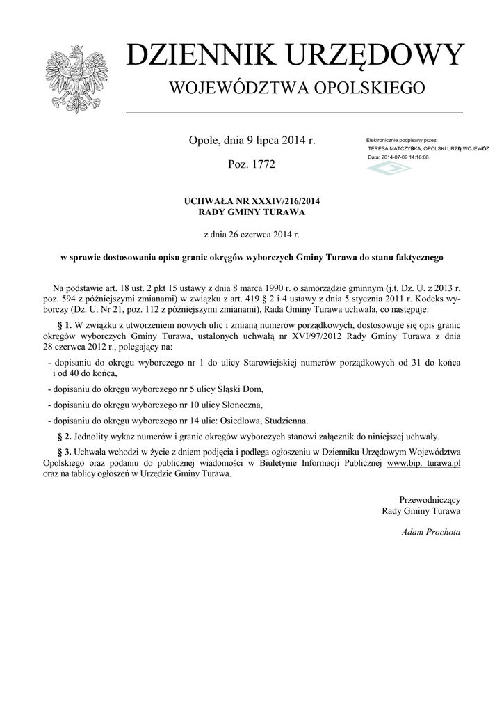 DZIENNIK URZĘDOWY WOJEWÓDZTWA OPOLSKIEGO Opole, dnia 9 lipca 2014 r. Elektronicznie podpisany przez: TERESA MATCZYŃSKA; OPOLSKI URZĄD WOJEWÓDZKI Poz. 1772 Data: 2014-07-09 14:16:08 UCHWAŁA NR XXXIV/216/2014 RADY GMINY TURAWA z dnia 26 czerwca 2014 r. w sprawie dostosowania opisu granic okręgów wyborczych Gminy Turawa do stanu faktycznego Na podstawie art. 18 ust. 2 pkt 15 ustawy z dnia 8 marca 1990 r. o samorządzie gminnym (j.t. Dz. U. z 2013 r. poz. 594 z późniejszymi zmianami) w związku z art. 419 § 2 i 4 ustawy z dnia 5 stycznia 2011 r. Kodeks wyborczy (Dz. U. Nr 21, poz. 112 z późniejszymi zmianami), Rada Gminy Turawa uchwala, co następuje: § 1. W związku z utworzeniem nowych ulic i zmianą numerów porządkowych, dostosowuje się opis granic okręgów wyborczych Gminy Turawa, ustalonych uchwałą nr XVI/97/2012 Rady Gminy Turawa z dnia 28 czerwca 2012 r., polegający na: - dopisaniu do okręgu wyborczego nr 1 do ulicy Starowiejskiej numerów porządkowych od 31 do końca i od 40 do końca, - dopisaniu do okręgu wyborczego nr 5 ulicy Śląski Dom, - dopisaniu do okręgu wyborczego nr 10 ulicy Słoneczna, - dopisaniu do okręgu wyborczego nr 14 ulic: Osiedlowa, Studzienna. § 2. Jednolity wykaz numerów i granic okręgów wyborczych stanowi załącznik do niniejszej uchwały. § 3. Uchwała wchodzi w życie z dniem podjęcia i podlega ogłoszeniu w Dzienniku Urzędowym Województwa Opolskiego oraz podaniu do publicznej wiadomości w Biuletynie Informacji Publicznej www.bip. turawa.pl oraz na tablicy ogłoszeń w Urzędzie Gminy Turawa. Przewodniczący Rady Gminy Turawa Adam Prochota Dziennik Urzędowy Województwa Opolskiego –2– Poz. 1772 Załącznik do uchwały nr XXXIV/216/2014 Rady Gminy Turawa z dnia 26 czerwca 2014 r. Podział Gminy Turawa na okręgi wyborcze Numer okręgu wyborczego Granice okręgu Liczba radnych wybieranych w okręgu 1 Sołectwo Bierdzany ulice: Dębowa, Laskowska, Leśna, Opolska od 19 do końca i od 46 do końca, Starowiejska od 31 do końca i od 40 do końca, Stawowa, Szkolna numery nieparzyste 1 2 Sołectwo Bierdzany ulice: Boiskowa, Krótka, Nadleśna, Opolska od 1 do 17 i od 2 do 44, Polna, Prosta, Starowiejska od 1 do 29 A i od 2 do 38, Szkolna numery parzyste 1 3 Sołectwa: Kadłub Turawski, Rrzędów 1 4 Sołectwo Kotórz Mały ulice: Akacjowa, Boczna, Boiskowa, Brzozowa, Cicha, Dębowa, Klonowa, Kolejowa, Krótka, Kwiatowa, Lipowa, Ogrodowa, Opolska od 35 do końca i numery parzyste, Pod Borem, Pogodna, Słoneczna, Sosnowa, Spacerowa, Szkolna, Świerkowa, Węgierska, Wiosenna, Wodna 1 5 Sołectwa: Kotórz Wielki, Kotórz Mały ulice: 1 Maja, Opolska od 1 do 33, Polna, Śląski Dom, Zielona 1 6 Sołectwo Ligota Turawska 1 7 Sołectwo Osowiec ulice: Dworcowa, Fabryczna, Leśna, Lipowa numery 2, 8 i 12, Zielona, Przysiółek Trzęsina 1 8 Sołectwo Osowiec ulice: Cmentarna, Lipowa z wyłączeniem numerów 2, 8 i 12, Obwodnica, Ogrodowa, Oleska 1 9 Sołectwo Węgry ulice: 700 Lecia, Kotorska, Leśna, Milenijna, Młyńska, Nowa, Opolska numery nieparzyste, Pogodna, Pustkowska 1 10 Sołectwo Węgry ulice: Kolanowska, Opolska numery parzyste, Osiedle, Słoneczna, Spokojna, Szkolna, Średnia 1 11 Sołectwo Turawa ulica: Opolska od 44 do końca i od 35 do końca, Przysiółek Marszałki 1 12 Sołectwo Turawa ulice: Aleja Amurowa, Aleja Błękitna, Aleja Karpiowa, Aleja Mokra, Aleja na Górce, Aleja Okoniowa, Aleja pod Wałem, Aleja Sandaczowa, Aleja Słoneczna, Aleja Sucha, Aleja Szczupakowa, Aleja Turystyczna, Aleja Wypoczynkowa, Biwakowa, Boczna, Borowikowa, Cicha, Energetyczna, Grzybowa, Harcerska, Iwaszkiewicza, Jagodowa, Kościuszki, Krótka, Leśna, Muchomorowa, Nowa, Ogrodowa, Opieńkowa, Opolska od 1 do 33 i od 2 do 42, Pieczarkowa, Plac von Garnier, Planetorza, Pływacka, Pod Lasem, Pogodna, Promenada, Prosta, Rzeczna, Spacerowa, Spokojna, Stawowa, Strażacka, Średnia, Wędkarska, Wodna, Żeglarska, Żużlowa 1 13 Sołectwo Zakrzów Turawski 1 14 Sołectwo Zawada ulice: Brzegowa, Dębowa, Dolna, Jesionowa, Kasztanowa, Kępska, Klonowa, Leśna, Oleska od 1 do 43 i od 2 do 28, Orzechowa, Osiedlowa, Rzeczna, Słoneczna, Studzienna, Średnia, Wodociągowa, Zielona 1 15 Sołectwo Zawada ulice: Bocianowa, Brzozowa, Kolanowska, Krótka, Luboszycka, Nowa, Oleska od 30 do końca i od 45 do końca, Piaskowa, Polna, Poprzeczna, Skośna, Szkolna, Turawska 1