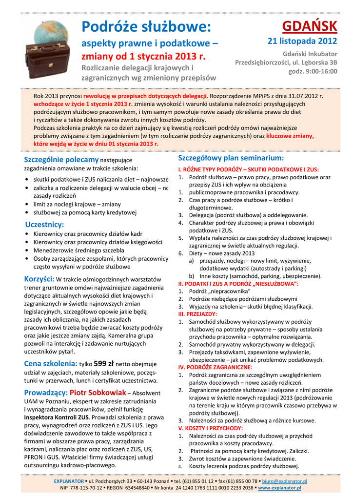Podróże służbowe: aspekty prawne i podatkowe – zmiany od 1 stycznia 2013 r. Rozliczanie delegacji krajowych i zagranicznych wg zmieniony przepisów GDAŃSK 21 listopada 2012 Gdański Inkubator Przedsiębiorczości, ul. Lęborska 3B godz. 9:00-16:00 Rok 2013 przynosi rewolucję w przepisach dotyczących delegacji. Rozporządzenie MPiPS z dnia 31.07.2012 r. wchodzące w życie 1 stycznia 2013 r. zmienia wysokość i warunki ustalania należności przysługujących podróżującym służbowo pracownikom, i tym samym powołuje nowe zasady określania prawa do diet i ryczałtów a także dokonywania zwrotu innych kosztów podróży. Podczas szkolenia praktyk na co dzień zajmujący się kwestią rozliczeń podróży omówi najważniejsze problemy związane z tym zagadnieniem (w tym rozliczanie podróży zagranicznych) oraz kluczowe zmiany, które wejdą w życie w dniu 01 stycznia 2013 r. Szczególnie polecamy następujące Szczegółowy plan seminarium: zagadnienia omawiane w trakcie szkolenia: I. RÓŻNE TYPY PODRÓŻY – SKUTKI PODATKOWE I ZUS: 1. Podróż służbowa – prawo pracy, prawo podatkowe oraz • skutki podatkowe i ZUS naliczania diet – najnowsze zasady przepisy ZUS i ich wpływ na obciążenia • zaliczka a rozliczenie delegacji w walucie obcej – nowe 1. publicznoprawne pracownika i pracodawcy. zasady rozliczeń 2. Czas pracy a podróże służbowe – krótko i • limit za noclegi krajowe – zmiany długoterminowe. • służbowej za pomocą karty kredytowej 3. Delegacja (podróż służbowa) a oddelegowanie. 4. Charakter podróży służbowej a prawa i obowiązki Uczestnicy: podatkowe i ZUS. • Kierownicy oraz pracownicy działów kadr 5. Wypłata należności za czas podróży służbowej krajowej i • Kierownicy oraz pracownicy działów księgowości zagranicznej w świetle aktualnych regulacji. • Menedżerowie średniego szczebla 6. Diety – nowe zasady 2013 • Osoby zarządzające zespołami, których pracownicy są a) przejazdy, noclegi – nowy limit, wyżywienie, często wysyłani w podróże służbowe dodatkowe wydatki (autostrady i parkingi) b) Inne koszty (samochód, parking, ubezpieczenie). Korzyści: W trakcie ośmiogodzinnych warsztatów II. PODATKI I ZUS A PODRÓŻ „NIESŁUŻBOWA”: trener gruntownie omówi najważniejsze zagadnienia 1. Podróż „niepracownika” dotyczące aktualnych wysokości diet krajowych i 2. Podróże niebędące podróżami służbowymi zagranicznych w świetle najnowszych zmian 3. Wyjazdy na szkolenia– skutki błędnej klasyfikacji. legislacyjnych, szczegółowo opowie jakie będą III. PRZEJAZDY: zasady ich obliczania, na jakich zasadach 1. Samochód służbowy wykorzystywany w podróży pracownikowi trzeba będzie zwracać koszty podróży służbowej na potrzeby prywatne – sposoby ustalania oraz jakie jeszcze zmiany zajdą. Kameralna grupa przychodu pracownika – optymalne rozwiązania. pozwoli na interakcję i zadawanie nurtujących 2. Samochód prywatny wykorzystywany w delegacji. uczestników pytań. 3. Przejazdy taksówkami, zapewnione wyżywienie, ubezpieczenie – jak unikać problemów podatkowych. Cena szkolenia: tylko 599 zł netto obejmuje IV. PODRÓŻE ZAGRANICZNE: udział w zajęciach, materiały szkoleniowe, poczęs1. Podróż zagraniczna ze szczególnym uwzględnieniem tunki w przerwach, lunch i certyfikat uczestnictwa. państw docelowych – nowe zasady rozliczeń. 2. Zagraniczne podróże służbowe i związane z nimi podróże Prowadzący: Piotr Sobkowiak – Absolwent krajowe w świetle nowych regulacji 2013 (podróżowanie UAM w Poznaniu, ekspert w zakresie zatrudniania na terenie kraju w którym pracownik czasowo przebywa w i wynagradzania pracowników, pełnił funkcję podróży służbowej). Inspektora Kontroli ZUS. Prowadzi szkolenia z prawa 3. Należności za podróż służbową a różnice kursowe. pracy, wynagrodzeń oraz rozliczeń z ZUS i US. Jego V. KOSZTY I PRZYCHODY: doświadczenie zawodowe to także współpraca z 1. Należności za czas podróży służbowej a przychód firmami w obszarze prawa pracy, zarządzania pracownika a koszty pracodawcy. kadrami, naliczania płac oraz rozliczeń z ZUS, US, 2. Płatności za pomocą karty kredytowej. Zaliczki. PFRON i GUS. Właściciel firmy świadczącej usługi 3. Zwrot kosztów a zapewnione świadczenie. outsourcingu kadrowo-płacowego. 4. Koszty leczenia podczas podróży służbowej. EXPLANATOR ul. Podchorążych 33 60-143 Poznań tel. (61) 855 01 12 fax (61) 855 00 78 [email protected] NIP 778-115-70-12 REGON 634548840 Nr konta 24 1240 1763 1111 0010 2233 2038 www.explanator.pl Umowa zgłoszenie uczestnictwa Niniejszym zgłaszamy udział następujących osób w szkoleniu: Czytelnie wypełnione zgłoszenie prosimy przesłać faksem na nr: (61) 855 00 78 Podróże służbowe: aspekty prawne i podatkowe – zmiany od 1 stycznia 2013 GDAŃSK, 21 listopada 2012 1. …………………………………………………………….. e-mail ………………………..…………………………………….. 2. …………………………………………………………….. e-mail ………………………..…………………………………….. 3. …………………………………………………………..… e-mail ………………………..…………………………………….. Nazwa firmy …………………………………………………………………………………..…………………………………….. …………………………………………………………………… NIP …………………..……………………………………..…….. Kod pocztowy ……………….….………… Miejscowość ………………………………………..……………….………. Adres …………………………………………………………….……………………………………………………………………… ……