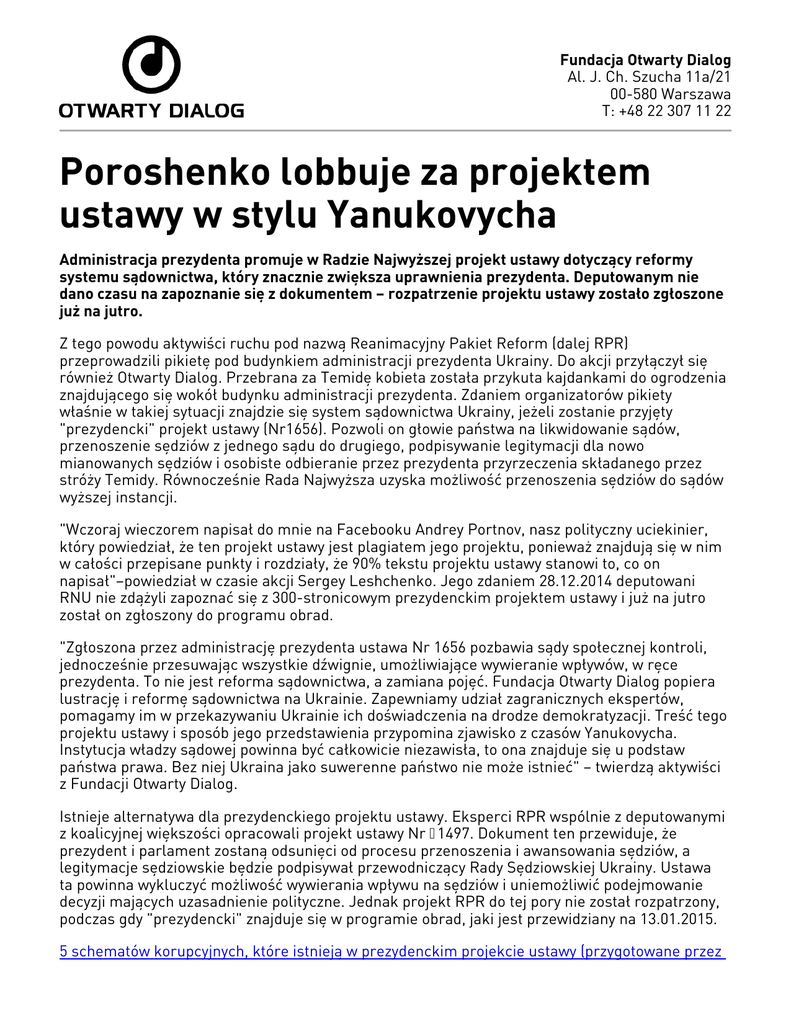 Fundacja Otwarty Dialog Al. J. Ch. Szucha 11a/21 00-580 Warszawa T: +48 22 307 11 22 Poroshenko lobbuje za projektem ustawy w stylu Yanukovycha Administracja prezydenta promuje w Radzie Najwyższej projekt ustawy dotyczący reformy systemu sądownictwa, który znacznie zwiększa uprawnienia prezydenta. Deputowanym nie dano czasu na zapoznanie się z dokumentem – rozpatrzenie projektu ustawy zostało zgłoszone już na jutro. Z tego powodu aktywiści ruchu pod nazwą Reanimacyjny Pakiet Reform (dalej RPR) przeprowadzili pikietę pod budynkiem administracji prezydenta Ukrainy. Do akcji przyłączył się również Otwarty Dialog. Przebrana za Temidę kobieta została przykuta kajdankami do ogrodzenia znajdującego się wokół budynku administracji prezydenta. Zdaniem organizatorów pikiety właśnie w takiej sytuacji znajdzie się system sądownictwa Ukrainy, jeżeli zostanie przyjęty "prezydencki" projekt ustawy (Nr1656). Pozwoli on głowie państwa na likwidowanie sądów, przenoszenie sędziów z jednego sądu do drugiego, podpisywanie legitymacji dla nowo mianowanych sędziów i osobiste odbieranie przez prezydenta przyrzeczenia składanego przez stróży Temidy. Równocześnie Rada Najwyższa uzyska możliwość przenoszenia sędziów do sądów wyższej instancji. "Wczoraj wieczorem napisał do mnie na Facebooku Andrey Portnov, nasz polityczny uciekinier, który powiedział, że ten projekt ustawy jest plagiatem jego projektu, ponieważ znajdują się w nim w całości przepisane punkty i rozdziały, że 90% tekstu projektu ustawy stanowi to, co on napisał"–powiedział w czasie akcji Sergey Leshchenko. Jego zdaniem 28.12.2014 deputowani RNU nie zdążyli zapoznać się z 300-stronicowym prezydenckim projektem ustawy i już na jutro został on zgłoszony do programu obrad. "Zgłoszona przez administrację prezydenta ustawa Nr 1656 pozbawia sądy społecznej kontroli, jednocześnie przesuwając wszystkie dźwignie, umożliwiające wywieranie wpływów, w ręce prezydenta. To nie jest reforma sądownictwa, a zamiana pojęć. Fundacja Otwarty Dialog popiera lustrację i reformę sądownictwa na Ukrainie. Zapewniamy udział zagranicznych ekspertów, pomagamy im w przekazywaniu Ukrainie ich doświadczenia na drodze demokratyzacji. Treść tego projektu ustawy i sposób jego przedstawienia przypomina zjawisko z czasów Yanukovycha. Instytucja władzy sądowej powinna być całkowicie niezawisła, to ona znajduje się u podstaw państwa prawa. Bez niej Ukraina jako suwerenne państwo nie może istnieć" – twierdzą aktywiści z Fundacji Otwarty Dialog. Istnieje alternatywa dla prezydenckiego projektu ustawy. Eksperci RPR wspólnie z deputowanymi z koalicyjnej większości opracowali projekt ustawy Nr №1497. Dokument ten przewiduje, że prezydent i parlament zostaną odsunięci od procesu przenoszenia i awansowania sędziów, a legitymacje sędziowskie będzie podpisywał przewodniczący Rady Sędziowskiej Ukrainy. Ustawa ta powinna wykluczyć możliwość wywierania wpływu na sędziów i uniemożliwić podejmowanie decyzji mających uzasadnienie polityczne. Jednak projekt RPR do tej pory nie został rozpatrzony, podczas gdy "prezydencki" znajduje się w programie obrad, jaki jest przewidziany na 13.01.2015. 5 schematów korupcyjnych, które istnieją w prezydenckim projekcie ustawy (przygotowane przez grupę RPR) Analiza porównawcza przepisów prawnych 1656 oraz 1947 (przygotowane przez grupę RPR) facebook.com/OpenDialogFoundation | [email protected] | www.odfoundation.eu