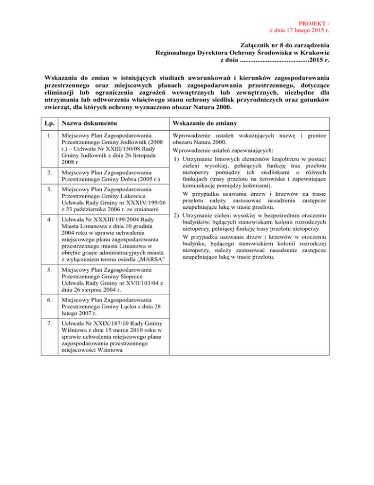 PROJEKT z dnia 17 lutego 2015 r. Załącznik nr 8 do zarządzenia Regionalnego Dyrektora Ochrony Środowiska w Krakowie z dnia ........................................2015 r. Wskazania do zmian w istniejących studiach uwarunkowań i kierunków zagospodarowania przestrzennego oraz miejscowych planach zagospodarowania przestrzennego, dotyczące eliminacji lub ograniczenia zagrożeń wewnętrznych lub zewnętrznych, niezbędne dla utrzymania lub odtworzenia właściwego stanu ochrony siedlisk przyrodniczych oraz gatunków zwierząt, dla których ochrony wyznaczono obszar Natura 2000. Lp. Nazwa dokumentu Wskazanie do zmiany 1. Miejscowy Plan Zagospodarowania Przestrzennego Gminy Jodłownik (2008 r.) – Uchwała Nr XXIII/150/08 Rady Gminy Jodłownik z dnia 26 listopada 2008 r 2. Miejscowy Plan Zagospodarowania Przestrzennego Gminy Dobra (2005 r.) 3. Miejscowy Plan Zagospodarowania Przestrzennego Gminy Łukowica Uchwała Rady Gminy nr XXXIV/199/06 z 23 października 2006 r. ze zmianami 4. Uchwała Nr XXXIII/199/2004 Rady Miasta Limanowa z dnia 10 grudnia 2004 roku w sprawie uchwalenia miejscowego planu zagospodarowania przestrzennego miasta Limanowa w obrębie granic administracyjnych miasta z wyłączeniem terenu osiedla „MARSA” Wprowadzenie ustaleń wskazujących nazwę i granice obszaru Natura 2000. Wprowadzenie ustaleń zapewniających: 1) Utrzymanie liniowych elementów krajobrazu w postaci zieleni wysokiej, pełniących funkcję tras przelotu nietoperzy pomiędzy ich siedliskami o różnych funkcjach (trasy przelotu na żerowiska i zapewniające komunikację pomiędzy koloniami). W przypadku usuwania drzew i krzewów na trasie przelotu należy zastosować nasadzenia zastępcze uzupełniające lukę w trasie przelotu. 2) Utrzymanie zieleni wysokiej w bezpośrednim otoczeniu budynków, będących stanowiskami kolonii rozrodczych nietoperzy, pełniącej funkcję trasy przelotu nietoperzy. W przypadku usuwania drzew i krzewów w otoczeniu budynku, będącego stanowiskiem kolonii rozrodczej nietoperzy, należy zastosować nasadzenie zastępcze uzupełniające lukę w trasie przelotu. 5. Miejscowy Plan Zagospodarowania Przestrzennego Gminy Słopnice Uchwała Rady Gminy nr XVII/103/04 z dnia 26 sierpnia 2004 r. 6. Miejscowy Plan Zagospodarowania Przestrzennego Gminy Łącko z dnia 28 lutego 2007 r. 7. Uchwała Nr XXIX/187/10 Rady Gminy Wiśniowa z dnia 15 marca 2010 roku w sprawie uchwalenia miejscowego planu zagospodarowania przestrzennego miejscowości Wiśniowa