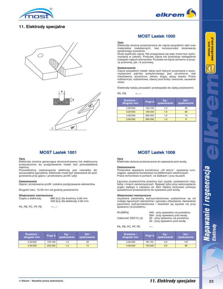 11. Elektrody specjalne MOST Lastek 1000 Opis Elektroda otulona przeznaczona do cięcia wszystkich stali oraz materiałów nieżelaznych, bez konieczności stosowania sprężonego powietrza. Duża szybkość cięcia. Nie przegrzewa się więc może być wykorzystana w całości. Podczas cięcia nie powoduje nawęglenia krawędzi ciętych elementów. Pozwala na cięcie zarówno w pozycji poziomej, jak i w pionowej. Zastosowanie Cięcie wszystkich metali, także tych których przecinane z wykorzystaniem palnika acetylenowego jest utrudnione: stal nierdzewna, aluminium, żeliwo, brązy, stopy miedzi. Prace kotłownicze, rozbiórkowe, otwory pod śruby i sworznie, usuwanie nitów. Elektrodę należy prowadzić prostopadle do ciętej powierzchni. PA, PG =–,~ Średnica / długość mm Prąd A Kg / opakowanie Szt / opakowanie 2,50/350 120-160 1,0 46 3,20/350 160-250 1,0 28 4,00/350 200-350 1,0 14 5,00/350 260-390 1,0 8 Opis Elektroda otulona generująca skoncentrowany łuk elektryczny przeznaczona do podgrzewania metali bez pozostawiania napoiny. Pozostałością zastosowania elektrody jest niewielka łatwousuwalna zgorzelina. Elektroda może być stosowana do podgrzewania przy gięciu i prostowaniu profili i płyt. Opis Elektroda otulona przeznaczona do spawania pod wodą. Zastosowanie Gięcie i prostowanie profili. Lokalne podgrzewanie elementów. Łączone powierzchnie powinny być czyste, pozbawione rdzy, farby i innych zanieczyszczeń. Spawać tylko przy wykorzystaniu prądu stałego o napięciu ok. 65V. Należy stosować uchwyty spawalnicze przeznaczone do spawania pod wodą. Długość łuku: 15-20 mm od grzanej powierzchni. Właściwości mechaniczne Ciepło z elektrody: 680 [kJ] dla średnicy 4,00 mm 430 [kJ] dla elektrody 3,20 mm PA, PB, PC, PF, PE =–,~ Zastosowanie Podwodne spawanie konstrukcji „off shore”, spawanie rurociągów, spawanie konstrukcji na platformach wiertniczych. Prace remontowe w portach, na statkach i przy śluzach. Właściwości mechaniczne Uzyskane parametry wytrzymałościowe uzależnione są od rodzaju łączonych elementów i sposobu chłodzenia. Generalnie parametry wytrzymałościowe i twardość są wyższe niż przy spawaniu na powietrzu. Rm[MPa] Udarność (ISO-V) [J] PA, PB, PC, PF, PE Średnica / długość mm Prąd A Kg / opakowanie Szt / opakowanie Średnica / długość mm 3,20/350 130-160 1,0 22 4,00/350 200-230 1,0 14 © Elkrem – Wszelkie prawa zastrzeżone. 540 - przy spawaniu na powietrzu 564 - przy spawaniu pod wodą 62 - przy spawaniu na powietrzu 32 - przy spawaniu pod wodą =– Prąd A Kg / opakowanie Szt / opakowanie 3,20/350 90-145 5,0 137 4,00/350 130-220 5,0 96 11. Elektrody specjalne Elektrody MOST Lastek 1008 Napawanie i regeneracja MOST Lastek 1001 23 MOST Lastek 1010 MOST Lastek 1900 Opis Elektroda spawalnicza przeznaczona do zgrzewania punktowego. Pozwala na zastąpienie zgrzewarek punktowych oraz innych oporowych urządzeń do zgrzewania oraz połączeń nitowych. W przypadku zgrzewania z pełnym przetopem pozwala na łączenie blach o łącznej grubości do 10 mm, a w przypadku łączenia bez pełnego przetopu grubość łączonych elementów może być większa niż 10 mm. Opis Elektroda przeznaczona do żłobienia metali (w tym stali nierdzewnych i stopów miedzi) z wykorzystaniem standardowych źródeł prądu. Nie powoduje nawęglenia żłobionej powierzchni. Stosowana we wszystkich pozycjach. Zastosowanie Przemysł chemiczny (zgrzewanie blach ze stali nierdzewnej do profili bez konieczności wiercenia otworów), prace ogólnospawalnicze (mocowanie blach, osłon itp.), przemysł samochodowy (mocowanie poszyć podłóg, dachów itp.). Zajarzyć łuk elektryczny, trzymając elektrodę prostopadle do łączonych powierzchni. Utrzymując krótki łuk, należy rozgrzać powierzchnie, a następnie „wcisnąć” elektrodę w roztopiony metal. W zależności od planowanego sposobu połączenia powierzchni (na wskroś lub bez całkowitego przetopu – co uwarunkowane jest też grubością łączonych elementów) w odpowiednim momencie cofnąć elektrodę do pozycji wyjściowej. Właściwości mechaniczne Wytrzymałość na rozciąganie Rm [N/mm²] Wytrzymałość na ścinanie [N/mm²] Wydłużenie A5 [%] 24 Zastosowanie prądu stałego z polaryzacją „-” na elektrodzie przyspiesza żłobienie, lecz możliwe jest stosowanie prądu przemiennego. Elektroda powinna być prowadzona pod kątem 6-20° do żłobionej powierzchni (mniejszy kąt i większy prąd pozwala na szybsze żłobienie i uzyskanie bardziej czystej powierzchni po żłobieniu). PA, PB, PC, PF, PE Średnica / długość mm 650 520 35 =–,~ Średnica / długość mm Prąd A Grubość A mm Szt / opakowanie 1,50/300 50-100 1-3 1,0 2,00/300 90-140 4-6 1,0 2,50/300 140-180 6-10 1,0 3,20/350 190-320 11-14 1,0 4,00/350 250-350 * 1,0 =–,~ Prąd A Kg / opakowanie Szt / opakowanie 2,50/300 90-150 1,0 46 3,20/350 130-240 1,0 27 4,00/350 180-300 1,0 18 5,00/350 220-350 1,0 9 *) Łączenie blach o grubości powyżej 10 mm, bez całkowitego przetopu Elektrody Napawanie i regeneracja PA Zastosowanie Przygotowanie żeliwa (zwłaszcza zaolejonego) do spawania, usuwanie starych warstw przed napawaniem utwardzającym lub odbudową, odsłanianie pęknięć przed spawaniem, fazowanie i ukosowanie materiałów itp. 11. Elektrody specjalne © Elkrem – Wszelkie prawa zastrzeżone.