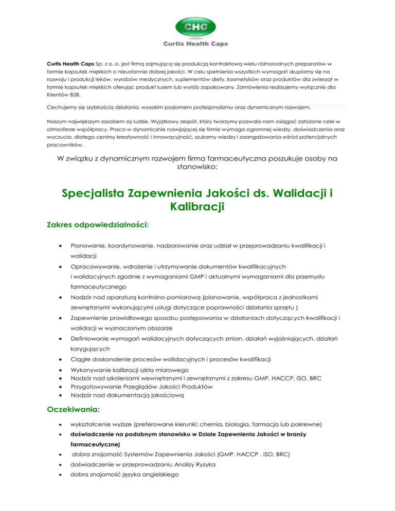 Curtis Health Caps Sp. z o. o. jest firmą zajmującą się produkcją kontraktową wielu różnorodnych preparatów w formie kapsułek miękkich o nieustannie dobrej jakości. W celu spełnienia wszystkich wymagań skupiamy się na rozwoju i produkcji leków, wyrobów medycznych, suplementów diety, kosmetyków oraz produktów dla zwierząt w formie kapsułek miękkich oferując produkt luzem lub wyrób zapakowany. Zamówienia realizujemy wyłącznie dla Klientów B2B. Cechujemy się szybkością działania, wysokim poziomem profesjonalizmu oraz dynamicznym rozwojem. Naszym największym zasobem są ludzie. Wyjątkowy zespół, który tworzymy pozwala nam osiągać założone cele w atmosferze współpracy. Praca w dynamicznie rozwijającej się firmie wymaga ogromnej wiedzy, doświadczenia oraz wyczucia, dlatego cenimy kreatywność i innowacyjność, szukamy wiedzy i zaangażowania wśród potencjalnych pracowników. W związku z dynamicznym rozwojem firma farmaceutyczna poszukuje osoby na stanowisko: Specjalista Zapewnienia Jakości ds. Walidacji i Kalibracji Zakres odpowiedzialności: Planowanie, koordynowanie, nadzorowanie oraz udział w przeprowadzaniu kwalifikacji i walidacji Opracowywanie, wdrożenie i utrzymywanie dokumentów kwalifikacyjnych i walidacyjnych zgodnie z wymaganiami GMP i aktualnymi wymaganiami dla przemysłu farmaceutycznego Nadzór nad aparaturą kontrolno-pomiarową (planowanie, współpraca z jednostkami zewnętrznymi wykonującymi usługi dotyczące poprawności działania sprzętu ) Zapewnienie prawidłowego sposobu postępowania w działaniach dotyczących kwalifikacji i walidacji w wyznaczonym obszarze Definiowanie wymagań walidacyjnych dotyczących zmian, działań wyjaśniających, działań korygujących Ciągłe doskonalenie procesów walidacyjnych i procesów kwalifikacji Wykonywanie kalibracji szkła miarowego Nadzór nad szkoleniami wewnętrznymi i zewnętrznymi z zakresu GMP, HACCP, ISO, BRC Przygotowywanie Przeglądów Jakości Produktów Nadzór nad dokumentacją jakościową Oczekiwania: wykształcenie wyższe (preferowane kierunki: chemia, biologia, farmacja lub pokrewne) doświadczenie na podobnym stanowisku w Dziale Zapewnienia Jakości w branży farmaceutycznej dobra znajomość Systemów Zapewnienia Jakości (GMP, HACCP , ISO, BRC) doświadczenie w przeprowadzaniu Analizy Ryzyka dobra znajomość języka angielskiego zdolności organizacyjne, zaangażowanie, umiejętność pracy w zespole Oferujemy: pracę w dynamicznie rozwijającej się firmie. udział w ciekawych projektach w młodym, dynamicznym zespole. stabilne warunki zatrudnienia i przyjazną atmosferę. wsparcie szkoleniowe podczas wdrażania się do pracy oraz podczas realizacji codziennych obowiązków. świadczenia socjalne. narzędzie niezbędne do wykonywania swoich obowiązków. kartę MultiSport. Zainteresowane osoby prosimy o przesłanie CV i listu motywacyjnego w terminie 14 dni od daty ukazania się ogłoszenia na adres e-mail: [email protected] z dopiskiem SZJ-06/2015. Informujemy, że odpowiemy na wybrane oferty. Prosimy o zamieszczenie następującej klauzuli: „Wyrażam zgodę na przetwarzanie moich danych osobowych dla potrzeb niezbędnych do realizacji procesu rekrutacji (zgodnie z Ustawą z dnia 29.08.1997 roku o Ochronie Danych Osobowych; tekst jednolity: Dz. U. z 2002r. Nr 101, poz. 926 ze zm). Przyjmuję do wiadomości, że przysługuje mi prawo wglądu do treści moich danych oraz ich poprawiania.”
