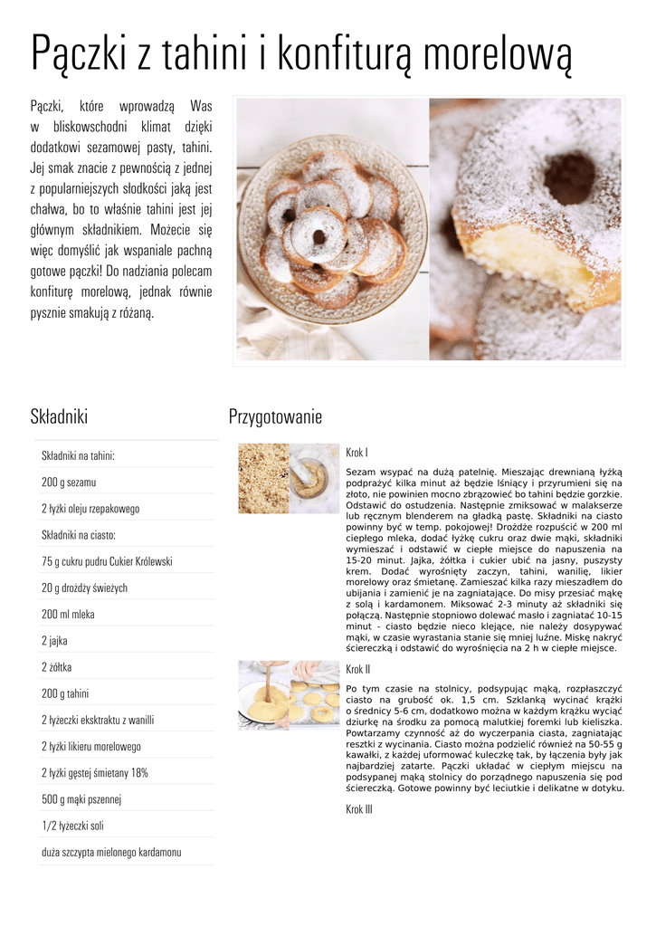 Pączki z tahini i konfiturą morelową Pączki, które wprowadzą Was w bliskowschodni klimat dzięki dodatkowi sezamowej pasty, tahini. Jej smak znacie z pewnością z jednej z popularniejszych słodkości jaką jest chałwa, bo to właśnie tahini jest jej głównym składnikiem. Możecie się więc domyślić jak wspaniale pachną gotowe pączki! Do nadziania polecam konfiturę morelową, jednak równie pysznie smakują z różaną. Składniki Składniki na tahini: 200 g sezamu 2 łyżki oleju rzepakowego Składniki na ciasto: 75 g cukru pudru Cukier Królewski 20 g drożdży świeżych 200 ml mleka 2 jajka Przygotowanie Krok I Sezam wsypać na dużą patelnię. Mieszając drewnianą łyżką podprażyć kilka minut aż będzie lśniący i przyrumieni się na złoto, nie powinien mocno zbrązowieć bo tahini będzie gorzkie. Odstawić do ostudzenia. Następnie zmiksować w malakserze lub ręcznym blenderem na gładką pastę. Składniki na ciasto powinny być w temp. pokojowej! Drożdże rozpuścić w 200 ml ciepłego mleka, dodać łyżkę cukru oraz dwie mąki, składniki wymieszać i odstawić w ciepłe miejsce do napuszenia na 15-20 minut. Jajka, żółtka i cukier ubić na jasny, puszysty krem. Dodać wyrośnięty zaczyn, tahini, wanilię, likier morelowy oraz śmietanę. Zamieszać kilka razy mieszadłem do ubijania i zamienić je na zagniatające. Do misy przesiać mąkę z solą i kardamonem. Miksować 2-3 minuty aż składniki się połączą. Następnie stopniowo dolewać masło i zagniatać 10-15 minut - ciasto będzie nieco klejące, nie należy dosypywać mąki, w czasie wyrastania stanie się mniej luźne. Miskę nakryć ściereczką i odstawić do wyrośnięcia na 2 h w ciepłe miejsce. 2 żółtka Krok II 200 g tahini Po tym czasie na stolnicy, podsypując mąką, rozpłaszczyć ciasto na grubość ok. 1,5 cm. Szklanką wycinać krążki o średnicy 5-6 cm, dodatkowo można w każdym krążku wyciąć dziurkę na środku za pomocą malutkiej foremki lub kieliszka. Powtarzamy czynność aż do wyczerpania ciasta, zagniatając resztki z wycinania. Ciasto można podzielić również na 50-55 g kawałki, z każdej uformować kuleczkę tak, by łączenia były jak najbardziej zatarte. Pączki układać w ciepłym miejscu na podsypanej mąką stolnicy do porządnego napuszenia się pod ściereczką. Gotowe powinny być leciutkie i delikatne w dotyku. 2 łyżeczki eksktraktu z wanilli 2 łyżki likieru morelowego 2 łyżki gęstej śmietany 18% 500 g mąki pszennej 1/2 łyżeczki soli duża szczypta mielonego kardamonu Krok III Powered by TCPDF (www.tcpdf.org) 100 g masła, roztopionego Olej roślinny do smażenia konfitura morelowa cukier puder w młynku Cukier Królewski Każdy otrzepać z nadmiaru mąki, a następnie smażyć po 4-5 sztuk w oleju nagrzanym do temp. 175-180°C po kilka minut z obu stron. Temperatura oleju nie powinna być zbyt wysoka, ponieważ pączki szybko zbrązowieją od zewnątrz, a w środku będą surowe. Pączki odsączać na ręczniczkach papierowych. Jeszcze ciepłe nadziewać konfiturą morelową i oprószać cukrem pudrem.