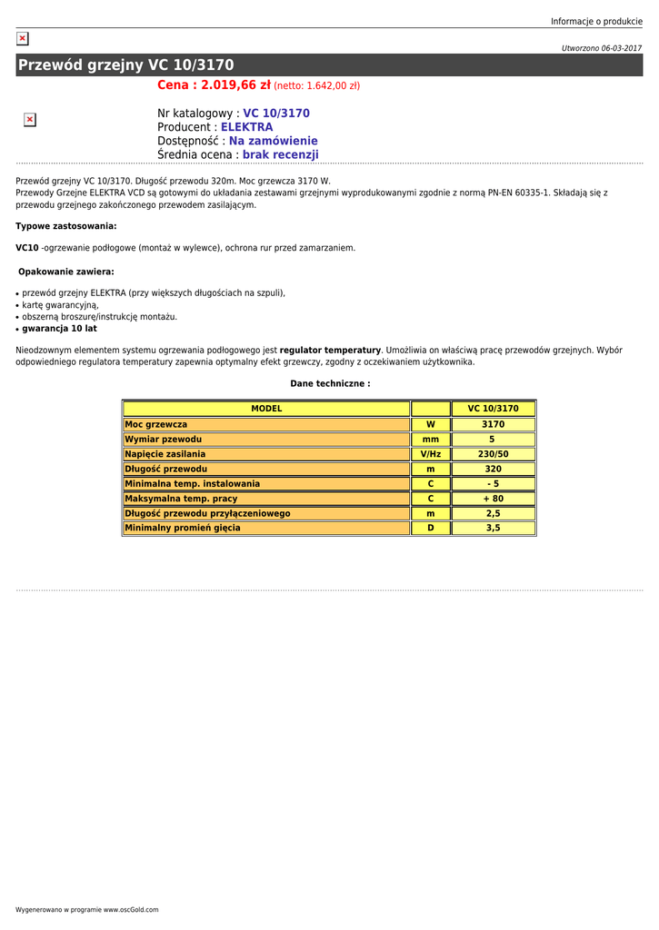 Informacje o produkcie Utworzono 06-03-2017 Przewód grzejny VC 10/3170 Cena : 2.019,66 zł (netto: 1.642,00 zł) Nr katalogowy : VC 10/3170 Producent : ELEKTRA Dostępność : Na zamówienie Średnia ocena : brak recenzji Przewód grzejny VC 10/3170. Długość przewodu 320m. Moc grzewcza 3170 W. Przewody Grzejne ELEKTRA VCD są gotowymi do układania zestawami grzejnymi wyprodukowanymi zgodnie z normą PN-EN 60335-1. Składają się z przewodu grzejnego zakończonego przewodem zasilającym. Typowe zastosowania: VC10 -ogrzewanie podłogowe (montaż w wylewce), ochrona rur przed zamarzaniem. Opakowanie zawiera: ● ● ● ● przewód grzejny ELEKTRA (przy większych długościach na szpuli), kartę gwarancyjną, obszerną broszurę/instrukcję montażu. gwarancja 10 lat Nieodzownym elementem systemu ogrzewania podłogowego jest regulator temperatury. Umożliwia on właściwą pracę przewodów grzejnych. Wybór odpowiedniego regulatora temperatury zapewnia optymalny efekt grzewczy, zgodny z oczekiwaniem użytkownika. Dane techniczne : VC 10/3170 MODEL Moc grzewcza W 3170 Wymiar pzewodu mm 5 Napięcie zasilania V/Hz 230/50 Długość przewodu m 320 Minimalna temp. instalowania C -5 Maksymalna temp. pracy C + 80 Długość przewodu przyłączeniowego m 2,5 Minimalny promień gięcia D 3,5 Wygenerowano w programie www.oscGold.com
