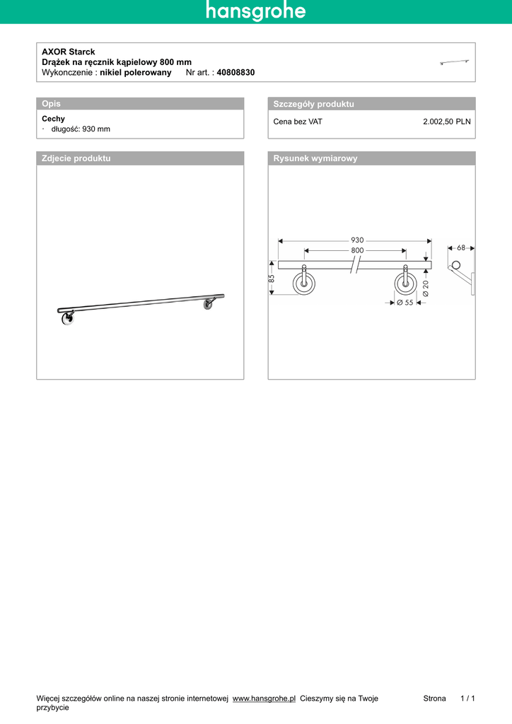 AXOR Starck Drążek na ręcznik kąpielowy 800 mm Wykonczenie : nikiel polerowany___Nr art. : 40808830 Opis Szczegóły produktu Cechy · długość: 930 mm Cena bez VAT Zdjecie produktu Rysunek wymiarowy Więcej szczegółów online na naszej stronie internetowej_www.hansgrohe.pl_Cieszymy się na Twoje przybycie 2.002,50-PLN Strona 1/1