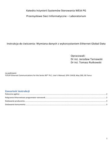 Katedra Inżynierii Systemów Sterowania WEiA PG Przemysłowe Sieci Informatyczne – Laboratorium Instrukcja do ćwiczenia: Wymiana danych z wykorzystaniem Ethernet Global Data Opracowali: Dr inż. Jarosław Tarnawski Dr inż. Tomasz Rutkowski na podstawie: TCP/IP Ethernet Communications for the Series 90™ PLC, User's Manual, GFK-1541B, May 200, GE Fanuc Zawartość instrukcji Polecenia ogólne: ....................................................................................................................................................................... 2 Połączenie Ethernetowe programator-sterownik...................................................................................................................... 2 Dodawanie producenta .............................................................................................................................................................. 3 Dodawanie konsumenta ............................................................................................................................................................ 3 1 Polecenia ogólne: 1. Podzielić grupę realizujących ćwiczenie na tyle części ile dostępnych jest PLC z Ethernetem w laboratorium. 2. Skonfiguruj sterowniki i przygotuj do pracy 3. Odnajdź Ethernetowy port komunikacyjny w sterowniku i przejdź do edycji parametrów konfiguracyjnych Uwaga w sterowniku PACS RX3i będzie to zewnętrzny, osobny moduł komunikacyjny (np. ETM001), a w sterowniku 90-30 będzie to port w jednostce centralnej 364. 4. W przypadku konfigurowania sterownika 90-30 w zakładce Ethernet w polu Adapter Name wpisz dowolną nazwę (pole nie może zostać puste) 5. 6. 7. 8. Przypisz numery IP do sterowników zgodnie ze schematem z instrukcji Załaduj konfigurację do sterownika Uruchom konsolę na komputerze programatorze: START-> Uruchom-> wpisz w polu edycyjnym cmd -> naciśnij OK Wydaj polecenie ping a następnie numer IP, który wpisałeś do sterownika np. ping 192.168.1.201 i naciśnij Enter 9. Sprawdź połączenie. Jeśli nie pakiety nie są przesyłane przeprowadź ponownie proces konfiguracji. 10. Następnie wykonaj ping do pozostałych sterowników, które będą brały udział w wymianie danych 11. Odłącz się od sterownika (przejdź w tryb off-line) Połączenie Ethernetowe programator-sterownik 12. Po prawidłowej odpowiedzi możesz zmienić połączenie pomiędzy sterownikiem i programatorem z połączenia szeregowego na połączenie Ethernetowe. W tym celu naprowadź kursor na nazwę podsystemu w drzewie projektu (domyślna nazwa Target1) i w oknie Inspector zmień ustawienie na pozycji Physical Port z COM1 na Ethernet a w polu adres wpisz adres IP, który wpisałeś w konfiguracji sterownika 13. Możesz przetestować nowe połączenie, po zakończeniu testów odłącz się od sterownika (tyb off-line) 2 14. Następnie naciśnij prawy klawisz myszki na nazwie podsystemu (domyślnie Target1) i wybierz opcję Add Component, a następnie Ethernet Global Data 15. Po naprowadzeniu kursorem na element Ethernet Global Data wpisz w polu Local Producer ID numer podany na schemacie np. 0.0.0.1 i naciśnij Enter. Programator sam wypełni pole Local Producer ID (number) 16. Uwaga należy rozróżniać ID producenta i numer IP . To dwa różne numery! Dodawanie producenta 17. W pierwszej fazie zaprojektuj w obrębie grupy jedną wymianę – np. pomiędzy PLC1 jako producentem i PLC2 jako konsumentem naprowadź kursor na nazwę Produced Exchanges i naciśnij prawy klawisz myszki, a następnie wybierz opcję New 18. Następnie naprowadź kursor na utworzoną wymianę i naciśnij lewy klawisz myszki 19. Wprowadź kolejny numer wymiany Exchange ID (zaczynamy od 1, każda wymiana musi mieć swój unikalny numer, Producent i Konsument muszą mieć ten sam numer w obrębie jednej wymiany) 20. Destination Type: wybierz IP Adress lub Unicast (zależnie od wersji programu i sterownika) 21. W polu Destination wpisz adres IP sterownika, do którego wysyłasz dane 22. Następnie naciśnij dwukrotnie lewy klawisz myszki na dodanej wymianie i otworzy się okno, w którym należy wpisać adres zmiennej do wysłania. Wpisz adres związany z symulatorem wejść, aby mieć bezpośredni wpływ na wysyłane dane. 23. Załaduj nową konfigurację do sterownika, poczekaj aż koledzy skonfigurują sterownik Konsumenta. Sprawdź poprawność wysyłanych danych Dodawanie konsumenta Naprowadź kursor na nazwę Consumed Exchanges i naciśnij prawy klawisz myszki a następnie wybierz opcję New 24. Następnie naprowadź kursor na utworzoną wymianę i naciśnij lewy klawisz myszki 3 25. Wprowadź nazwę producenta tj. sterownika, który będzie przysyłał dane 26. Wprowadź ten sam numer wymiany ExchangeID, który wpisano przy definiowaniu producenta dla tej wymiany 27. Następnie naciśnij dwukrotnie lewy klawisz myszki na dodanej wymianie i otworzy się okno w którym należy wpisać, gdzie odbierzemy przysyłane dane. Wpisz adres związany z wyjściami dyskretnymi, aby od razu obejrzeć stan przysyłanych danych. 28. Załaduj nową konfigurację do sterownika, poczekaj aż koledzy skonfigurują sterownik producenta. Sprawdź poprawność odbieranych danych 29. Posługując się opisaną metodą zaprojektuj wymianę danych pomiędzy trzema sterownikami. Każdy z nich ma być zarówno producentem jak i konsumentem. Wykonaj czynności właściwe dla grupy, do której przynależysz, a następnie po zakończeniu pracy w grupach: 1. Zaprojektuj przesyłanie zmiennych rejestrowych %R z wykorzystaniem bloków Word In, Word Out i typem danych Zmienna analogowa 2. Spróbuj podnieść prędkość przesyłania danych 3. Zaprojektuj aplikację dla sterownika, która umożliwi oszacowanie czasu potrzebnego na transmisję danych od PLC1 do PLC2 i z powrotem od PLC2 do PLC1, w tym celu: a. przejdź do edycji programu - blok MAIN w drzewie projektu b. osadź styk normalny i przypisz mu zmienną dyskretną związaną z p