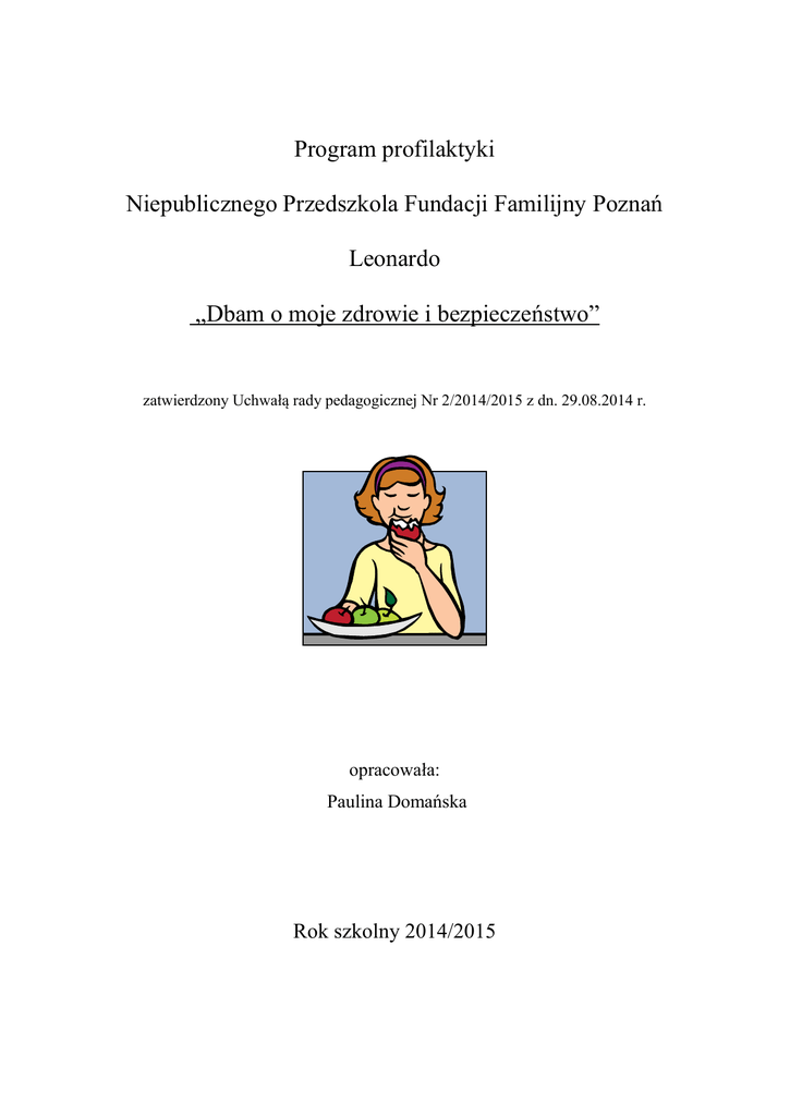 Program profilaktyki Niepublicznego Przedszkola Fundacji Familijny Poznań Leonardo „Dbam o moje zdrowie i bezpieczeństwo” zatwierdzony Uchwałą rady pedagogicznej Nr 2/2014/2015 z dn. 29.08.2014 r. opracowała: Paulina Domańska Rok szkolny 2014/2015 I CEL GŁÓWNY Wychowanie dziecka do bezpiecznego i zdrowego stylu życia. II CELE SZCZEGÓŁOWE Dziecko zna i przestrzega zasady dotyczące bezpieczeństwa podczas pobytu w przedszkolu /w sali, na podwórku, w łazience, podczas zabawy, zajęć itp./. Dziecko wie, że nie zachowanie ostrożności może spowodować różne wypadki: oparzenia, skaleczenia, stłuczenia. Przestrzega zasad dotyczących niebezpiecznych przedmiotów /np. zapałki urządzenia elektryczne/. Przestrzega zakaz zrywania nieznanych roślin i grzybów, spożywania pokarmów nieznanego pochodzenia, lekarstw. Przestrzega zakaz zbliżania się do nieznanych zwierząt, np. psów. Dba o higienę jamy ustnej oraz całego ciała. Zna sposoby zapobiegania chorobom. Zna zasady podstawowe zdrowego odżywiania. Rozumie potrzebę pobytu na świeżym powietrzu. Zna zasady uczestnictwa w ruchu drogowym /ma świadomość niebezpieczeństw grożących na drodze/. Zna niebezpieczeństwa wynikające z przypadkowych spotkań z nieznajomymi. III JAK OSIĄGNĄĆ CEL? Dobra organizacja procesu edukacyjnego i zapewnienie odpowiednich warunków do jego realizacji. Tworzenie sytuacji umożliwiających zdobycie wiedzy i umiejętności w zakresie dbania o własne bezpieczeństwo i zdrowie 2 Wdrożenie wszystkich pracowników przedszkola do realizacji programu Współpraca z rodzicami, a także pedagogizacji rodziców Dobór atrakcyjnych form i metod pracy opartych na różnorodnej działalności dziecka, np.: - zabawy, - obserwacja i pokaz, - działanie, - przekaz słowny, literatura dziecięca, - przykład osobisty nauczycielki /a także zapraszanych gości/, - zadania stawiane do wykonania, - aktywność własna dzieci, - ćwiczenia utrwalające, - wycieczki, - spotkania z ekspertami, - zabawy ruchowe, - zabawy z piosenką, - scenki dramowe, - zagadki, - gry dydaktyczne, - zabawy tematyczne, - organizowanie kącików tematycznych, - wystawki, - praca z obrazkiem, i wiele innych. 3 IV DOKUMENTOWANIE – EWALUACJA PROGRAMU Badania ankietowe (na koniec roku – maj – ankieta dla rodziców) Wnioski z obserwacji zachowań dzieci Analiza dokumentów – dziennik, plany pracy miesięczne lub tygodniowe, planowy rozkład dnia, karty obserwacji dzieci Opracowanie przykładowych scenariuszy zajęć do wybranych tematów Realizacja zaplanowanych spotkań z rodzicami – protokoły wspólnych spotkań i notatki z indywidualnych rozmów V TREŚCI PROGRAMOWE Treści programowe BEZPIECZEŃSTWO: Rozwijanie umiejętności zapewniających bezpieczeństwo na terenie przedszkola, Formy realizacji Cele szczegółowe - zapoznanie z pomieszczeniami przedszkola, zabawkami, sprzętami, narzędziami i sposobem korzystania z nich, Dziecko zna pomieszczenia przedszkolne i ich przeznaczenie, bierze udział w ustalaniu zasad i przestrzega je, potrafi zgodnie bawić się i współdziałać w zespole. - ustalenie zasad zachowania sprzyjających bezpieczeństwu, wspólne stworzenie, - umiejętne rozwiązywanie konfliktów z rówieśnikami, dostarczanie przykładów z literatury dziecięcej, zajęcia dramowe, - rozmowy, - dostarczanie przykładów z literatury, Przestrzeganie przez dzieci zakazów: - zabawy zapałkami, - omawianie problemu zabaw w pobliżu jezdni, placu budowy, zbiorników wodnych, zimowych 4 Dziecko zna niebezpieczeństwa wynikające z zabaw w niedozwolonych miejscach lub też zabaw na zamarzniętych zbiornikach wodnych, - oglądanie plansz, - dostrzeganie związków przyczynowo-skutkowych na podstawie historyjek obrazkowych, niedozwolonymi przedmiotami - samowolnego korzystania z urządzeń elektrycznych, - omówienie problemu w trakcie zajęć dydaktycznych, Przestrzega zakazu korzystania z urządzeń elektrycznych podłączonych do sieci - zrywania nieznanych roślin i grzybów, - rozpoznawanie grzybów jadalnych i trujących na podstawie ilustracji, zapoznanie z cechami ich wyglądu, - wycieczka do lasu, - wykonanie zbiorowej pracy plastycznej wybraną techniką Wie, że nie można zrywać nieznanych roślin, zna grzyby trujące - zbliżania się do nieznanych zwierząt, - oglądanie plansz, - dostrzeganie związków przyczynowo-skutkowych na podstawie historyjek obrazkowych Wie, że nie można zbliżać się i bawić z dzikimi oraz domowymi, lecz nieznanymi, zwierzętami - zabaw w miejscach niedozwolonych, Zapoznanie z elementarnymi zasadami uczestnictwa w ruchu drogowym, kształtowanie u dzieci prawidłowych postaw sprzyjających unikaniu różnego typu zagrożeń, kształtowanie postawy zaufania do funkcjonariuszy. - omówienie problemu w trakcie zajęć dydaktycznych, - wycieczka po okolicy połączona z obserwacją ulicy, chodnika, znaków itp. 5 Zna zasady przechodzenia przez jezdnię, zna ważne dla pieszych znaki drogowe, potrafi dokonać podziału znaków na ostrzegawcze, informacyjne, zakazu i nakazu, ma wyrobioną postawę zaufania wobec pracowników policji, wie, jak zachować się w kontaktach z nieznajomymi, HIGIENA I ZDROWIE: Kształtowanie nawyku dbania o czystość osobistą i zdrowie - pogadanki, - dostarczanie przykładów z literatury, - wycieczka do apteki, - zapoznanie z pracą lekarza /zajęcia dydaktyczne, zabawy tematyczne itp./ Rozumienie roli właściwego odżywiania się, - udział w konkursie plastycznym, - wykonanie plakatów, - prelekcja na temat zdrowego żywienia prowadzona przez pielęgniarkę, Podkreślenie roli ruchu i powietrza jako stymulatorów prawidłowego rozwoju - częste przebywanie na powietrzu, ubiór odpowiedni do pory roku, - zabawy i ćwiczenia ruchowe na powietrzu, - spacery, - zapoznanie ze sposobami przeciwdziałania marznięciu /rozcieranie rąk, tupanie…/ oraz przegrzaniu /zabawy w cieniu drzew, zaspokajanie pragnienia/, 6 Rozumie koniecznoś