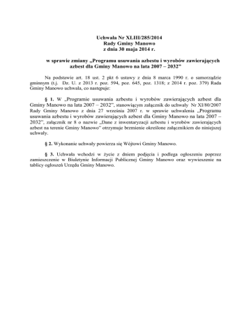 Uchwała Nr XLIII/285/2014 Rady Gminy Manowo z dnia 30 maja 2014 r. w sprawie zmiany „Programu usuwania azbestu i wyrobów zawierających azbest dla Gminy Manowo na lata 2007 – 2032” Na podstawie art. 18 ust. 2 pkt 6 ustawy z dnia 8 marca 1990 r. o samorządzie gminnym (t.j. Dz. U. z 2013 r. poz. 594, poz. 645, poz. 1318; z 2014 r. poz. 379) Rada Gminy Manowo uchwala, co następuje: § 1. W „Programie usuwania azbestu i wyrobów zawierających azbest dla Gminy Manowo na lata 2007 – 2032”, stanowiącym załącznik do uchwały Nr XI/80/2007 Rady Gminy Manowo z dnia 27 września 2007 r. w sprawie uchwalenia „Programu usuwania azbestu i wyrobów zawierających azbest dla Gminy Manowo na lata 2007 – 2032”, załącznik nr 8 o nazwie „Dane z inwentaryzacji azbestu i wyrobów zawierających azbest na terenie Gminy Manowo” otrzymuje brzmienie określone załącznikiem do niniejszej uchwały. § 2. Wykonanie uchwały powierza się Wójtowi Gminy Manowo. § 3. Uchwała wchodzi w życie z dniem podjęcia i podlega ogłoszeniu poprzez zamieszczenie w Biuletynie Informacji Publicznej Gminy Manowo oraz wywieszenie na tablicy ogłoszeń Urzędu Gminy Manowo. Załącznik do uchwały Nr XLIII/285/2014 Rady Gminy Manowo z dnia 30 maja 2014 r. ZAŁĄCZNIK 8 NR DANE Z INWENTARYZACJI AZBESTU I WYROBÓW ZAWIERAJĄCYCH AZBEST NA TERENIE GMINY MANOWO Gmina Manowo Nazwa wyrobu zawierającego azbest Miejsce występowania wyrobu zawierającego azbest (miejscowość) Płyty azbestowocementowe Jednostka stan na miary 31.12.2003r. m2 Płyty azbestowocementowe stan aktualny, 2014r. m2 m2 7725,0 5798,0 m 2 13633,0 9204,0 Cewlino i Kopanica m 2 8823,5 8570,0 Manowo m2 8526,0 7632,0 2 10000,0 17420,0 m2 6716,5 5421,0 m 2 552,0 362,0 m 2 9691,5 7984,5 m 2 1600,0 1670,0 m 2 355,0 355,0 m 2 930,0 930,0 m 2 6573,0 3557,0 m 2 1687,0 1687,0 m2 76812,5 70590,5 Kretomino Bonin Wyszebórz, Policko i Dęborogi Płyty azbestowoWyszewo cementowe Wiewiórowo płaskie i faliste stosowane Rosnowo w budownictwie Lisowo i Jagielno Kliszno Mostowo i Poniki Grzybnica i Gajewo Grzybniczka i Kopanino RAZEM m Źródło: Dane z Urzędu Gminy Manowo, 2014r. Ilość azbestu usuniętego w 2006 roku Miejscowość Wyszewo 49 Ilość usuniętego azbestu [m2] 150,0 Rosnowo - Szkoła Podstawowa 1466,0 RAZEM 1616,0 Źródło: Dane z Urzędu Gminy Manowo, 2007r. Ilość azbestu usuniętego w 2007 roku Miejscowość Ilość usuniętego azbestu [m2] Wyszebórz 34b 100,0 Źródło: Dane z Urzędu Gminy Manowo, 2008r. Ilość azbestu usuniętego w 2008 roku Miejscowość Ilość usuniętego azbestu [m2] Grzybniczka 5/1 158,0 Manowo 40 Urząd Gminu Manowo 384,0 Manowo 60,0 RAZEM 602,0 Źródło: Dane z Urzędu Gminy Manowo, 2009r. Ilość azbestu usuniętego w 2009 roku Miejscowość Ilość usuniętego azbestu [m2] Wyszewo 3/2 144,0 Rosnowo 37 58,0 Rosnowo 24/23 160,0 RAZEM 362,0 Źródło: Dane z Urzędu Gminy Manowo, 2010r. Ilość azbestu usuniętego w 2011 roku Miejscowość Ilość usuniętego azbestu [m2] Kretomino ul. Grzybowa 11 504,0 Cewlino 41 271,0 Cewlino 2 643,0 Cewlino 5H 77,0 Manowo 17 306,5 Manowo 66 137,0 Wyszewo 65 440,0 Rosnowo 43 171,0 RAZEM 2549,5 Źródło: Dane z Urzędu Gminy Manowo, 2012r. Ilość azbestu usuniętego w 2012 roku Miejscowość Ilość usuniętego azbestu [m2] Kretomino ul. Kretomińska 39 162,00 Kretomino ul. Kretomińska 37 85,50 Kretomino ul. Polna 3 176,40 Kretomino ul. Grzybowa 11 174,70 Kretomino ul. Koszalińska 22,80 Bonin 1 369,00 Bonin 38/2 61,20 Bonin 44 7501,90 Cewlino 10/1 25,44 Cewlino 30 209,20 Manowo 72N 200,00 Wyszewo k/ kościoła 24,36 Rosnowo 68 130,00 Kopanino 5/1 39,75 RAZEM 9182,25 Źródło: Dane z Urzędu Gminy Manowo, 2013r. Ilość azbestu usuniętego w 2013 roku Miejscowość Ilość usuniętego azbestu [m2] Kretomino ul. Grzybowa 11 208,33 Kretomino ul. Opieniek 11 147,78 Cewlino 1B 66,67 Manowo 44/1 65,55 Manowo 44/2 67,77 Wyszewo 3D 276,67 Wyszewo 21 138,89 Wyszebórz 12B/1 91,67 Bonin 30/16 15,00 Kretomino (przystanek autobusowy) 23,20 RAZEM 1101,53 Źródło: Dane z Urzędu Gminy Manowo, 2014r. 264,6 m2 - powierzchnia płyt azbestowo - cementowych na obiektach będących w zarządzie Gminy Kretomino. Lp. Nazwa wyrobu zawierającego azbest Miejsce występowania wyrobu zawierającego azbest Adres Jednostka miary Ilość Uwagi 250,0 Stodoła 200,0 Obora Płyta falista azbestowocementowa Kretomino ul. Kretomińska 41 2 -I- Kretomino ul. Kretomińska 39 m2 90,0 3 -I- Kretomino ul. Kretomińska 20 m2 420,0 4 -I- Kretomino ul. Poziomkowa 21 m2 100,0 Obora 2 60,0 1 m 2 90,0 Wiata budynek gospodarczy Obora 5 -I- Kretomino ul. Poziomkowa 17 m 6 -I- Kretomino ul. Poziomkowa 5 m2 60,0 7 -I- Kretomino ul. Kretomińska 9 m2 100,0 Wiata budynek gospodarczy Obora 150,0 Stodoła 2 140,0 Obora 40,0 Szopa 130,0 stolarnia z 8 -I- Kretomino ul. Kretomińska 10 m 9 -I- Kretomino ul. Kretomińska 8 m2 zapleczem 10 11 -I-I- 12 -I- 13 -I- 14 -I- Kretomino ul . Kretomińska 1 Kretomino ul . Kretomińska 1a Kretomino ul. Familijna 5 2 m m2 m 2 Kretomino ul Koszalińska 20 m2 Kretomino ul. Koszalińska 10 m2 70,0 70,0 budynek mieszkalny 160,0 Stodoła 180,0 Obora 80,0 Wiata stodoła ( w tym obora) budynek mieszkalny wiata z warsztatem 350,0 140,0 15 -I- 16 -I- Kretomino ul. Kościelna 28 m2 380,0 17 -I- Kretomino ul. Ogrodników 1 m2 70,0 18 -I- Kretomino ul. Ogrodników 3 m2 150,0 -I- Kretomino ul. Ogrodników 4 m2 250,0 20 -I- Kretomino ul. Ogrodników 6 m2 140,0 21 -I- Kretomino ul. Kretomińska 17 m2 45,0 budynek mieszkalny Warsztat 22 -I- Kretomino ul. Koszalińska 37 m2 300,0 Obora 19 23 -I- 100,0 obora ( w tym stodoła) Warsztat budynek gospodarczy Obora 50,0 Szopa 270,0 Stodoła Kretomino ul. Kretomińska 58 m2 70,0 Obora 2 140,0 24 -I- Kretomino ul. Kretomińska 58 m 25 -I- Kretomino ul. Kretomińska 36 m2 180,0 26 -I- Kretomino ul. Kretomińska 14 m2 160,0 Obora budynek gospodarczy Stodoła 2 613,0 Pieczarkarnia 27 -I- Kretomino ul. Grzybowa 11 m m2 RAZEM 5798,0 Źródło: Dane z Ur