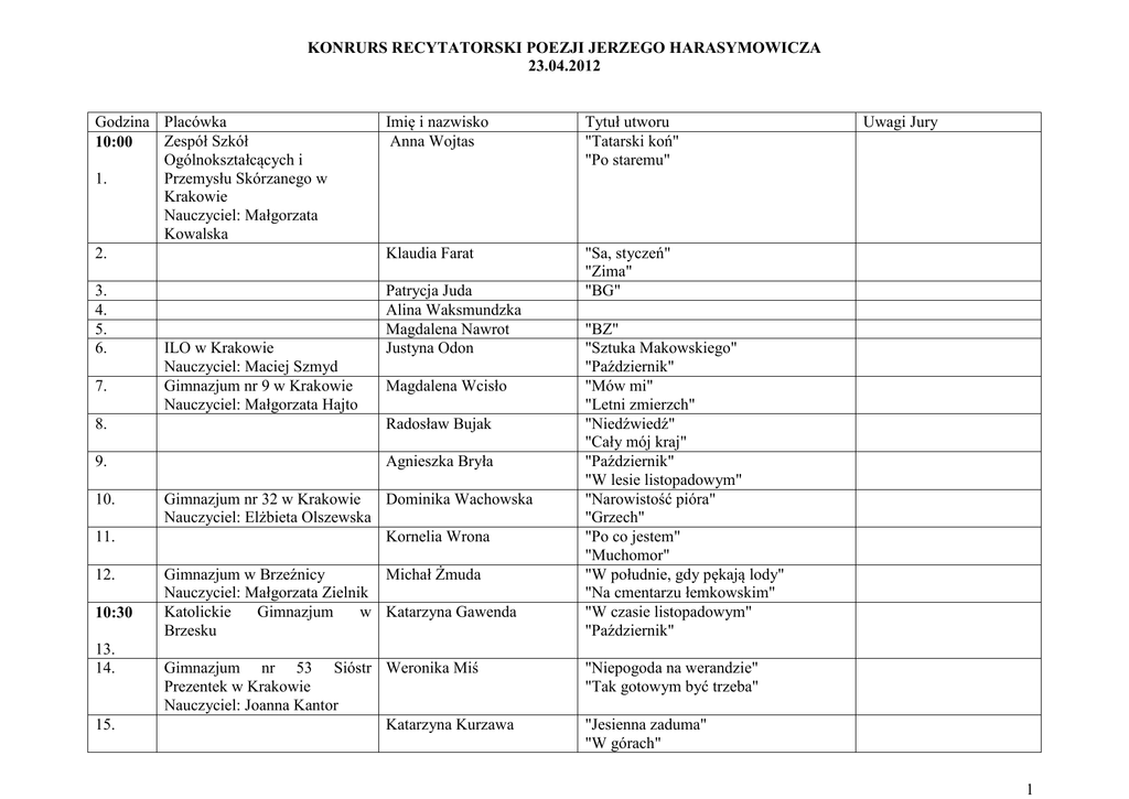 KONRURS RECYTATORSKI POEZJI JERZEGO HARASYMOWICZA 23.04.2012 Godzina Placówka Zespół Szkół 10:00 Ogólnokształcących i 1. Przemysłu Skórzanego w Krakowie Nauczyciel: Małgorzata Kowalska 2. Imię i nazwisko Anna Wojtas Tytuł utworu "Tatarski koń" "Po staremu" Klaudia Farat 3. 4. 5. 6. Patrycja Juda Alina Waksmundzka Magdalena Nawrot Justyna Odon "Sa, styczeń" "Zima" "BG" 7. ILO w Krakowie Nauczyciel: Maciej Szmyd Gimnazjum nr 9 w Krakowie Nauczyciel: Małgorzata Hajto Magdalena Wcisło 8. Radosław Bujak 9. Agnieszka Bryła 10. 11. 12. 10:30 13. 14. 15. Gimnazjum nr 32 w Krakowie Dominika Wachowska Nauczyciel: Elżbieta Olszewska Kornelia Wrona Gimnazjum w Brzeźnicy Michał Żmuda Nauczyciel: Małgorzata Zielnik Katolickie Gimnazjum w Katarzyna Gawenda Brzesku Gimnazjum nr 53 Sióstr Weronika Miś Prezentek w Krakowie Nauczyciel: Joanna Kantor Katarzyna Kurzawa Uwagi Jury "BZ" "Sztuka Makowskiego" "Październik" "Mów mi" "Letni zmierzch" "Niedźwiedź" "Cały mój kraj" "Październik" "W lesie listopadowym" "Narowistość pióra" "Grzech" "Po co jestem" "Muchomor" "W południe, gdy pękają lody" "Na cmentarzu łemkowskim" "W czasie listopadowym" "Październik" "Niepogoda na werandzie" "Tak gotowym być trzeba" "Jesienna zaduma" "W górach" 1 16. Gabriela Słonina 17. Małgorzata Ojczenasz 18. 19. LO Sióstr Prezentek Krakowie Nauczyciel: Joanna Kantor XIII LO w Krakowie Nauczyciel: Anna Strzępek w Aleksandra Biśta 20. 21. 22. 23. 11:00 24. 25. 26. Patryk Ziernicki Chrystyna Tkaczenko I LO w Krakowie Katarzyna Paś Nauczyciel: Agata KawaSapyta I LO w Krakowie Kinga Duda Nauczyciel: Mateusz Skucha Sylwia Łakomy Gimnazjum nr 21 w Krakowie Daria Siemieniuk Nauczyciel: Dorota Sobol Zespół Szkolno-Przedszkolny Dominika Kapusta Gimnazjum w Brzeźnicy Nauczyciel: Lidia Adamus Kamil Wołczyk 27. Dominika Oprychał 28. Aleksandra Ryś 29. Małgorzata Orgal Sylwia Kozik Małgorzata Pierzynka 30. Gimnazjum nr 46 Nauczyciel: Katarzyna KuklaGuzgan 31. Aleksandra Grądziel 32. Karolina Sadzikowska "Mit o św. Jerzym" "Dlaczego pada śnieg" "Spacer" "Letni zmierzch" "Oset" "Zmierzch" "Zostanie tyle piór" "Matko Boża "Dlaczego pada śnieg" "Muchomor" "Generałowie" "Pieśń XXIX" (z akompaniamentem fortepianu i gitary) "Oset" "Ławka przed domem" "W górach" "Chmurkolistny" "Siedzi na krześle" "Niedźwiedź" "Oset" "Po co jestem" "Żony poetów" "Budzenie się poranku" "Dom pod Bortnem" "Piosenka XXIX" "W lesie listopadowym" "Dlaczego pada śnieg?" "Osty" "Mak" "Na dachu wagonu" "Dom w górach" 2 33. Gimnazjum nr 3 w Krakowie Nauczyciel: Anna Twardy Adam Wróbel 34. Edyta Biel 35. Oliwia Piwowarczyk 36. Zuzanna Sawińska 37. 38. Gimnazjum nr 1 w Krakowie Nauczyciel: Barbara Kiepura Michał Słotwiński Hubert Kessler "Mochnaczka: Przyjazd III październik 77" "Książę poezji" "Narowistość pióra" "Grzech" "Cały mój dobytek" "Staw w botanicznym" "Jak lodu szybka" "Dlaczego pada śnieg?" "Podróż" "Wakacje" "Lola madonna" (fragment) "Litania" 3