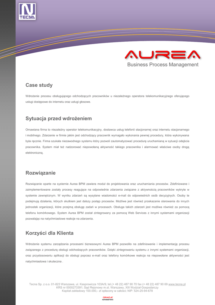 Business Process Management Case study Wdrożenie procesu obsługującego odchodzących pracowników u niezależnego operatora telekomunikacyjnego oferującego usługi dostępowe do internetu oraz usługi głosowe. Sytuacja przed wdrożeniem Omawiana firma to niezależny operator telekomunikacyjny, dostawca usług telefonii stacjonarnej oraz internetu stacjonarnego i mobilnego. Zdarzenie w firmie jakim jest odchodzący pracownik wymagało wykonania pewnej procedury, która wykonywana była ręcznie. Firma szukała niezawodnego systemu który pozwoli zautomatyzować procedurę uruchamianą w sytuacji odejścia pracownika. System miał też nadzorować niepowołaną aktywność takiego pracownika i alarmować właściwe osoby drogą elektroniczną. Rozwiązanie Rozwiązanie oparte na systemie Aurea BPM zawiera moduł do projektowania oraz uruchamiania procesów. Zdefiniowane i zaimplementowane zostały procesy reagujące na odpowiednie zdarzenia związane z aktywnością pracowników wykryte w systemie zewnętrznym. W wyniku zdarzeń są wysyłane wiadomości e-mail do odpowiednich osób decyzyjnych. Osoby te podejmują działania, których skutkiem jest dalszy postęp procesów. Możliwe jest również przekazanie sterowania do innych jednostek organizacji, które przejmą obsługę zadań w procesach. Obsługa takich zdarzeń jest możliwa również za pomocą telefonu komórkowego. System Aurea BPM został zintegrowany za pomocą Web Services z innymi systemami organizacji pozwalając na natychmiastowe reakcje na zdarzenia. Korzyści dla Klienta Wdrożenie systemu zarządzania procesami biznesowymi Aurea BPM pozwoliło na zdefiniowanie i implementację procesu związanego z procedurą obsługi odchodzących pracowników. Dzięki zintegrowaniu systemu z innymi systemami organizacji, oraz przystosowaniu aplikacji do obsługi poprzez e-mail oraz telefony komórkowe reakcja na niepowołane aktywności jest natychmiastowa i skuteczna . Tecna Sp. z o.o. 01-823 Warszawa, ul. Kasprowicza 103A/9, tel.(+ 48 22) 487 90 70 fax (+ 48 22) 487 90 69 www.tecna.pl KRS nr 0000273391; Sąd Rejonowy m.st. Warszawy, XIII Wydział Gospodarczy Kapitał zakładowy 100.000,- zł opłacony w całości; NIP: 524-25-94-678
