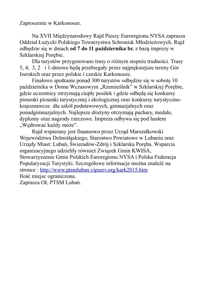 Zaproszenie w Karkonosze. Na XVII Międzynarodowy Rajd Pieszy Euroregionu NYSA zaprasza Oddział Łużycki Polskiego Towarzystwa Schronisk Młodzieżowych. Rajd odbędzie się w dniach od 7 do 11 października br. z bazą imprezy w Szklarskiej Porębie. Dla turystów przygotowano trasy o różnym stopniu trudności. Trasy 5, 4, 3, 2 i 1-dniowe będą przebiegały przez najpiękniejsze tereny Gór Izerskich oraz przez polskie i czeskie Karkonosze. Finałowe spotkanie ponad 300 turystów odbędzie się w sobotę 10 października w Domu Wczasowym „Rzemieślnik” w Szklarskiej Porębie, gdzie uczestnicy otrzymają ciepły posiłek i gdzie odbędą się konkursy piosenki piosenki turystycznej i ekologicznej oraz konkursy turystycznokrajoznawcze dla szkół podstawowych, gimnazjalnych oraz ponadgimnazjalnych. Najlepsze drużyny otrzymają puchary, medale, dyplomy oraz nagrody rzeczowe. Impreza odbywa się pod hasłem „Wędrować każdy może”. Rajd wspierany jest finansowo przez Urząd Marszałkowski Województwa Dolnośląskiego, Starostwo Powiatowe w Lubaniu oraz Urzędy Miast: Lubań, Świeradów-Zdrój i Szklarska Poręba. Wsparcia organizacyjnego udzieliły również Związek Gmin KWISA, Stowarzyszenie Gmin Polskich Euroregionu NYSA i Polska Federacja Popularyzacji Turystyki. Szczegółowe informacje można znaleźć na stronce : http://www.ptsmluban.vipserv.org/kark2015.htm Ilość miejsc ograniczona. Zaprasza OŁ PTSM Lubań.