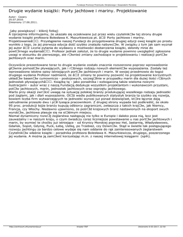 Fundacja Promocji Przemysłu Okrętowego i Gospodarki Morskiej Drugie wydanie książki: Porty jachtowe i mariny. Projektowanie Autor: Cezary 25.07.2010. Zmieniony 17.06.2011. (aby powiększyć - kliknij fotkę)  Uprzejmie informujemy, że ukazało się oczekiwane już przez wielu czytelnikÃłw tej strony drugie wydanie książki profesora Bolesława K. Mazurkiewicza pt. „Porty jachtowe i mariny. Projektowanie―. Przystąpienie naszej Fundacji do przygotowania drugiej edycji owej książki po prostu wynikło z tego, że jej pierwsza edycja dość szybko znalazła nabywcÃłw. W związku z tym jak sam wyznał jej autor „Liczne pytania do wydawcy o możliwości dostarczenia książki, skłoniły mnie do powtÃłrnego wydania―. Profesor jednak założył, że to drugie wydanie powinno uwzględnić zgłoszone uwagi w stosunku do pierwszego, ale rÃłwnież zmiany zachodzące w projektowaniu i realizacji portÃłw jachtowych oraz marin. Oczywiście prezentowane teraz to drugie wydanie zostało znacznie rozszerzone poprzez wprowadzenie głÃłwnie pomostÃłw pływających, jak i rÃłżnego rodzaju nowych elementÃłw wyposażenia. Zostały też wprowadzone istotne opisy istniejących portÃłw jachtowych i marin. W swojej przedmowie do tegoż drugiego wydania Profesor nadmienił, że „zmiany te powinny pozwolić na projektowanie korzystnych układÃłw basenÃłw cumowniczo - postojowych, szczegÃłlnie w przypadku marin dla dużej ilości rÃłżnych jednostek pływających―. Książkę tę - jako poradnika i wzbogaconą także wieloma nowymi ilustracjami - autor wraz z naszą Fundacją dedykuje wszystkim projektantom i wykonawcom przystani, potÃłw jachtowych, marin, jednostek jachtowych oraz osprzętu jachtowego. Warto przy okazji zwrÃłcić uwagę na sytuację polskiej branży produkującej wszelkiego rodzaju jednostki pod żaglami, jak i dlań wyposażenie. OtÃłż wedle publikowanych statystyk branża ta szybko się rozwija, bowiem liczba firm wytwarzających te jednostki wynosi już ponad dziewięćset, ktÃłre łącznie dają zatrudnienie przeszło dwu i pÃłł tysiąca pracownikom. Z drugiej strony wypada też podkreślić, że około 95 proc. produkcji tejże branży kupują odbiorcy zagraniczni, zwłaszcza z takich krajÃłw, jak Niemcy, Francja, czy Włochy. Niedawno ujawniono, że pośrÃłd krajowych branż nastawionych na eksport swych wyrobÃłw, jachtowa plasuje się na siÃłdmym miejscu. Niemal dynamiczny rozwÃłj żeglarstwa następuję nie tylko w Europie i daleko poza nią, lecz jest zauważalny i w naszym kraju, o czym świadczy coraz liczniejsze powstawanie u nas portÃłw jachtowych i marin, by wymieć te choćby już istniejące - od Krynicy Morskiej poprzez Hel, Jastarnię, Władysławowo, Gdańsk, Sopot, Gdynię, Puck, Łebę, Ustkę, po Trzebież, czy DziwnÃłw. Stąd w świetle tak postępującego rozwoju jachtingu za bardzo celowe wydaje się nam oddanie do rąk zainteresowanych żeglarstwem CzytelnikÃłw właśnie książki - poradnika profesora Bolesława K. Mazurkiewicza, drugiego, poszerzonego jej wydania. A można ją zamÃłwić korzystając m.in. z naszej internetowej księgarni (spih). http://archiwum.oficynamorska.pl Kreator PDF Utworzono 6-03-2017, 22:50