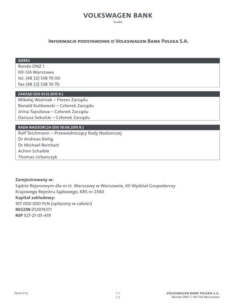 Informacje podstawowe o Volkswagen Bank Polska S.A. ADRES Rondo ONZ 1 00-124 Warszawa tel. (48 22) 538 70 00 fax (48 22) 538 70 70 Zarząd (od 01.12.2015 R.) Mikołaj Woźniak – Prezes Zarządu Ronald Kulikowski – Członek Zarządu Jirina Tapsikova – Członek Zarządu Dariusz Sekulski – Członek Zarządu Rada Nadzorcza (od 30.06.2015 r.) Ralf Teichmann – Przewodniczący Rady Nadzorczej Dr Andreas Bielig Dr Michael Reinhart Achim Schaible Thomas Urbanczyk Zarejestrowany w: Sądzie Rejonowym dla m.st. Warszawy w Warszawie, XII Wydział Gospodarczy Krajowego Rejestru Sądowego, KRS nr 2340 Kapitał zakładowy: 107 000 000 PLN (opłacony w całości) REGON 012974371 NIP 527-21-05-419 158 05 07 16 1/1 [1] VOLKSWAGEN BANK POLSKA S.A. Rondo ONZ 1, 00-124 Warszawa