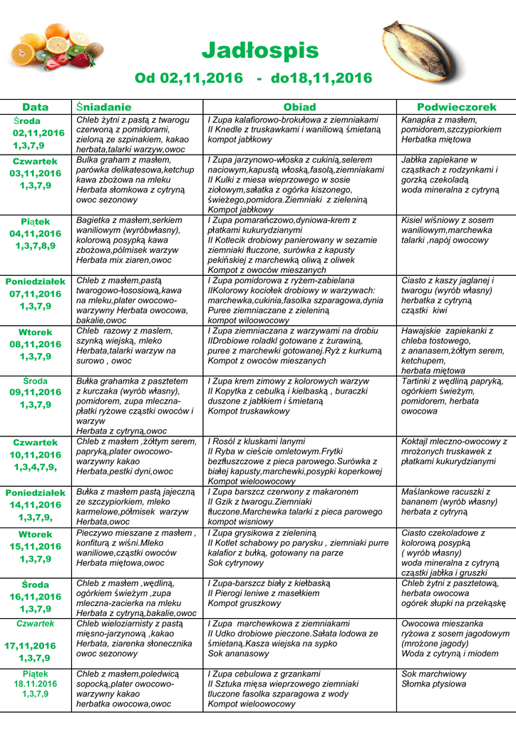 Jadłospis Od 02,11,2016 Data Środa 02,11,2016 1,3,7,9 Czwartek 03,11,2016 1,3,7,9 Piątek 04,11,2016 1,3,7,8,9 Poniedziałek 07,11,2016 1,3,7,9 Wtorek 08,11,2016 1,3,7,9 Środa 09,11,2016 1,3,7,9 Czwartek 10,11,2016 1,3,4,7,9, Poniedziałek 14,11,2016 1,3,7,9, Wtorek 15,11,2016 1,3,7,9 Środa 16,11,2016 1,3,7,9 Czwartek 17,11,2016 1,3,7,9 Piątek 18.11.2016 1,3,7,9 Śniadanie Chleb żytni z pastą z twarogu czerwoną z pomidorami, zieloną ze szpinakiem, kakao herbata,talarki warzyw,owoc Bulka graham z masłem, parówka delikatesowa,ketchup kawa zbożowa na mleku Herbata słomkowa z cytryną owoc sezonowy Bagietka z masłem,serkiem waniliowym (wyróbwłasny), kolorową posypką kawa zbożowa,pólmisek warzyw Herbata mix ziaren,owoc Chleb z masłem,pastą twarogowo-łososiową,kawa na mleku,plater owocowowarzywny Herbata owocowa, bakalie,owoc Chleb razowy z maslem, szynką wiejską, mleko Herbata,talarki warzyw na surowo , owoc Bułka grahamka z pasztetem z kurczaka (wyrób własny), pomidorem, zupa mlecznapłatki ryżowe cząstki owoców i warzyw Herbata z cytryną,owoc Chleb z masłem ,żółtym serem, papryką,plater owocowowarzywny kakao Herbata,pestki dyni,owoc Bułka z masłem pastą jajeczną ze szczypiorkiem, mleko karmelowe,półmisek warzyw Herbata,owoc Pieczywo mieszane z masłem , konfiturą z wiśni.Mleko waniliowe,cząstki owoców Herbata miętowa,owoc - do18,11,2016 Obiad Podwieczorek I Zupa kalafiorowo-brokułowa z ziemniakami II Knedle z truskawkami i waniliową śmietaną kompot jabłkowy Kanapka z masłem, pomidorem,szczypiorkiem Herbatka miętowa I Zupa jarzynowo-włoska z cukinią,selerem naciowym,kapustą włoską,fasolą,ziemniakami II Kulki z miesa wieprzowego w sosie ziołowym,sałatka z ogórka kiszonego, świeżego,pomidora.Ziemniaki z zieleniną Kompot jabłkowy I Zupa pomarańczowo,dyniowa-krem z płatkami kukurydzianymi II Kotlecik drobiowy panierowany w sezamie ziemniaki tłuczone, surówka z kapusty pekińskiej z marchewką oliwą z oliwek Kompot z owoców mieszanych I Zupa pomidorowa z ryżem-zabielana IIKolorowy kociołek drobiowy w warzywach: marchewka,cukinia,fasolka szparagowa,dynia Puree ziemniaczane z zieleniną kompot wiloowocowy I Zupa ziemniaczana z warzywami na drobiu IIDrobiowe roladkl gotowane z żurawiną, puree z marchewki gotowanej.Ryż z kurkumą Kompot z owoców mieszanych Jabłka zapiekane w cząstkach z rodzynkami i gorzką czekoladą woda mineralna z cytryną I Zupa krem zimowy z kolorowych warzyw II Kopytka z cebulką i kielbaską , buraczki duszone z jabłkiem i śmietaną Kompot truskawkowy I Rosól z kluskami lanymi II Ryba w cieście omletowym.Frytki beztłuszczowe z pieca parowego.Surówka z białej kapusty,marchewki,posypki koperkowej Kompot wieloowocowy I Zupa barszcz czerwony z makaronem II Gzik z twarogu.Ziemniaki tłuczone.Marchewka talarki z pieca parowego kompot wisniowy I Zupa grysikowa z zieleniną II Kotlet schabowy po parysku , ziemniaki purre kalafior z bułką, gotowany na parze Sok cytrynowy Kisiel wiśniowy z sosem waniliowym,marchewka talarki ,napój owocowy Ciasto z kaszy jaglanej i twarogu (wyrób własny) herbatka z cytryną cząstki kiwi Hawajskie zapiekanki z chleba tostowego, z ananasem,żółtym serem, ketchupem, herbata miętowa Tartinki z wędliną papryką, ogórkiem świeżym, pomidorem, herbata owocowa Koktajl mleczno-owocowy z mrożonych truskawek z płatkami kukurydzianymi Maślankowe racuszki z bananem (wyrób własny) herbata z cytryną Chleb z masłem ,wędliną, ogórkiem świeżym ,zupa mleczna-zacierka na mleku Herbata z cytryną,bakalie,owoc Chleb wieloziarnisty z pastą mięsno-jarzynową ,kakao Herbata, ziarenka słonecznika owoc sezonowy I Zupa-barszcz biały z kiełbaską II Pierogi leniwe z masełkiem Kompot gruszkowy Ciasto czekoladowe z kolorową posypką ( wyrób własny) woda mineralna z cytryną cząstki jabłka i gruszki Chleb żytni z pasztetową, herbata owocowa ogórek słupki na przekąskę I Zupa marchewkowa z ziemniakami II Udko drobiowe pieczone.Sałata lodowa ze śmietaną.Kasza wiejska na sypko Sok ananasowy Owocowa mieszanka ryżowa z sosem jagodowym (mrożone jagody) Woda z cytryną i miodem Chleb z masłem,poledwicą sopocką,plater owocowowarzywny kakao herbatka owocowa,owoc I Zupa cebulowa z grzankami II Sztuka mięsa wieprzowego ziemniaki tluczone fasolka szparagowa z wody Kompot wieloowocowy Sok marchwiowy Słomka ptysiowa P