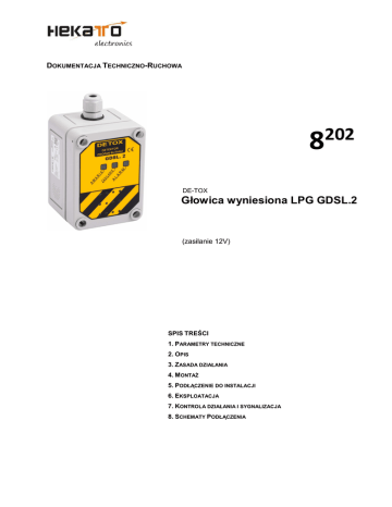 DOKUMENTACJA TECHNICZNO-RUCHOWA 8202 DE-TOX Głowica wyniesiona LPG GDSL.2 (zasilanie 12V) SPIS TREŚCI 1. PARAMETRY TECHNICZNE 2. OPIS 3. ZASADA DZIAŁANIA 4. MONTAŻ 5. PODŁĄCZENIE DO INSTALACJI 6. EKSPLOATACJA 7. KONTROLA DZIAŁANIA I SYGNALIZACJA 8. SCHEMATY PODŁĄCZENIA 1. PARAMETRY TECHNICZNE Zasilanie Napięcie zasilania z jednostki bazowej 12V Pobór mocy GDSL.2 0,3 VA Podłączenia 4 przewodowe sygnalizacja z jednostką bazową GDC.2 2 progi alarmowe+awaria Masa bez opakowania GDSL.2 0,3 kg Wymiary Obudowa zewnętrzna 94 x 65 x 56 mm Metrologia Mierzony gaz Zakres pomiarowy Sensor Ilość progów alarmowych Gazy zakłócające LPG 0..100 % DGW półprzewodnikowy 2: 10% DGW, 20% DGW wodór, metan Wymagania środowiskowe Transportu zakres temp. wilgotność zakres temp. wilgotność Pracy -40..+60°C <95% w.w. -20..+40°C <95% w.w. Warunki techniczne Klasa ochrony IP Klasa niepalności Odporność mechaniczna IP44 zgodnie z EN 60 529 UL94 HB IK07 zgodnie z EN 62 262 Zgodność z Zgodność z wytycznymi UE Dyrektywa niskonapięciowa Dyrektywa RoHS Dyrektywa WEEE Kompatybilność elektromagnetyczna EMV 2006/95/WE 2011/65/EU 2002/96/EC 2004/108/WE Emisja zakłóceń Odporność na zakłócenia Bezpieczeństwo EN 50 081-1 EN 50 082-1 EN 60 730 Standardy 2. OPIS Elektroniczna wyniesiona głowica pomiarowa dla systemu detekcji LPG w garażach zamkniętych, tunelach, parkingach, pomieszczeniach przechowywania butli z gazem. Głowica pomiarowa współpracuje z detektorem bazowym tlenku węgla. Jako wyniesiony czujnik pomiarowy umożliwia wczesne uruchomienie wentylacji bytowej w celu przewietrzenia pomieszczeń, obniżenia nadmiernego stężenia oraz awaryjnego załączenia tablic sygnalizacyjnych, sygnalizatorów akustycznych. Sposób analizy gazów zapewnia racjonalną analizę składu chemicznego powietrza pod kątem zawartości w nim nadmiernych stężeń propanu butanu, bez nadmiernie częstych załączeń instalacji, nie powodując tym samym podwyższonych kosztów eksploatacji. Do działania wyniesionego czujnika niezbędny jest detektor CO GDC.2 stanowiący jego jednostkę bazową. Dane techniczne detektora tlenku węgla zawarto w karcie katalogowej 2223 „GDC.2 detektor tlenku węgla”. HEKATO Electronics Sp. z o.o. 8202PL sierpień 2016 2 Wykonanie niestandardowe zawiera możliwość wykonania dowolnych progów alarmowych wg życzenia zamawiającego z rozdzielczością 1%. Dodatkowo, każdy z progów alarmowych może mieć dowolnie ustawiany czas obliczenia średniej ważonej dla każdego progu oraz wagę. 3. ZASADA DZIAŁANIA Zasada pomiaru bazuje na dyfuzji gazów w środowisku. Ciągłe mieszanie się gazów i przenikanie do elementu pomiarowego detektora umożliwia pomiar wbudowanym sensorem. Gaz obecny w obudowie wykorzystuje również zjawisko efuzji przez część otworów pomiarowych. Otwory pomiarowe umieszczone są od dołu urządzenia. Urządzenie do poprawnej pracy wymaga zamontowanej jednostki bazowej pomiaru tlenku węgla GDC.2. Urządzenie nie jest autonomicznym detektorem, jeśli wymagane są indywidualne detektory LPG. Elektroniczny układ pomiarowy jednostki bazowej analizuje w sposób ciągły skład chemiczny otaczającego środowiska. Pomiary dokonywany są jednocześnie analizując zawartość zarówno tlenku węgla w jednostce bazowej jak i stężenie LPG w głowicy wyniesionej . Pomiar zawartości LPG jest realizowany jako średnia ważona 1 minutowa dla każdego z ustawionych progów alarmowych. Układ pomiarowy posiada również kompensację temperaturą umożliwiając tym samym zastosowanie w szerokim spektrum temperaturowym – np. otwartych garażach podziemnych, tunelach, nieogrzewanych parkingach. 4. MONTAŻ Rozmieszczenie Rozmieszczenie detektorów LPG jest pochodną rozmieszczenia detektorów tlenku węgla. Podobny zasięg identyfikacji gazów pozwala przyjąć rozmieszczenie detektorów tlenku węgla jako miarodajne również do zabezpieczenia obszaru przez detektory LPG. Detektory LPG ze względu na miejsce montażu należy zabezpieczyć przed uszkodzeniami mechanicznymi przy pomocy stalowych osłon zabezpieczających. W rozmieszczaniu należy unikać miejsc bezpośrednio narażonych na silne podmuchy powietrza, m.in. bezpośrednio w strudze wentylatora lub w pobliżu kratek wentylacyjnych. Nie zaleca się montować detektorów również w pustych niszach, zakamarkach czy ślepych korytarzach oraz w miejscach w których utrudniona jest cyrkulacja powietrza. W takim przypadku należy chronić powierzchnie przez takimi przestrzeniami, aby umożliwić wcześniejsze wykrycie nadmiernych stężeń i tym samym umożliwić szybkie usunięcie toksycznych związków, aby nie dopuścić do zalegania gazów w miejscach niewentylowanych. Do obliczeń można przyjąć 250m2 jako maksymalną powierzchnię chronioną jednym detektorem, jednak w przypadku małych powierzchni obliczenia szacunkowe mogą się różnić z rzeczywistym rozmieszczeniem. Montaż Detektor montuje się do podłoża za pomocą dwóch typowych wkrętów / kołków rozporowych. Pozycja pracy detektorów to pionowa powierzchnia. Kotwy nie są dostarczane z detektorem. Montaż detektorów należy wykonać na wysokości 10-15 cm (maksymalnie do 30 cm) od poziomu posadzki. Do podłączenia z jednostką bazową należy użyć dostarczonego przewodu. Sposób podłączenia podano w dalszej części dokumentacji. Przy montażu należy uwzględnić zagłębienia terenu w których może gromadzić się nadmiar gazu oraz inne zakłócające warunki środowiskowe. Do ochrony przed uszkodzeniami mechanicznymi zaleca się zastosowanie stalowych osłon ochronnych. Dostępne akcesoria montażowe: HEKATO Electronics Sp. z o.o. patrz karta akcesoria do systemu DE-TOX 8202PL sierpień 2016 3 Standardowo rysunek wymiarowy umieszczony jest na opakowaniu. Rozstaw otworów montażowych: w prostokącie, poziomo - 50 mm, pionowo 79mm 5. PODŁĄCZENIE DO INSTALACJI Instalację okablowania pomiędzy jednostk