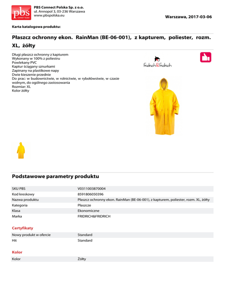 PBS Connect Polska Sp. z o.o. ul. Annopol 3, 03-236 Warszawa www.pbspolska.eu Warszawa, 2017-03-06 Karta katalogowa produktu: Płaszcz ochronny ekon. RainMan (BE-06-001), z kapturem, poliester, rozm. XL, żółty Długi płaszcz ochronny z kapturem Wykonany w 100% z poliestru Powlekany PVC Kaptur ściągany sznurkami Zapinany na plastikowe napy Dwie kieszenie przednie Do prac: w budownictwie, w rolnictwie, w rybołówstwie, w czasie wolnym, do ogólnego zastosowania Rozmiar: XL Kolor żółty Podstawowe parametry produktu SKU PBS V0311003870004 Kod kreskowy 8591806050396 Nazwa produktu Płaszcz ochronny ekon. RainMan (BE-06-001), z kapturem, poliester, rozm. XL, żółty Kategoria Płaszcze Klasa Ekonomiczne Marka FRIDRICH&FRIDRICH Certyfikaty Nowy produkt w ofercie Standard Hit Standard Kolor Kolor Żółty PBS Connect Polska Sp. z o.o. ul. Annopol 3, 03-236 Warszawa www.pbspolska.eu Warszawa, 2017-03-06 Karta katalogowa produktu cd. Płaszcz ochronny ekon. RainMan (BE-06-001), z kapturem, poliester, rozm. XL, żółty Podstawowe parametry produktu Cecha Produkt Płaszcz Typ Ochronny Rodzaj Ekonomiczny Kieszenie 2 Materiał Poliester/pvc W ofercie od 2013-08 Wymiary Rozmiar XL Wspólny słownik zamówień CPV 35113450-8 Jednostki logistyczne Opakowanie 1 20 szt