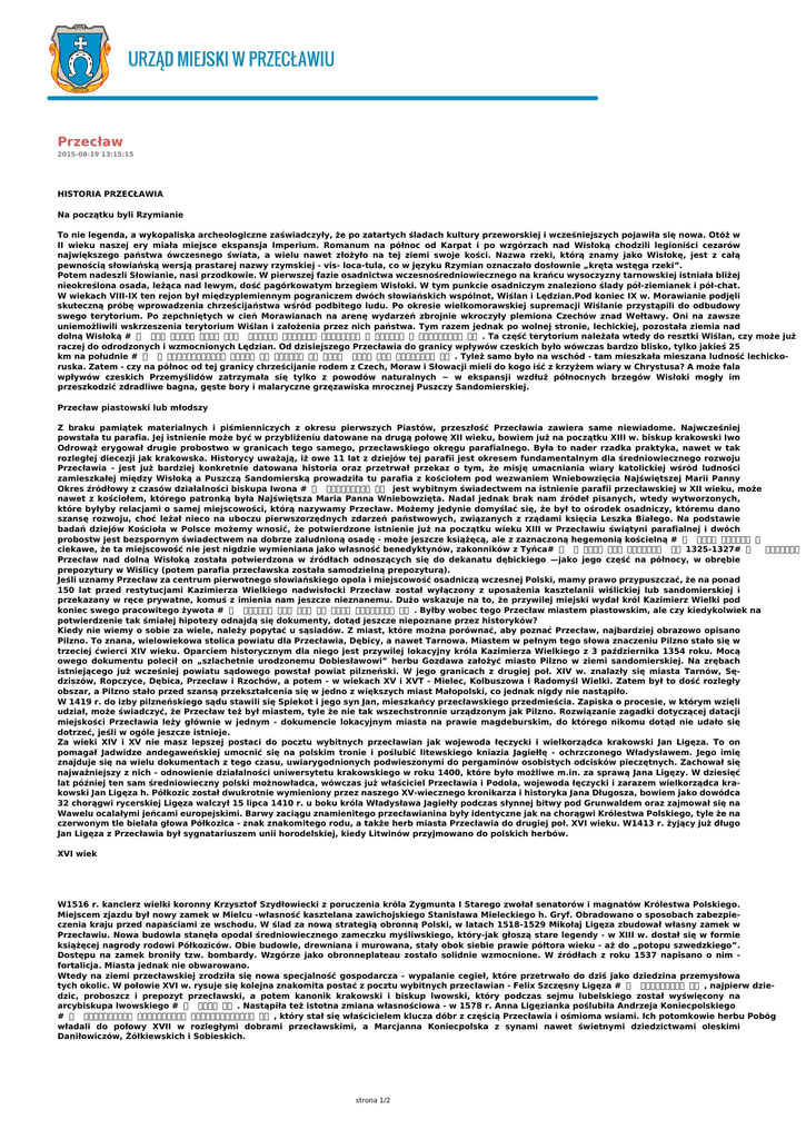 Przecław 2015-08-19 13:15:15 HISTORIA PRZECŁAWIA Na początku byli Rzymianie To nie legenda, a wykopaliska archeologiczne zaświadczyły, że po zatartych śladach kultury przeworskiej i wcześniejszych pojawiła się nowa. Otóż w II wieku naszej ery miała miejsce ekspansja Imperium. Romanum na północ od Karpat i po wzgórzach nad Wisłoką chodzili legioniści cezarów największego państwa ówczesnego świata, a wielu nawet złożyło na tej ziemi swoje kości. Nazwa rzeki, którą znamy jako Wisłokę, jest z całą pewnością słowiańską wersją prastarej nazwy rzymskiej - vis- loca-tula, co w języku Rzymian oznaczało dosłownie „kręta wstęga rzeki”. Potem nadeszli Słowianie, nasi przodkowie. W pierwszej fazie osadnictwa wczesnośredniowiecznego na krańcu wysoczyzny tarnowskiej istniała bliżej nieokreślona osada, leżąca nad lewym, dość pagórkowatym brzegiem Wisłoki. W tym punkcie osadniczym znaleziono ślady pół-ziemianek i pół-chat. W wiekach VIII-IX ten rejon był międzyplemiennym pograniczem dwóch słowiańskich wspólnot, Wiślan i Lędzian.Pod koniec IX w. Morawianie podjęli skuteczną próbę wprowadzenia chrześcijaństwa wśród podbitego ludu. Po okresie wielkomorawskiej supremacji Wiślanie przystąpili do odbudowy swego terytorium. Po zepchniętych w cień Morawianach na arenę wydarzeń zbrojnie wkroczyły plemiona Czechów znad Wełtawy. Oni na zawsze uniemożliwili wskrzeszenia terytorium Wiślan i założenia przez nich państwa. Tym razem jednak po wolnej stronie, lechickiej, pozostała ziemia nad dolną Wisłoką #℣佐⌡⌀琀甀Ⰰ 最搀稀椀攀 搀稀椁嬀 氀攁簁Ԁ 洀椀愀猀琀愀 䐁ᤀ戀椀挀愀Ⰰ 倀爀稀攀持䈀愀眀 椀 䴀椀攀氀攀挀 稀 刀稀漀挀栀漀眀攀洀⌡⍃倣℣. Ta część terytorium należała wtedy do resztki Wiślan, czy może już raczej do odrodzonych i wzmocnionych Lędzian. Od dzisiejszego Przecławia do granicy wpływów czeskich było wówczas bardzo blisko, tylko jakieś 25 km na południe #℣佐⌡⌀眀 瀀爀稀礀戀氀椁簀攀渀椀甀 氀椀渀椀愀 漀搀 倀椀氀稀渀愀 瀀漀 䰀椀猀椁Ԁ 䜀爁ᤀ 瀀漀搀 吀愀爀渀漀眀攀洀⌡⍃倣℣. Tyleż samo było na wschód - tam mieszkała mieszana ludność lechickoruska. Zatem - czy na północ od tej granicy chrześcijanie rodem z Czech, Moraw i Słowacji mieli do kogo iść z krzyżem wiary w Chrystusa? A może fala wpływów czeskich Przemyślidów zatrzymała się tylko z powodów naturalnych ~ w ekspansji wzdłuż północnych brzegów Wisłoki mogły im przeszkodzić zdradliwe bagna, gęste bory i malaryczne grzęzawiska mrocznej Puszczy Sandomierskiej. Przecław piastowski lub młodszy Z braku pamiątek materialnych i piśmienniczych z okresu pierwszych Piastów, przeszłość Przecławia zawiera same niewiadome. Najwcześniej powstała tu parafia. Jej istnienie może być w przybliżeniu datowane na drugą połowę XII wieku, bowiem już na początku XIII w. biskup krakowski Iwo Odrowąż erygował drugie probostwo w granicach tego samego, przecławskiego okręgu parafialnego. Była to nader rzadka praktyka, nawet w tak rozległej diecezji jak krakowska. Historycy uważają, iż owe 11 lat z dziejów tej parafii jest okresem fundamentalnym dla średniowiecznego rozwoju Przecławia - jest już bardziej konkretnie datowana historia oraz przetrwał przekaz o tym, że misję umacniania wiary katolickiej wśród ludności zamieszkałej między Wisłoką a Puszczą Sandomierską prowadziła tu parafia z kościołem pod wezwaniem Wniebowzięcia Najświętszej Marii Panny Okres źródłowy z czasów działalności biskupa Iwona #℣佐⌡⌀㈀㠀ⴀ㈀㈀㤀⌡⍃倣℣ jest wybitnym świadectwem na istnienie parafii przecławskiej w XII wieku, może nawet z kościołem, którego patronką była Najświętsza Maria Panna Wniebowzięta. Nadal jednak brak nam źródeł pisanych, wtedy wytworzonych, które byłyby relacjami o samej miejscowości, którą nazywamy Przecław. Możemy jedynie domyślać się, że był to ośrodek osadniczy, któremu dano szansę rozwoju, choć leżał nieco na uboczu pierwszorzędnych zdarzeń państwowych, związanych z rządami księcia Leszka Białego. Na podstawie badań dziejów Kościoła w Polsce możemy wnosić, że potwierdzone istnienie już na początku wieku XIII w Przecławiu świątyni parafialnej i dwóch probostw jest bezspornym świadectwem na dobrze zaludnioną osadę - może jeszcze książęcą, ale z zaznaczoną hegemonią kościelną #℣佐⌡⌀瀀爀稀礀 漀欀愀稀樀椀 ciekawe, że ta miejscowość nie jest nigdzie wymieniana jako własność benedyktynów, zakonników z Tyńca#℣䍐⌡⌀⸀ 圀 氀愀琀 瀀稀渀椀攀樀 ⌡⍏倣℣1325-1327#℣䍐⌡⌀ 瀀愀爀愀昀椀a Przecław nad dolną Wisłoką została potwierdzona w źródłach odnoszących się do dekanatu dębickiego —jako jego część na północy, w obrębie prepozytury w Wiślicy (potem parafia przecławska została samodzielną prepozyturą). Jeśli uznamy Przecław za centrum pierwotnego słowiańskiego opola i miejscowość osadniczą wczesnej Polski, mamy prawo przypuszczać, że na ponad 150 lat przed restytucjami Kazimierza Wielkiego nadwisłocki Przecław został wyłączony z uposażenia kasztelanii wiślickiej lub sandomierskiej i przekazany w ręce prywatne, komuś z imienia nam jeszcze nieznanemu. Dużo wskazuje na to, że przywilej miejski wydał król Kazimierz Wielki pod koniec swego pracowitego żywota #℣佐⌡⌀樀攁簀攀氀椀 渀椀攀 漀渀Ⰰ 琀漀 樀攀最漀 渀愀猀琁ᤀ瀀挀礀⌡⍃倣℣. Byłby wobec tego Przecław miastem piastowskim, ale czy kiedykolwiek na potwierdzenie tak śmiałej hipotezy odnajdą się dokumenty, dotąd jeszcze niepoznane przez historyków? Kiedy nie wiemy o sobie za wiele, należy popytać u sąsiadów. Z miast, które można porównać, aby poznać Przecław, najbardziej obrazowo opisano Pilzno. To znana, wi