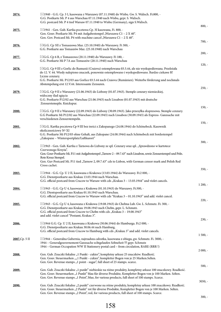 2074. 1940 - G.G. Cp. 3 I, kasowana z Warszawy (07.11.1940) do Wisbu. Gw. S. Walisch. Fi:800, G.G. Postkarte Mi. P 4 aus Warschau 07.11.1940 nach Wisbu, gepr. S. Walisch. G.G. postcard Mi. P 4 tied Warsaw 07.11.1940 to Wisbu (Germany), sign S.Walisch. 2075. 1941 - Gen. Gub. Kartka pocztowa Cp. 3I kasowana, Fi. 800, Gen. Gouv. Postkarte Mi. P4 mit Aufgabestempel „Warszawa C1 – 2 X 40“. Gen. Gov. Postcard Mi. P4 with machine cancel „Warszawa C1 – 2 X 40“. 2076. G.G. Cp 5II z Tomaszowa Maz. (25.10.1940) do Warszawy. Fi 300, G.G. Postkarte aus Tomaszów Maz. (25.10.1940) nach Warschau 2077. G.G. Cp 6 B, z Tomaszowa (20.11.1940) do Warszawy. Fi 180, G.G. Postkarte Mi P 7A aus Tomaszów (20.11.1940) nach Warschau 2078. G.G. Cp 9 III z Gorlic do Rumunii (Craiova) ostemplowana 03.5.44, ale nie wyekspediowana. Przeleżała do 12. V. 44. Wtedy nalepiono znaczek, ponownie ostemplowano i wyekspediowano. Bardzo ciekawe R! Liczne cenzury. G.G. Postkarte Mi. P12/03 aus Gorlice 03.5.44 nach Craiova (Rumänien). Weiterbe förderung und nochmals Abstempelung erst 12.V.44. Interessante Zensuren. 2079. G.G. Cp 9 II z Warszawy (21.06.1943) do Lizbony (01.07.1943). Stemple cenzury niemieckiej, widoczny ślad zgięcia G.G. Postkarte P12/02 aus Warschau (21.06.1943) nach Lissabon (01.07.1943) mit deutsche Zensurstemepln. Knickspur. 2080. G.G. Cp 9 II z Warszawy (22.09.1943) do Lizbony (30.09.1943). Jako przesyłka ekspresowa. Stemple cenzury. G.G Postkarte Mi P12/02 aus Warschau (22.09.1943) nach Lissabon (30.09.1943) als Express- Ganzsache mit verschiedenen Zensurstempeln. 2081. G.G. Kartka pocztowa Cp 9 III bez treści z Zakopanego (24.08.1944) do Schönebeck. Kasownik okolicznościowy Nº XI G.G. Postkarte Mi P12/03 ohne Gehalt, aus Zakopane (24.08.1944) nach Schönebeck mit Sordestempel „Zakopane – Wintersportplatz/Luftkurort” 2082. 1943 - Gen. Gub. Kartka z Tarnowa do Lizbony ze spl. Cenzury oraz spl. „Sprawdzono w kartotece Czerwonego Krzyża”. Gen. Gouv Postkarte Mi. P.11 mit Aufgabestempel „Tarnow 2 – 09.7.43“ nach Lissabon, sowie Zensurstempel und Poln. Rote Kreuz Stempel. Gen. Guv Postcard Mi. P11 tied „Tarnow 2, 09.7.43“ cds to Lisbon, with German censor mark and Polish Red Cross cachet. 2083. 1944 - G.G. Cp. U 2 II, kasowana z Krakowa (13.03.1944) do Warszawy. Fi:2 000, G.G. Dienstpostkarte aus Krakau 13.03.1944 nach Warschau. G.G. official postcard from Cracow to Warsaw with cds „Krakau 3 – 13.03.1944” and violet cancels. 2084. 1943 - G.G. Cp U 4, kasowana z Krakowa (01.10.1943) do Warszawy. Fi:300, G.G. Dientspostkarte aus Krakau 01.10.1943 nach Warschau. G.G. official postcard from Cracow to Warsaw with cds “Krakau 3 – 01.10.1943” and add. violet cancel. 2085. 1943 - G.G. Cp U 4, kasowana z Krakowa (19.08.1943) do Chełma Lub. Gw. L. Schmutz. Fi: 300, G.G. Dienstpostkarte aus Krakau 19.08.1943 nach Chełm, gepr. L. Schmutz. G.G. official postcard from Cracow to Chełm with cds „Krakau 3 – 19.08.1943“ and add. violet cancel “Postamt, Krakau 3”. 2086. 1944 G.G. Cp. U 2 II, kasowana z Krakowa (30.06.1944) do Hamburga. Fi:2 000, G.G. Dienstpostkarte aus Krakau 30.06.44 nach Hamburg, G.G. official postcard from Cracow to Hamburg with cds „Krakau 3” and add. violet cancels. 2087.Cp. 5 II 1944 – Generalna Gubernia, najrzadsza całostka, kasowana z obiegu, gw. Schmutz. Fi. 3000, 1944 – Generalgouvernement Ganzsache echtgelaufen Seltneheit !!! gepr. Schmutz 1944 – German Occupation WW II Stationery postal card – from circulation, RARE (RRR !) 2088. Gen. Gub. Znaczki fiskalne „1 Punkt - cukier”, kompletny arkusz 25 znaczków. Rzadkość. Gen. Gouv. Steuermarken „„1 Punkt - cukier”, kompletter Bogen von je 25 Marken.Selten. Gen. Gov. Revenue stamps „1 point - sugar”, full sheet of 25 stamps. scarce. 2089. Gen. Gub. Znaczki fiskalne „1 punkt” niebieskie na różne produkty, kompletny arkusz 100 znaczkowy. Rzadkość. Gen. Gouv. Steuermarken „1 Punkt” blau für diverse Produkte, Kompletter Bogen von je 100 Marken. Selten. Gen. Gov. Revenue stamps „1 Point”, blue, for various products, full sheet of 100 stamps. Scarce. 2090. Gen. Gub. Znaczki fiskalne „2 punkt” czerwone na różne produkty, kompletny arkusz 100 znaczkowy. Rzadkość. Gen. Gouv. Steuermarken „2 Punkt” rot für diverse Produkte, Kompletter Bogen von je 100 Marken. Selten. Gen. Gov. Revenue stamps „2 Point”, red, for various products, full sheet of 100 stamps. Scarce. 800, - 700, - 200, - 120, - 250, - 150, - 150, - 300, - 350, - 1 200, - 220, - 230, - 1 500, - 2 000, - 500, - 3050, - 300, - 158