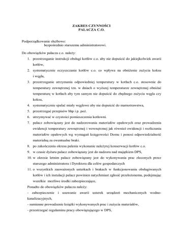 ZAKRES CZYNNOŚCI PALACZA C.O. Podporządkowanie służbowe: bezpośrednio starszemu administratorowi. Do obowiązków palacza c.o. należy: 1. przestrzeganie instrukcji obsługi kotłów c.o. aby nie dopuścić do jakiejkolwiek awarii kotłów, 2. systematycznie oczyszczanie kotłów c.o. co wpływa na obniżenie zużycia koksu i węgla, 3. przestrzeganie utrzymania odpowiedniej temperatury w kotłach c.o. stosownie do temperatury zewnętrznej tzn. w dniach o wyższej temperaturze zewnętrznej obniżać temperaturę w kotłach aby tym samym nie dopuścić do zbędnego zużycia węgla czy koksu, 4. systematycznie spalać miały węglowe aby nie dopuścić do marnotrawstwa, 5. przestrzegać przepisów bhp i p. poż. 6. utrzymywać w czystości pomieszczenia kotłowni. 7. palacz zobowiązany jest do nadzorowania materiałów opałowych oraz prowadzenia ewidencji temperatury zewnętrznej i wewnętrznej jak również ewidencji i rozliczania materiałów opałowych wg wymagań księgowości Domu i ponosi odpowiedzialność materialną za ewentualne braki. 8. po zakończeniu okresu palenia wykonanie należytej konserwacji kotłów c.o. 9. w czasie dyżuru palacz zobowiązany jest do nadzoru nad majątkiem DPS, 10. w okresie letnim palacz zobowiązany jest do wykonywania prac zleconych przez starszego administratora i Dyrektora dla celów gospodarczych 11. o wszystkich zauważonych usterkach i brakach w funkcjonowaniu obsługiwanych kotłów i ich instalacji palacz powinien natychmiast zgłosić przełożonemu, podejmując wszelkie możliwe środki zabezpieczające, Ponadto do obowiązków palacza należy: - zabezpieczenie i usuwanie awarii usterek urządzeń mechanicznych wodnokanalizacyjnych, - sumienne prowadzenie książki wykonywanych prac i zużycia materiałów, - przestrzegać regulaminu pracy obowiązującego w DPS, - wykonywać wszelkie prace zlecone przez dyrektora DPS. Zatwierdził: Przyjąłem do wiadomości i zobowiązuję się do jego przestrzegania oraz przestrzegania tajemnicy służbowej ……………………………. ( podpis pracownika)