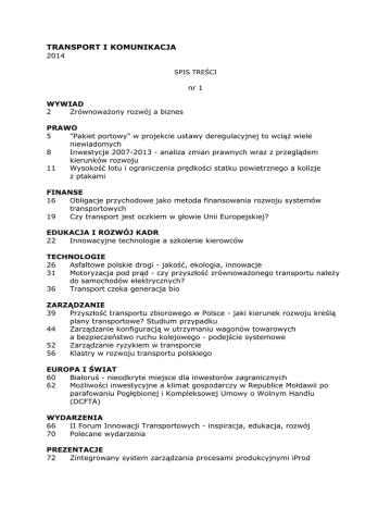 TRANSPORT I KOMUNIKACJA 2014 SPIS TREŚCI nr 1 WYWIAD 2 Zrównoważony rozwój a biznes PRAWO 5 "Pakiet portowy" w projekcie ustawy deregulacyjnej to wciąż wiele niewiadomych 8 Inwestycje 2007-2013 - analiza zmian prawnych wraz z przeglądem kierunków rozwoju 11 Wysokość lotu i ograniczenia prędkości statku powietrznego a kolizje z ptakami FINANSE 16 Obligacje przychodowe jako metoda finansowania rozwoju systemów transportowych 19 Czy transport jest oczkiem w głowie Unii Europejskiej? EDUKACJA I ROZWÓJ KADR 22 Innowacyjne technologie a szkolenie kierowców TECHNOLOGIE 26 Asfaltowe polskie drogi - jakość, ekologia, innowacje 31 Motoryzacja pod prąd - czy przyszłość zrównoważonego transportu należy do samochodów elektrycznych? 36 Transport czeka generacja bio ZARZĄDZANIE 39 Przyszłość transportu zbiorowego w Polsce - jaki kierunek rozwoju kreślą plany transportowe? Studium przypadku 44 Zarządzanie konfiguracją w utrzymaniu wagonów towarowych a bezpieczeństwo ruchu kolejowego - podejście systemowe 52 Zarządzanie ryzykiem w transporcie 56 Klastry w rozwoju transportu polskiego EUROPA I ŚWIAT 60 Białoruś - nieodkryte miejsce dla inwestorów zagranicznych 62 Możliwości inwestycyjne a klimat gospodarczy w Republice Mołdawii po parafowaniu Pogłębionej i Kompleksowej Umowy o Wolnym Handlu (DCFTA) WYDARZENIA 66 II Forum Innowacji Transportowych - inspiracja, edukacja, rozwój 70 Polecane wydarzenia PREZENTACJE 72 Zintegrowany system zarządzania procesami produkcyjnymi iProd nr 2 WYWIAD 2 Główne rynki zagraniczne Track Tec PRAWO 4 Wyrok Trybunału Sprawiedliwości UE nie zatrzyma błędnego koła w polskiej kolei FINANSE 10 Horizon 2020 - czy to są dotacje dla polskich firm? 13 Obligacje Przychodowe ratunkiem dla samorządowych dróg? EDUKACJA I ROZWÓJ KADR 18 Symulatory pojazdów kolejowych w procesie kształcenia i kwalifikacji maszynistów i kandydatów na maszynistów TECHNOLOGIE 22 Dwie warszawskie nitki i co dalej? 29 Nowoczesne rozwiązania w transporcie ciężarowym ZARZĄDZANIE 32 Oceny operatorów transportowych a potrzeby Klienta, czyli po co to komu? 35 Dobre praktyki wyboru trybów oraz zasad prawnych tworzenia i zawierania umów o świadczenie usług PTZ 38 Strategiczne wyzwania przed transportem lotniczym w Polsce 40 Innowacje marketingowe w transporcie PRZEGLĄD STATYSTYCZNY 2013 43 Transport w Polsce - przegląd statystyczny 2013 EUROPA I ŚWIAT 50 Rozwój nowoczesnego transportu kolejowego w Maroko WYDARZENIA 55 Warsztat "Sustainability in business - osiągnij korzyści z odpowiedzialnego rozwoju" 56 IX Konferencja LOGICAL - o przyszłości logistyki w Europie 57 Transport Week 2014 58 VII Międzynarodowa Konferencja i Wystawa LOTNISKO 2014 59 Bezpieczeństwo na kolei a stan infrastruktury kolejowej 60 Polecane wydarzenia PREZENTACJE 64 Zintegrowany system ostrzegania przed wywrotem dla maszyn pracujących na kolei 66 Nowa generacja rozjazdów szynowych otrzymanych metodą odlewania ze staliwa bainitycznego 19 Rury HOBAS OD3600mm przeciskane pod torami kolejowymi w Gdańsku nr 3 FELIETON 2 Prosto z amerykańskiego korka! PRAWO 4 Inteligentne systemy transportowe zbyt inteligentne dla Polski? 9 Kontrola biletów - aspekty prawne i praktyczne FINANSE 12 Droga rozwoju systemu pobierania opłat za korzystanie z autostrad w Polsce - analiza możliwych scenariuszy rozwoju TECHNOLOGIE 18 Autostradowe przyspieszenie - gdzie szukać rozwiązań na szybsze realizacje 23 Czy zatoki autobusowe poprawiają bezpieczeństwo? 26 Wypadki z udziałem zwierząt w transporcie kolejowym 29 Systemy komunikacji pojazd-infrastruktura i pojazd-pojazd 32 "Nie ma takiej paczki" o niepewnej drodze przesyłki ZARZĄDZANIE 35 Logistyka w przyszłości - potrzebni specjaliści systemowi – refleksje o seminarium naukowo – praktycznym ALK, CILT POLSKA, INTL, CATI i Klastra Innowacji Transportowych 38 Marynarka Wojenna RP na straży morskich szlaków 41 Polski przemysł stoczniowy dostosowuje się do nowych wyzwań 43 Dobra infrastruktura = dobry transport 46 Powoływanie inicjatyw klastrowych, a skuteczność komercjalizacji prac B+R w sektorze TSL PRZEGLĄD STATYSTYCZNY 2013 52 Zatłoczenie miast Polski i Europy - Ranking 2013 EUROPA I ŚWIAT 55 Uwarunkowania sektora transportu Republiki Mołdawii jako potencjalnego partnera handlowego i beneficjenta inwestycji zagranicznych WYDARZENIA 58 Targi INTERTRAFFIC AMSTERDAM - polska technologia ITS na światowej wystawie 59 GasShow2014 - czy niektórym przedstawicielom wagi ciężkiej w branży grozi zmiana warty? 62 MOTOR SHOW 2014 - poznańskie, motoryzacyjne show 64 Kolej a gospodarka 65 INFRASZYN 2014 66 Miasto i Transport 2014 68 Forum Transportu Intermodalnego - FRACHT 2014 69 Nasze patronaty PREZENTACJE 70 Smart Hybrid - rynek transportowy, a energia odnawialna nr 4 WYWIAD 2 O Pendolino w trzech aktach PRAWO 8 Prawo zamówień publicznych - ustawa skazana na zastrzeżenia 9 Zamawiający nie może w sposób złudny dopuszczać rozwiązania równoważnego FINANSE 11 Pendolino - trudna sprawa EDUKACJA I ROZWÓJ KADR 15 Jak zaistnieć na rynkach zagranicznych - zarządzanie kontentem wielojęzycznym TECHNOLOGIE 18 Porównanie izolatorów ceramicznych i kompozytowych w zastosowaniach kolejowych 21 Systemy ITS w gminach województwa śląskiego - analiza badań ankietowych 26 Samochód służbowy - o istocie i randze motoryzacyjnego narzędzia pracy dla firmy 29 Zielony transport, czyli czas na bezemisyjną mobilność ZARZĄDZANIE 31 Specjalizacja regionów, a regionalne systemy transportu kombinowanego 36 O możliwej współpracy biznesu i nauki - NEEL wspiera młodych naukowców 38 "Elektroniczne systemy wspomagania jazdy - czy da się zastąpić zdrowy rozsądek i doświadczenie kierowcy?" 42 Śląski Klaster Transportu Miejskiego - mechanizm wsparcia dla jednostek samorządu terytorialnego RECENZJA 45 Technologie Transportowe - instrument rozwoju transportu PRZEGLĄD STATYSTYCZNY 2013 48 Czynniki rozwoju systemu pu
