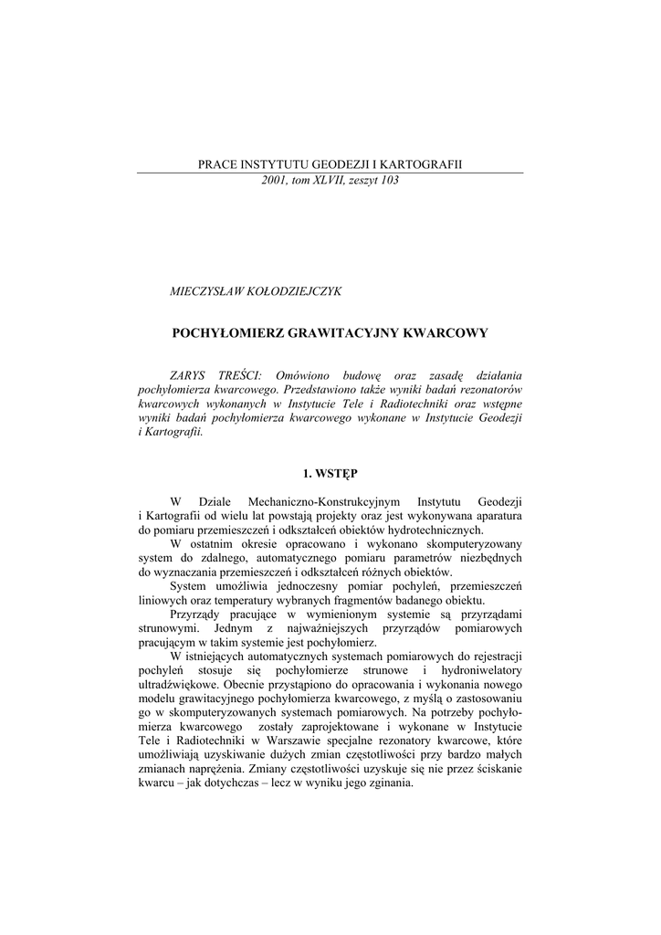 PRACE INSTYTUTU GEODEZJI I KARTOGRAFII 2001, tom XLVII, zeszyt 103 MIECZYSŁAW KOŁODZIEJCZYK POCHYŁOMIERZ GRAWITACYJNY KWARCOWY ZARYS TREŚCI: Omówiono budowę oraz zasadę działania pochyłomierza kwarcowego. Przedstawiono także wyniki badań rezonatorów kwarcowych wykonanych w Instytucie Tele i Radiotechniki oraz wstępne wyniki badań pochyłomierza kwarcowego wykonane w Instytucie Geodezji i Kartografii. 1. WSTĘP W Dziale Mechaniczno-Konstrukcyjnym Instytutu Geodezji i Kartografii od wielu lat powstają projekty oraz jest wykonywana aparatura do pomiaru przemieszczeń i odkształceń obiektów hydrotechnicznych. W ostatnim okresie opracowano i wykonano skomputeryzowany system do zdalnego, automatycznego pomiaru parametrów niezbędnych do wyznaczania przemieszczeń i odkształceń różnych obiektów. System umożliwia jednoczesny pomiar pochyleń, przemieszczeń liniowych oraz temperatury wybranych fragmentów badanego obiektu. Przyrządy pracujące w wymienionym systemie są przyrządami strunowymi. Jednym z najważniejszych przyrządów pomiarowych pracującym w takim systemie jest pochyłomierz. W istniejących automatycznych systemach pomiarowych do rejestracji pochyleń stosuje się pochyłomierze strunowe i hydroniwelatory ultradźwiękowe. Obecnie przystąpiono do opracowania i wykonania nowego modelu grawitacyjnego pochyłomierza kwarcowego, z myślą o zastosowaniu go w skomputeryzowanych systemach pomiarowych. Na potrzeby pochyłomierza kwarcowego zostały zaprojektowane i wykonane w Instytucie Tele i Radiotechniki w Warszawie specjalne rezonatory kwarcowe, które umożliwiają uzyskiwanie dużych zmian częstotliwości przy bardzo małych zmianach naprężenia. Zmiany częstotliwości uzyskuje się nie przez ściskanie kwarcu – jak dotychczas – lecz w wyniku jego zginania. 182 Mieczysław Kołodziejczyk Wyniki badań rezonatorów kwarcowych, modelu pochyłomierza kwarcowego oraz wnioski wynikające z tych badań przedstawiono w niniejszym artykule. 2. BUDOWA POCHYŁOMIERZA KWARCOWEGO Kable EZP X Bolec 2 3 3 4 5 13 7 13 6 E E 1 8 9 11 12 10 12 X Rys. 1. Pochyłomierz kwarcowy Pochyłomierz grawitacyjny kwarcowy 183 Pochyłomierz kwarcowy (rys. 1) składa się z dwóch wahadeł 8 i 9 i dwóch rezonatorów kwarcowych 4 i 5 z układami elektronicznymi. Wahadła poprzez zawieszki 3 i wieszak 2 połączone są z górną częścią korpusu 1, natomiast rezonatory są wklejone w specjalne oprawki 6 i 7, które poprzez wsporniki są zamocowane przesuwnie do korpusu. Przesuwne zamocowanie rezonatorów kwarcowych umożliwia takie ich usytuowanie względem wahadeł, które odpowiada środkowi zakresu pracy rezonatora przy korpusie ustawionym na poziomej płycie i przy pionowym usytuowaniu wahadeł. Rezonatory kwarcowe stykają się z wahadłami poprzez kulki. Zmiana położenia oprawek z rezonatorami względem wahadeł wpływa na zmianę naprężenia rezonatorów i jednocześnie na zmianę ich częstotliwość drgań. Wahadła zakończone są obciążnikami 10 i 11, których specjalna konstrukcja umożliwia umieszczenie jednego obciążnika w drugim. Opisana konstrukcja wahadeł z obciążnikami umożliwia unieruchomienie wahadeł w stosunku do korpusu i rezonatorów kwarcowych. Pozycję taką otrzymujemy przez wkręcenie do oporu wkrętów aretujących 12. 3. OPIS CZUJNIKA KWARCOWEGO W opisywanym pochyłomierzu kwarcowym zastosowano czujnik z rezonatorem akustycznej fali powierzchniowej AFP. Czujnik został wykonany w kształcie płytki o wymiarach 50x6,5x0,5 mm i wklejony jednym końcem do specjalnej oprawki. Kształt i sposób zamocowania sprawia, że płytkę kwarcową przy obliczeniach możemy traktować jako belkę zamocowaną jednostronnie (rys. 2), której naprężenia przy powierzchni belki określa wzór. T11 6FL w(2h)2 gdzie: F - siła działająca, L - długość belki, w - szerokość belki, h - grubość belki. Zmiana częstotliwości rezonatora AFP w funkcji naprężeń w płytce jest proporcjonalna do tych naprężeń wg zależności: ΔF s 11T11 F0 s gdzie: α11 - współczynnik czułości. 184 Mieczysław Kołodziejczyk płytka kwarcowa cięcia ST struktura rezonatora AFP F kauczuk silikonowy podstawa metalowa Rys. 2. Czujnik kwarcowy W Instytucie Tele i Radiotechniki wykonano badania czujnika, w którym wykorzystano płytkę kwarcową cięcia ST ze strukturą rezonatora AFP. Płytka o wymiarach 23x6,5x1 mm była przyklejona do podstawy klejem kauczukowym. Badania wykazały, że czułość takiego czujnika wynosi ok. 120Hz/G, a maksymalne obciążenie płytki wynosiło 1000 G. Wyniki badań przedstawiono na wykresie. 140 000 120 000 80 000 Seria1 60 000 40 000 20 000 masa wody [g] Rys. 3. Charakterystyka czujnika obciążanego wodą 1000 900 800 700 600 500 400 300 200 100 0 0 df[Hz] 100 000 185 Pochyłomierz grawitacyjny kwarcowy W Instytucie Tele i Radiotechniki wykonano specjalny przyrząd (rys. 4), który posłużył do wykonania powyższych badań wpływu nacisku na częstotliwość drgań rezonatora. sprężyny płaskie szalka kolumna płytka kwarcowa podstawa podkładki Rys. 4. Schemat przyrządu do badania charakterystyki czujnika siły 186 Mieczysław Kołodziejczyk Na podstawie opisanych badań dla modelu pochyłomierza kwarcowego opracowanego w IGiK wykonano płytki kwarcowe cięcia ST o zmodyfikowanej orientacji (Q = 39˚37”) i wymiarach 50x6,5x0,5 mm oraz 50x 6,5x 0,3 mm. Tak wykonane płytki kwarcowe, zostały poddane obróbce szlifowania i trawienia w nasyconym roztworze kwaśnego fluorku amonu o temperaturze 500C, a następnie wypolerowane jednostronnie. Na płytkach wykonano fotolitograficznie struktury rezonatorowe o częstotliwości 165 MHz. Rezonatory kwarcowe o przedstawionych powyżej parametrach powinny cechować się czułością ok. 700 Hz/G. 4. ZASADA DZIAŁANIA POCHYŁOMIERZA KWARCOWEGO Pochyłomierze służą do pomiaru zmian nachylenia badanego obiektu. Każda zmiana nachylenia obiektu powoduje odchylenie bolca stabilizacyjn