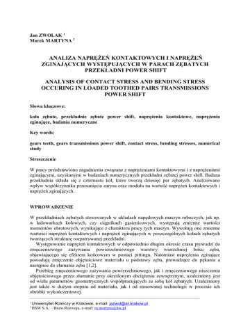 Jan ZWOLAK 1 Marek MARTYNA 2 ANALIZA NAPRĘŻEŃ KONTAKTOWYCH I NAPRĘŻEŃ ZGINAJĄCYCH WYSTĘPUJĄCYCH W PARACH ZĘBATYCH PRZEKŁADNI POWER SHIFT ANALYSIS OF CONTACT STRESS AND BENDING STRESS OCCURING IN LOADED TOOTHED PAIRS TRANSMISSIONS POWER SHIFT Słowa kluczowe: koła zębate, przekładnie zębate power shift, naprężenia kontaktowe, naprężenia zginające, badania numeryczne Key words: gears teeth, gears transmissions power shift, contact stress, bending stresses, numerical study Streszczenie W pracy przedstawiono zagadnienia związane z naprężeniami kontaktowymi i z naprężeniami zginającymi, uzyskanymi w badaniach numerycznych przekładni zębatej power shift. Badana przekładnia składa się z czternastu kół, które tworzą dziesięć par zębatych. Analizowano wpływ współczynnika przesunięcia zarysu oraz modułu na wartość naprężeń kontaktowych i naprężeń zginających. WPROWADZENIE W przekładniach zębatych stosowanych w układach napędowych maszyn roboczych, jak np. w ładowarkach kołowych, czy ciągnikach gąsienicowych, występują zmienne wartości momentów obrotowych, wynikające z charakteru pracy tych maszyn. Wywołują one zmienne wartości naprężeń kontaktowych i naprężeń zginających w poszczególnych kołach zębatych tworzących strukturę rozpatrywanej przekładni. Występowanie naprężeń kontaktowych w odpowiednio długim okresie czasu prowadzi do zmęczeniowego zużywania powierzchniowego warstwy wierzchniej boku zęba, objawiającego się efektem końcowym w postaci pittingu. Natomiast naprężenia zginające powodują zmęczenie objętościowe materiału u podstawy zęba, prowadzące do pękania a następnie do złamania zęba [1,2]. Przebieg zmęczeniowego zużywania powierzchniowego, jak i zmęczeniowego niszczenia objętościowego przez złamanie przy określonym obciążeniu zewnętrznym, uzależniony jest od wielu parametrów geometrycznych współpracujących ze sobą kół zębatych. Uzależniony jest także w dużym stopniu od materiału, jak i od stosowanej technologii w procesie ich obróbki wykończeniowej. ----------------------------------------------------------------------------------------------------------------------------------------------------------------------------------------------------------------1 2 Uniwersytet Rolniczy w Krakowie, e-mail: [email protected] HSW S.A. – Biuro Rozwoju, e-mail: [email protected] Oprócz wymienionych czynników wpływających na zmęczeniowe zużywanie powierzchniowe, należy jeszcze dodać warunki smarowania występujące w strefie międzyzębnej współpracujących kół zębatych podczas eksploatacji. W prezentowanej pracy wykorzystano wyniki doświadczalnych badań własnych w zakresie zmęczeniowej wytrzymałości powierzchniowej σH lim oraz w zakresie zmęczeniowej wytrzymałości objętościowej σF lim. Wyznaczone wartości σH lim i σF lim wykorzystano w systemie komputerowym projektowania przekładni zębatych. System ten umożliwia prowadzenie obliczeń geometrycznych i wytrzymałościowych oraz ich optymalizację ze względu na wybrane kryteria. W dalszej części pracy rozważane będą jedynie badania numeryczne, z pominięciem badań doświadczalnych. PRZEDMIOT BADAŃ Badania numeryczne prowadzono na 8-stopniowej przekładni zębatej power shift, przeznaczonej do układu napędowego ładowarki kołowej. Schemat kinematyczny w układzie osiowym rozważanej przekładni przedstawiono na rysunku 1. Rys.1. Schemat kinematyczny w układzie osiowym przekładni zębatej power shift Fig. 1. Kinematic diagram in axial gears transmissions power shift Symbole występujące na rysunku 1 oznaczają: z1, z2,..., z14 – koła zębate, AB, CD,..., MN – wałki, P – sprzęgło kierunkowe jazdy do przodu, W – sprzęgło kierunkowe jazdy do tyłu, S1, ..., S4 – sprzęgła do włączania poszczególnych biegów. W celu ułatwienia zapisu łańcucha kinematycznego utworzonego przez koła zębate na poszczególnych biegach, przedstawiono schemat kinematyczny w układzie promieniowym rozpatrywanej przekładni na rysunku 2. Rys.2. Schemat kinematyczny w układzie promieniowym przekładni zębatej power shift Fig. 2. Kinematic diagram in radian gears transmissions powers shift Na podstawie rysunku 1 i 2 utworzone pary zębate z odpowiednich kół, będących w ciągłym zazębieniu, dają się zapisać jako przełożenia na poszczególnych biegach: z3 z5 z9 z13 * * * z1 z3 z7 z9 z z z z i 2 = 3 * 10 * 9 * 13 z1 z3 z12 z9 z z z z i3 = 3 * 5 * 8 * 13 z1 z3 z6 z9 z z z z i 4 = 3 * 10 * 8 * 13 z1 z3 z11 z9 i1 = z14 z4 z5 z9 z13 * * * * z2 z14 z3 z7 z9 z z z z z i6 = 14 * 4 * 10 * 9 * 13 z2 z14 z3 z12 z9 z z z z z i7 = 14 * 4 * 5 * 8 * 13 z2 z14 z3 z6 z9 z z z z z i8 = 14 * 4 * 10 * 8 * 13 z2 z14 z3 z11 z9 i5 = (1) Przełożenia całkowite: i1, i2, i3, i4, będące iloczynem przełożeń elementarnych poszczególnych par zębatych, odnoszą się do biegów jazdy do przodu. Natomiast przełożenia: i 5, i6, i7, i8, dotyczą biegów jazdy do tyłu. Wartości liczbowe przełożeń elementarnych i całkowitych (wzór 1) wykazujące różnice na poszczególnych biegach sprawiają, że zmieniają się wartości liczbowe naprężeń kontaktowych i naprężeń zginających tej samej pary zębatej, występującej w łańcuchu kinematycznym poszczególnych biegów. SYSTEM KOMPUTEROWY W ANALZIE NAPRĘŻEŃ KONTAKTOWYCH NAPRĘŻEŃ ZGINAJĄCYCH I Podstawowe zagadnienia związane z obliczeniami przekładni zębatych mogą być analizowane za pomocą autorskiego systemu komputerowego [3]. System ten umożliwia prowadzenie obliczeń geometrycznych i wytrzymałościowych z optymalizacją wielokryterialną, jak też obliczeń bez optymalizacji. Poprzez odpowiednie zadawanie danych w programie można przeprowadzać obliczenia dla różnych zestawów zmiennych decyzyjnych. W rozpatrywanym przypadku obliczenia prowadzono traktując jako zmienne decyzyjne: moduł oraz współczynniki przesunięcia