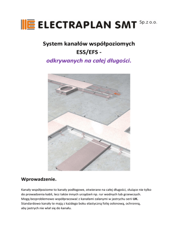 System kanałów współpoziomych ESS/EFS odkrywanych na całej długości. Wprowadzenie. Kanały współpoziome to kanały podłogowe, otwierane na całej długości, służące nie tylko do prowadzenia kabli, lecz także innych urządzeń np. rur wodnych lub grzewczych. Mogą bezproblemowo współpracować z kanałami zalanymi w jastrychu serii UK. Standardowo kanały te mają z każdego boku elastyczną folię osłonową, ochronną, aby jastrych nie wlał się do kanału. Kanały współpoziome dostarczane są w odcinkach o dł. 2,4 m. Odcinki kanałów łączone są na budowie na styk (patrz zdjęcie poniżej). Kanały współpoziome są na całej długości poziomowane. Kanały są płaskie, b. płytkie (zagłębienie min. 45 mm); dzięki temu oszczędza się na grubości wylewki. Szerokości kanałów współpoziomych: min. 150 mm, zaś maks.= 600 mm. Obciążalność kanałów ESS/EFS w wykonaniu standard wynosi 1500 N. Wnętrze kanału jest w pełni do wykorzystania do układania kabli. Wylewka oblewa kanał z 2 boków, do jego górnej krawędzi. Kanał musi zostać przez zalaniem dokładnie wypoziomowany. Kanał po zalaniu (i mocnym stwardnieniu jastrychu) może być w dowolnym miejscu otwierany (do tego celu służą zdejmowane pokrywy, co 80 cm). Umożliwia to w dowolnej chwili łatwe dokładanie kabli lub usuwanie zbędnych. W pokrywach (stalowych, grubych) kanałów współpoziomych, istnieje możliwość montażu pokryw uchylnych (standardowo w wykonaniu KD1 lub dowolne pokrywy nowej serii) lub zamontowania na kanale minikolumn GBZ. Aby utrzymać pełny prześwit (światło) kanału, zalecane jest zamontowanie z boku kanału (bezpośrednio na profilu bocznym) puszek podłogowych tzw. przykanałowych. Dzięki temu można zastosować węższe (tańsze) kanały. Na pokrywach kanałów współpoziomych nakleja się dowolne wykładziny miękkie (dywanowe lub pcv). Wykonania kanałów współpoziomych. Każdy typ kanałów odkrywanych dostępny jest w 2 odmianach: - z folią osłonową z boków, - z wanną stalową od spodu. 1. kanały ESS z boczną folią osłonową. Przeznaczenie: do podłóg czyszczonych na sucho. Dla większych szerokości (powyżej 350 mm) – trawersy wzmocnione są na środku (podpora). 2. kanały ESS z wanną stalową. Przeznaczenie: do podłóg czyszczonych na sucho. Dla większych szerokości (powyżej 350 mm) – trawersy wzmocnione na środku (podpora). 3. kanały EFS z boczna folią ochronną. Przeznaczenie: do podłóg czyszczonych na sucho i mokro. Dla większych szerokości (powyżej 350 mm) – trawersy wzmocnione na środku (podpora). Przeznaczenie: do podłóg czyszczonych na mokro. 4. kanały EFS z wanną stalową od spodu. Kanał przeznaczony również do podłóg czyszczonych na mokro. Dla szerszych kanałów – trawersy wzmacnia się podporą. Poniżej przedstawiamy przegląd poszczególnych typów kanałów współpoziomych. 1.1. Kanały standardowe ESS z boczną folią osłonową. AB = szerokość zewnętrzna kanału (od góry) LI = szerokość wewn. w świetle kanału (między bocznymi foliami) LE = szerokość użytkowa w świetle kanału (szer. dostępu od góry) Profile boczne z aluminium Z boków kanału elastyczna, przeźroczysta folia Pokrywy kanału z blachy stalowej ocynkowanej o grub.3 mm, długość pokrywy: 800 mm Wykładziny: dywanowe lub z pcv (linoleum) Maks. grubość naklejanej wykładziny: 4 – 5 mm Trawersy wzmacniające pod pokrywami podporami (kołki gwintowane ze stopką). Kanały ESS z folią dostarczane są w odcinkach 2,4 mb.; na takim odcinku zamontowane są 3 pokrywy o dł. 0,8 mb każda. Podstawowe wykonania (wysokości) kanałów: K045 = zakres poziomowania: 45 - 70 mm K065 = „ 65 - 110 mm K105 = „ 105 - 150 mm K145 = „ 145 - 190 mm Min. zagłębienie kanału: 45 mm (niestandardowe wykonania - nawet od 30 mm). Pod pokrywami kanału (co 80 cm) zamontowane są poprzeczne trawersy wzmacniające. 1.1.1 Tabela podstawowych wykonań kanałów ESS z folią. Model szerokość znamionowa N (mm) szerokość AB (mm) szerokość LI (mm) szerokość LE (mm) Numer katalogowy ESS 150 K045 ESS 150 K065 ESS 150 K105 ESS 150 K145 ESS 200 K045 ESS 200 K065 150 150 150 150 200 200 166 166 166 166 216 216 110 110 110 110 160 160 75 75 75 75 125 125 301 15K0 045 301 15K0 065 301 15K0 105 301 15K0 145 301 20K0 045 301 20K0 065 ESS 200 K105 ESS 200 K145 ESS 250 K045 ESS 250 K065 ESS 250 K105 ESS 250 K145 ESS 300 K045 ESS 300 K065 ESS 300 K105 ESS 300 K145 ESS 350 K045 ESS 350 K065 ESS 350 K105 ESS 350 K145 200 200 250 250 250 250 300 300 300 300 350 350 350 350 216 216 266 266 266 266 316 316 316 316 366 366 366 366 160 160 210 210 210 210 260 260 260 260 310 310 310 310 125 125 175 175 175 175 225 225 225 225 275 275 275 275 301 20K0 105 301 20K0 145 301 25K0 045 301 25K0 065 301 25K0 080 301 25K0 105 301 30K0 045 301 30K0 065 301 30K0 105 301 30K0 145 301 35K0 045 301 35K0 065 301 35K0 105 301 35K0 145 ESS 400 K045 ESS 400 K065 ESS 400 K105 ESS 400 K145 ESS 500 K045 ESS 500 K065 ESS 500 K105 ESS 500 K145 ESS 600 K045 ESS 600 K065 ESS 600 K105 ESS 600 K145 400 400 400 400 500 500 500 500 600 600 600 600 416 416 416 416 516 516 516 516 616 616 616 616 360 360 360 360 460 460 460 460 560 560 560 560 325 325 325 325 425 425 425 425 525 525 525 525 301 40K0 045 301 40K0 065 301 40K0 105 301 40K0 145 301 50K0 045 301 50K0 065 301 50K0 105 301 50K0 145 301 60K0 045 301 60K0 065 301 60K0 105 301 60K0 145 W ofercie kompletny kanał ESS, z elastyczną boczną folią osłonową, przeznaczony do suchych pomieszczeń i podłóg czyszczonych na sucho. Od zagłębienia = 55 mm można w kanale zamontować pokrywy uchylne w wykonaniu KD1 (lub dowolne pokrywy nowej serii). Kanał dostarczany w odcinkach 2,4 mb., a na nim 3 pokrywy stalowe o dł. 0,8 m każda. Od kanału ESS można wykonać odejścia rurkami lub kanałami UK. Do wzmocnienia kanału służą mocne trawersy (co 80 cm); dla kanałów szerszych niż 350 mm trawersy zostają dodat