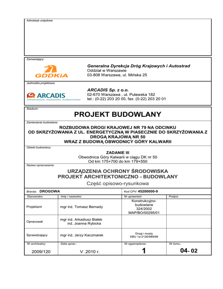 Adnotacje urzędowe Zamawiający: Generalna Dyrekcja Dróg Krajowych i Autostrad Oddział w Warszawie 03-808 Warszawa, ul. Mińska 25 Jednostka projektowa: ARCADIS Sp. z o.o. 02-670 Warszawa , ul. Puławska 182 tel.: (0-22) 203 20 00, fax: (0-22) 203 20 01 Stadium: PROJEKT BUDOWLANY Zamierzenie budowlane: ROZBUDOWA DROGI KRAJOWEJ NR 79 NA ODCINKU OD SKRZYśOWANIA Z UL. ENERGETYCZNĄ W PIASECZNIE DO SKRZYśOWANIA Z DROGĄ KRAJOWĄ NR 50 WRAZ Z BUDOWĄ OBWODNICY GÓRY KALWARII Obiekt budowlany: ZADANIE III Obwodnica Góry Kalwarii w ciągu DK nr 50 Od km 175+700 do km 179+550 Nazwa opracowania: URZĄDZENIA OCHRONY ŚRODOWISKA PROJEKT ARCHITEKTONICZNO - BUDOWLANY Część opisowo-rysunkowa BranŜa: DROGOWA Stanowisko: Kod CPV: 45200000-9 Imię i nazwisko: Projektant mgr inŜ. Tomasz Bernady Opracował mgr inŜ. Arkadiusz Białek inŜ. Joanna Rybicka Sprawdzający mgr inŜ. Jerzy Kaczmarek Nr archiwalny: Data oprac.: 2009/120 Nr uprawnień: Konstrukcyjnobudowlane 324/2002 MAP/BO/00295/01 Drogi i mosty KBU 1a-2126/989/66 Nr egzemplarza: V .2010 r. Podpis: 1 Nr tomu.: 04- 02 ZADANIE III – Obwodnica Góry Kalwarii w ciągu DK50 PROJEKT ARCHITEKTONICZNO-BUDOWLANY - URZĄDZENIA OCHRONY ŚRODOWISKA Spis treści OŚWIADCZENIE UPRAWNIENIA I ZAŚWIADCZENIA PROJEKTANTA I SPRAWDZAJĄCEGO 1. Nazwa obiektu budowlanego ...........................................................................................8 2. Nazwa Inwestora ..............................................................................................................8 3. Nazwa jednostki projektowej – prowadzącej ....................................................................8 4. Podstawa opracowania .....................................................................................................8 5. Charakterystyka terenu i zagospodarowanie przestrzenne w pasie projektowanej trasy. .8 6. Odwodnienie ....................................................................................................................9 7. Ekrany akustyczne .........................................................................................................10 8. Ogrodzenia .....................................................................................................................11 9. Zieleń ..............................................................................................................................11 10. Uzgodnienia ..................................................................................................................12 ARCADIS Sp z o. o . 2 ZADANIE III – Obwodnica Góry Kalwarii w ciągu DK50 PROJEKT ARCHITEKTONICZNO-BUDOWLANY - URZĄDZENIA OCHRONY ŚRODOWISKA Warszawa, dnia V .2011 r. OŚWIADCZENIE My niŜej podpisani oświadczamy, Ŝe : „Projekt stadium PB rozbudowa drogi krajowej nr 79 na odcinku od skrzyŜowania z ul. Energetyczna w Piasecznie do skrzyŜowania z droga krajową nr 50 wraz budową obwodnicy Góry Kalwarii - ZADANIE III - Budowa obwodnicy Góry Kalwarii w ciągu drogi krajowej nr 50 od km 175+700 do km 179+550’’ został sporządzony zgodnie z obowiązującymi przepisami oraz zasadami wiedzy technicznej i jest kompletny z punktu widzenia celu , któremu ma słuŜyć (art. 20 ust. 4 Ustawy z dnia 07 jest lipca 1994 r Prawo Budowlane - Tekst jednolity: Dz. U. z 2003 r. Nr 207, poz. 2016, zmiany: Dz. U. z 2004 r. Nr 93, poz. 888 ) . Projektant : DROGI mgr inŜ. Tomasz Bernady upr. Konstrukcyjno-budowlane 324/2002 MAP/BO/00295/01 Sprawdzający : mgr inŜ. Jerzy Kaczmarek upr. Drogi i mosty KBU 1a-2126/989/66 MAZ/BD/0875/01 ARCADIS Sp z o. o . 3 ZADANIE III – Obwodnica Góry Kalwarii w ciągu DK50 PROJEKT ARCHITEKTONICZNO-BUDOWLANY - URZĄDZENIA OCHRONY ŚRODOWISKA ARCADIS Sp z o. o . 4 ZADANIE III – Obwodnica Góry Kalwarii w ciągu DK50 PROJEKT ARCHITEKTONICZNO-BUDOWLANY - URZĄDZENIA OCHRONY ŚRODOWISKA ARCADIS Sp z o. o . 5 ZADANIE III – Obwodnica Góry Kalwarii w ciągu DK50 PROJEKT ARCHITEKTONICZNO-BUDOWLANY - URZĄDZENIA OCHRONY ŚRODOWISKA ARCADIS Sp z o. o . 6 ZADANIE III – Obwodnica Góry Kalwarii w ciągu DK50 PROJEKT ARCHITEKTONICZNO-BUDOWLANY - URZĄDZENIA OCHRONY ŚRODOWISKA ARCADIS Sp z o. o . 7 ZADANIE III – Obwodnica Góry Kalwarii w ciągu DK50 PROJEKT ARCHITEKTONICZNO-BUDOWLANY - URZĄDZENIA OCHRONY ŚRODOWISKA 1. Nazwa obiektu budowlanego Budowa obwodnicy Góry Kalwarii w ciągu drogi nr 50 od km 175+700 do km 179+550-Zadanie III. 2. Nazwa Inwestora Generalna Dyrekcja Dróg Krajowych i Autostrad Oddział w Warszawie, 03-808 Warszawa, ul. Mińska 25 3. Nazwa jednostki projektowej – prowadzącej ARCADIS Sp. z o.o., 02-670 Warszawa, ul. Puławska 182. 4. Podstawa opracowania Podstawą opracowania jest umowa nr 183/2009 z dnia 09.10.2009r., zawarta pomiędzy Generalną Dyrekcją Dróg Krajowych i Autostrad Oddział w Warszawie, ul Mińska 25, 03-808 Warszawa, a Biurem Arcadis Sp. z.o.o., ul. Puławska 182, 02-670 Warszawa. 5. Charakterystyka terenu i zagospodarowanie przestrzenne w pasie projektowanej trasy. Przedmiotowe przedsięwzięcie zlokalizowane jest na terenie miasta i Gminy Góra Kalwaria w powiecie piaseczyńskim województwa mazowieckiego. Polega na budowie dwujezdniowej drogi obwodowej po południowej stronie Góry Kalwarii od km 175+700 do mostu przez rzekę Wisłę km 179+550 stanowiąc obwodnicę w ciągu drogi krajowej nr 50. Długość inwestycji – zadania III wynosi 3850 m. Droga przebiega w terenie płaskim. Największe róŜnice terenu dochodzące do 20 m występują na skarpie doliny Wisły. U jej podnóŜa płynie rzeka Cedron. Zagospodarowanie terenu wzdłuŜ projektowanej drogi stanowią: tereny zabudowane Góry Kalwarii, miejskie tereny rekreacyjno – sportowe oraz tereny uŜytkowane rolniczo: łąki, pastwiska i sady. Pierwszy odcinek, od granicy miasta do istniejącego ronda, przebiega przez typową zabudowę miejską. Wszędzie tam występują liczne zjazdy do posesji. Drugi odcinek, od istniejącego ronda do mostu przez 