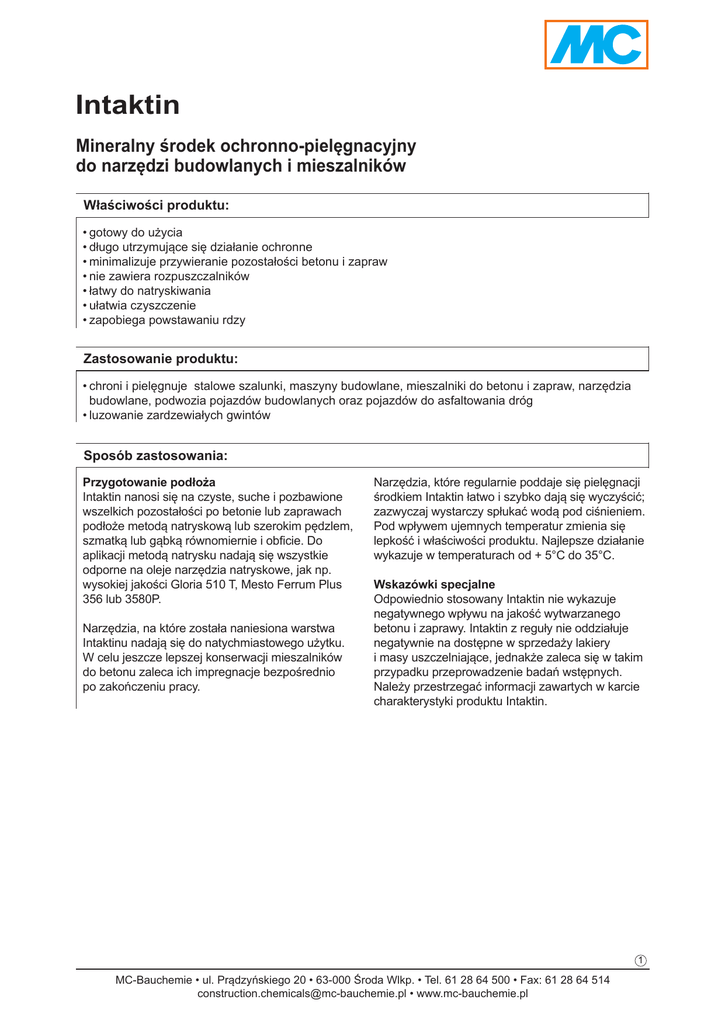 Intaktin Mineralny środek ochronno-pielęgnacyjny do narzędzi budowlanych i mieszalników Właściwości produktu: •gotowy do użycia •długo utrzymujące się działanie ochronne •minimalizuje przywieranie pozostałości betonu i zapraw •nie zawiera rozpuszczalników •łatwy do natryskiwania •ułatwia czyszczenie •zapobiega powstawaniu rdzy Zastosowanie produktu: •chroni i pielęgnuje stalowe szalunki, maszyny budowlane, mieszalniki do betonu i zapraw, narzędzia budowlane, podwozia pojazdów budowlanych oraz pojazdów do asfaltowania dróg •luzowanie zardzewiałych gwintów Sposób zastosowania: Przygotowanie podłoża Intaktin nanosi się na czyste, suche i pozbawione wszelkich pozostałości po betonie lub zaprawach podłoże metodą natryskową lub szerokim pędzlem, szmatką lub gąbką równomiernie i obficie. Do aplikacji metodą natrysku nadają się wszystkie odporne na oleje narzędzia natryskowe, jak np. wysokiej jakości Gloria 510 T, Mesto Ferrum Plus 356 lub 3580P. Narzędzia, na które została naniesiona warstwa Intaktinu nadają się do natychmiastowego użytku. W celu jeszcze lepszej konserwacji mieszalników do betonu zaleca ich impregnacje bezpośrednio po zakończeniu pracy. Narzędzia, które regularnie poddaje się pielęgnacji środkiem Intaktin łatwo i szybko dają się wyczyścić; zazwyczaj wystarczy spłukać wodą pod ciśnieniem. Pod wpływem ujemnych temperatur zmienia się lepkość i właściwości produktu. Najlepsze działanie wykazuje w temperaturach od + 5°C do 35°C. Wskazówki specjalne Odpowiednio stosowany Intaktin nie wykazuje negatywnego wpływu na jakość wytwarzanego betonu i zaprawy. Intaktin z reguły nie oddziałuje negatywnie na dostępne w sprzedaży lakiery i masy uszczelniające, jednakże zaleca się w takim przypadku przeprowadzenie badań wstępnych. Należy przestrzegać informacji zawartych w karcie charakterystyki produktu Intaktin. 1 MC-Bauchemie • ul. Prądzyńskiego 20 • 63-000 Środa Wlkp. • Tel. 61 28 64 500 • Fax: 61 28 64 514 [email protected] • www.mc-bauchemie.pl Dane techniczno-użytkowe produktu Intaktin: Parametr Jednostka miary Wartość Gęstość objętościowa g/cm³ ok. 0,85 Zużycie ml/m² ok. 40-50 °C >110 Punkt zapłonu Uwagi w zależności od podłoża i zastosowania Właściwości produktu Intaktin: Zakładowa Kontrola Produkcji wg ISO 9001:2008 Baza oleje mineralne i dodatki Barwa jasnobrązowa Postać płynna Warunki przechowywania Przechowywać przez okres 12 miesięcy. Sposób dostawy kanister 30 l beczka 200 l kontener 1000 l Usuwanie odpadów W trosce o środowisko naturalne opakowania należy dokładnie opróżniać. Podane informacje, dotyczące właściwości produktu są wynikiem badań laboratoryjnych i mogą różnić się w praktyce. Właściwe zastosowanie musi być ściśle określone na podstawie badań wstępnych. Uwaga! Informacje zawarte w niniejszej karcie technicznej wynikają z naszych doświadczeń i dotychczasowej wiedzy, nie są jednak wiążące. Należy je dostosować do konkretnego obiektu budowlanego, celu zastosowania oraz rzeczywistych warunków, oczekiwanych w miejscu zastosowania. Oznacza to, że odpowiadamy za poprawność tych danych w ramach naszych Ogólnych Warunków Sprzedaży. Wszystkie zalecenia naszych pracowników, odbiegające od danych, zawartych w naszych kartach technicznych są dla nas tylko wtedy wiążące, gdy zostaną potwierdzone pisemnie. W każdym przypadku należy przestrzegać ogólnie obowiązujących zasad techniki budowlanej. Wydanie 05/14. Ta karta została zaktualizowana. Tym samym wszystkie dotychczasowe jej wydania tracą ważność i prosimy o zaprzestanie korzystania z nich. W momencie kolejnej aktualizacji niniejsze wydanie przestaje być obowiązującym. MC-Bauchemie • ul. Prądzyńskiego 20 • 63-000 Środa Wlkp. • Tel. 61 28 64 500 • Fax: 61 28 64 514 [email protected] • www.mc-bauchemie.pl 2