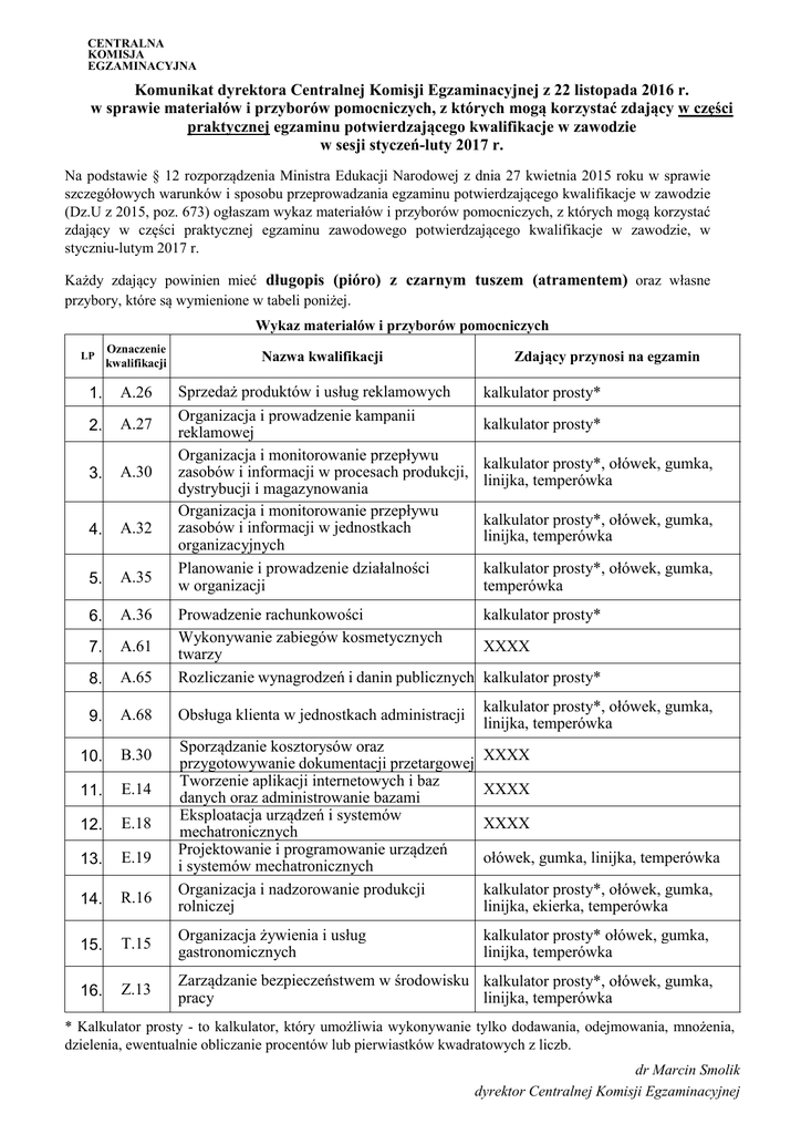 CENTRALNA KOMISJA EGZAMINACYJNA Komunikat dyrektora Centralnej Komisji Egzaminacyjnej z 22 listopada 2016 r. w sprawie materiałów i przyborów pomocniczych, z których mogą korzystać zdający w części praktycznej egzaminu potwierdzającego kwalifikacje w zawodzie w sesji styczeń-luty 2017 r. Na podstawie § 12 rozporządzenia Ministra Edukacji Narodowej z dnia 27 kwietnia 2015 roku w sprawie szczegółowych warunków i sposobu przeprowadzania egzaminu potwierdzającego kwalifikacje w zawodzie (Dz.U z 2015, poz. 673) ogłaszam wykaz materiałów i przyborów pomocniczych, z których mogą korzystać zdający w części praktycznej egzaminu zawodowego potwierdzającego kwalifikacje w zawodzie, w styczniu-lutym 2017 r. Każdy zdający powinien mieć długopis (pióro) z czarnym tuszem (atramentem) oraz własne przybory, które są wymienione w tabeli poniżej. Wykaz materiałów i przyborów pomocniczych LP Oznaczenie kwalifikacji Nazwa kwalifikacji Zdający przynosi na egzamin 1. A.26 2. A.27 3. A.30 4. A.32 5. A.35 6. A.36 7. A.61 8. A.65 Prowadzenie rachunkowości kalkulator prosty* Wykonywanie zabiegów kosmetycznych XXXX twarzy Rozliczanie wynagrodzeń i danin publicznych kalkulator prosty* 9. A.68 Obsługa klienta w jednostkach administracji 10. B.30 11. E.14 12. E.18 13. E.19 14. R.16 15. T.15 Organizacja żywienia i usług gastronomicznych 16. Z.13 Zarządzanie bezpieczeństwem w środowisku kalkulator prosty*, ołówek, gumka, pracy linijka, temperówka Sprzedaż produktów i usług reklamowych Organizacja i prowadzenie kampanii reklamowej Organizacja i monitorowanie przepływu zasobów i informacji w procesach produkcji, dystrybucji i magazynowania Organizacja i monitorowanie przepływu zasobów i informacji w jednostkach organizacyjnych Planowanie i prowadzenie działalności w organizacji Sporządzanie kosztorysów oraz przygotowywanie dokumentacji przetargowej Tworzenie aplikacji internetowych i baz danych oraz administrowanie bazami Eksploatacja urządzeń i systemów mechatronicznych Projektowanie i programowanie urządzeń i systemów mechatronicznych Organizacja i nadzorowanie produkcji rolniczej kalkulator prosty* kalkulator prosty* kalkulator prosty*, ołówek, gumka, linijka, temperówka kalkulator prosty*, ołówek, gumka, linijka, temperówka kalkulator prosty*, ołówek, gumka, temperówka kalkulator prosty*, ołówek, gumka, linijka, temperówka XXXX XXXX XXXX ołówek, gumka, linijka, temperówka kalkulator prosty*, ołówek, gumka, linijka, ekierka, temperówka kalkulator prosty* ołówek, gumka, linijka, temperówka * Kalkulator prosty - to kalkulator, który umożliwia wykonywanie tylko dodawania, odejmowania, mnożenia, dzielenia, ewentualnie obliczanie procentów lub pierwiastków kwadratowych z liczb. dr Marcin Smolik dyrektor Centralnej Komisji Egzaminacyjnej