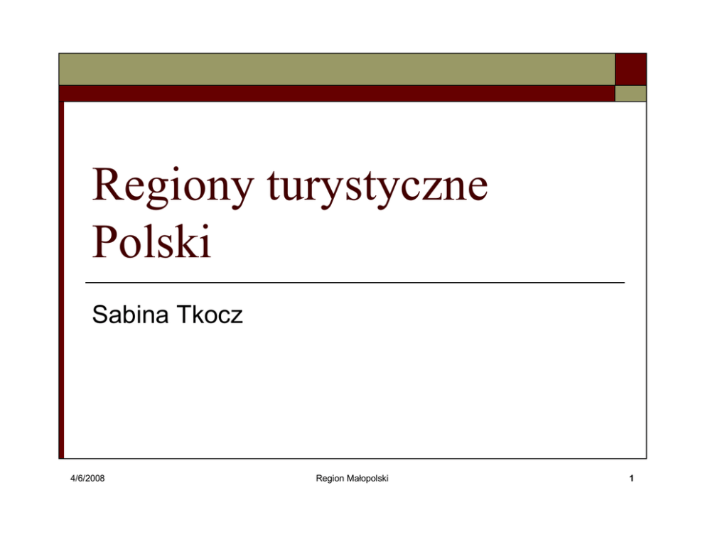 Regiony turystyczne Polski Sabina Tkocz 4/6/2008 Region Małopolski 1 Makroregion Małopolski o Obejmuje 4 regiony (województwa) południowej Polski: n n n n 4/6/2008 Małopolski Świętokrzyski Lubelski Podkarpacki Region Małopolski 2 Region Świętokrzyski o o o Obszar znacznie uprzemysłowiony, Złoża marmurów, wapieni i gipsów, Tradycje górnictwa skalnego i hutnictwa żelaza n n n n n 4/6/2008 Początki – początek naszej ery, 1700 stanowisk „dymarek” do wytopu żelaza, Dawny olbrzymi ośrodek hutniczy, Stara Słupia, Rudki, Kunowa, Nowa Słupia Zabytki: Samsonów, Maleniec, Białogon, Stara Kuźnica, Region Małopolski 3 Region Świętokrzyski o o o o Stare kopalnie krzemienia – okolice Szydłowca, Wierzbicy i Ostrowca Świętokrzyskiego, Kopalnie odkrywkowe krzemienia pasiastego – Ożarów, Ruda Kościelna, Borownia, Kopalnia głębinowa krzemienia pasiastego w Krzemionkach Opatowskich (ok.. Ostrowca Świętokrzyskiego) – jedna z najstarszych w Europie; obecnie rezerwat archeologiczny; możliwość zwiedzania; pawilon muzealny, Odkrywki poekslpoatacyjne, 4/6/2008 Region Małopolski 4 Region Świętokrzyski o o o o o o Dawne ślady osadnictwa, Państwo Wiślan – ślady z VII-IX w., Związane ze znanymi osobami – Hugo Kołłątajem, Stanisławem Staszicem (rozwój górnictwa i hutnictwa), Rejem, Żeromskim, Sienkiewiczem, Konarskim, Znacząca historia – zrywy narodowe – powstanie kościuszkowskie, spisek ks. Piotra Ściegiennego, powstanie styczniowe (Legion J. Piłsudzkiego), Klasztory cysterskie – Jędrzejów, Koprzywnica, Wąchock, Klasztor Benedyktynów na Świętym Krzyżu, 4/6/2008 Region Małopolski 5 Region Świętokrzyski o Staropolski Okręg Przemysłowy n n n o o o o Zagłębie Staropolskie, Obszar turystyki krajoznawczej, Zbiorniki wodne – Sielpia, Brody, Centralny Okręg Przemysłowy, Duży potencjał walorów wypoczynkowych, Słabe wykorzystanie – najniższy wskaźnik bazy noclegowej w Polsce, Kolejka wąskotorowa z „Ciuchcią Ekspress Ponidzie” – Jędrzejów-Pińczów; teren Niecki Nidziańskiej, 4/6/2008 Region Małopolski 6 Region Świętokrzyski o Warunki naturalne c.d. n Góry Świętokrzyskie – o o 4/6/2008 po Sudetach najstarsze góry, najwyższe pasmo – Łysogóry (Łysica 612 m n.p.m. i Łysa Góra 595 m n.p.m.), n Gołoborza – rumowiska skalne, z wietrzenia twardych piaskowców i kwarcytów, n Formy krasowe na obszarach wapiennych – Jaskinia Raj (rezerwat przyrody) cenne nacieki wapienne; ślady neandertalskich osadników łowieckich, Region Małopolski 7 Region Świętokrzyski o Warunki naturalne c.d. n Liczne rezerwaty o o o n Świętokrzyski PN o o n 4/6/2008 Miejscowość Bartków – dąb szypułkowy „Bartek” jedno z najstarszych drzew w Polsce (ok..700 lat), Rezerwat geologiczny „Skałki – Piekło” pod Niekłaniem, Rezerwat „Kamienne Kręgi”, Roślinność reliktowa, Modrzew polski – Chełmowa Góra, Uzdrowiska – Busko Zdrój, Solec Zdrój, Region Małopolski 8 Region Świętokrzyski o Warunki naturalne n n n n o Teren Wyżyny Małopolskiej, Przełom Wisły, Doliny rzek Nidy i Kamiennej, Świętokrzyski PN – jeden z najstarszych w Polsce, Nowa Słupia n n n n n 4/6/2008 Początki hutnictwa i górnictwa, Dawny okręg hutniczy, muzeum techniki (hutnictwa), Coroczne „święto dymarek”, z wytopem żelaza, Rzeźba „Pielgrzyma” – symbol Nowej Słupi, Region Małopolski 9 Region Świętokrzyski o Święty Krzyż = Łysa Góra n n n n n n n 4/6/2008 W górach Świętokrzyskich, Średniowieczne sanktuarium pogańskie (pozostały kamienne wały), Klasztor pobenedyktyński – dziś oo. Oblatów, Muzeum Historii Świętego Krzyża, Wystawa Sztuki Ludowej Krajów Misyjnych Muzeum Przyrodnicze ŚPN, W podziemiach zmumifikowane zwłoki ks. Jeremiego Wiśniowieckiego, Region Małopolski 10 Region Świętokrzyski o Kielce n n Ośrodek przemysłowy, krajoznawczy, turystyczny, 1816 r. „Szkoła Akademiczno-Górnicza o o n Pałac Biskupów Krakowskich o o n n 4/6/2008 renesansowo-barokowy, Obecnie Muzeum Narodowe; sanktuarium J. Piłsudzkiego, Katedra NMP (bazylika mniejsza), o n pierwsza w Polsce uczelnia tego typu, Założona przez Stanisława Staszica, Barokowa, na pozostałościach romańskich, Muzeum lat szkolnych Stefana Żeromskiego, Muzeum Zabawkarstwa, Region Małopolski 11 Region Świętokrzyski o Sielpia Wielka n n o o Skarżysko – ośrodek przemysłowa nad rz. Kamienną, muzeum im. Orła Białego (broń), Tokarnia n o największy ośrodek turystyczny, Teren dawnej walcowni – Muzeum SOP, Skansen – Muzeum Wsi Kieleckiej; budownictwo obszaru, Koprzywnica n n 4/6/2008 Klasztor cystersów, Dom opata i kościół z XIII w., Region Małopolski 12 Region Świętokrzyski o Sandomierz n n n n n n n 4/6/2008 Zabytkowy średniowieczny układ urbanistyczny, Zamek, mury obronne, Renesansowy ratusz, Kościół św. Jakuba z 1226 r.; najstarszy, ceglany, „Dom Długosza” – Muzeum Diecezjalne, zbiory sztuki sakralnej, Rezerwat stepowy „Pieprzowe Góry” w granicach miasta, Turnieje rycerskie, Region Małopolski 13 Region Świętokrzyski o Ujazd n Forteca Krzyżtopór o o o o o o Jeden z najbardziej znanych polskich zamków, 1 połowa XVII w., wczesnobarokowa twierdza, Własność Ossolińskich, Największy w Europie, do wybudowania Wersalu, Budynek rezydencjonalno obronny, Legenda o zastosowaniu symboliki kalendarza n n n 4/6/2008 n cztery baszty – reprezentują cztery pory roku, 12 sal – symbolizuje 12 miesięcy, 52 pokoje – 52 tygodnie roku, niegdyś również Region 356Małopolski okien – ilość dni w roku, 14 Region Świętokrzyski o Chęciny n n n n n n 4/6/2008 Średniowieczny układ miasta, Gotycki kościół Wniebowzięcia NMP i klasztor Franciszkanów, Ruiny zamku królewskiego z XIII/ XIV w.; na wzgórzu, Kiedyś więzienie królewskie, W okolicy kamieniołomy marmurów chęcimskich (monolit na kolumnę Zygmunta w Warszawie), Turnieje rycerskie, Region Małopolski 15 Re