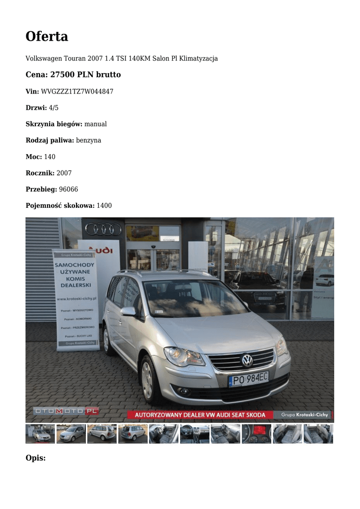 Oferta Volkswagen Touran 2007 1.4 TSI 140KM Salon Pl Klimatyzacja Cena: 27500 PLN brutto Vin: WVGZZZ1TZ7W044847 Drzwi: 4/5 Skrzynia biegów: manual Rodzaj paliwa: benzyna Moc: 140 Rocznik: 2007 Przebieg: 96066 Pojemność skokowa: 1400 Opis: Auto-Handel-Centrum Krotoski-Cichy Autoryzowany Dealer VW Audi Seat Skoda GWARANCJA POCHODZENIA MOŻLIWOŚĆ SPRAWDZENIA POJAZDU W AUTORYZOWANEJ STACJI OBSŁUGI VOLKSWAGEN MOŻLIWOŚĆ POZOSTAWIENIA SWOJEGO SAMOCHODU UŻYWANEGO W ROZLICZENIU !!!UWAGA!!! * PRZY SKORZYSTANIU Z NASZEJ FORMY FINANSOWANIA - KREDYTU LUB LEASINGU DODATKOWY RABAT * ----------------------------------------------------------------------------------------------------------------------------------------------------Uwaga: Miejsce ekspozycji pojazdu - Grupa Krotoski-Cichy Salon Pojazdów Używanych ul.Poznańska 33 62-081 Poznań-Przeźmierowo Osoba kontaktowa tel: Jakub Pruchniewski 691 911 724 Sławek Kaczmarek 667 946 206 Adam Mizera 609 791 014 -----------------------------------------------------------------------------------------------------------------------------------------------------Volkswagen Touran 1.4 TSI 140KM Pojazd zakupiony w Polskim Salonie Przebieg: 96.066 km Skrzynia biegów manualna 6 biegowa Wyposażenie: Radio CD/MP3 RCD 300 Reflektory przeciwmgielne Tempomat Podłokietnik Podgrzewane fotele przednie Kierownica obszyta skórą Elektryczne szyby Elektryczne lusterka Czujniki parkowania z tyłu Centralny zamek Klimatyzacja automatyczna dwustrefowa Podgrzewane lusterka ABS, ASR, ESP ISOFIX Immobiliser Komputer pokładowy Relingi dachowe Poduszki powietrzne (6 szt.): czołowe i boczne dla kierowcy i pasazera z przodu, kurtyny powietrzne dla pasazerów z przodu i z tyłu Wspomaganie układu kierowniczego i inne -----------------------------------------------------------------------------------------------------------------------------------------------------Oferujemy kompleksową obsługę sprzedaży ratalnej na bardzo dogodnych warunkach - w celu bliższego zapoznania się z aktualną ofertą finansowania prosimy o kontakt : Adam Mizera 609 791 014 Oferujemy ubezpieczenia samochodowe z wiodących na rynku ubezpieczalni - możliwość zakupu pakietu ubezpieczeniowego na miejscu. Oferujemy możliwość jazdy próbnej przed zakupem oraz usługę inspekcji pojazdu w autoryzowanym serwisie Skoda. Przyjmujemy również w rozliczeniu każdy pojazd. -----------------------------------------------------------------------------------------------------------------------------------------------------Uwaga: Miejsce ekspozycji pojazdu - Grupa Krotoski-Cichy Salon Pojazdów Używanych ul.Poznańska 33 62-081 Poznań-Przeźmierowo Osoba kontaktowa tel: Jakub Pruchniewski 691 911 724 Sławek Kaczmarek 667 946 206 Adam Mizera 609 791 014 Godziny otwarcia: pon - pt 9.00 - 19.00 sob 9.00 - 14.00 Tel. 61 8163 869 ------------------------------------------------------------------------------------------------------------------------------------------------------Ogłoszenie ma charakter informacyjny i stanowi zaproszenie do zawarcia umowy (art. 71 Kodeksu cywilnego); nie stanowi natomiast oferty handlowej w rozumieniu art. 66 § 1 Kodeksu cywilnego. W celu sprawdzenia zgodności oferty oraz uzyskania wszelkich informacji prosimy kontaktować się z handlowcem d.s. samochodów używanych Auto możesz zobaczyć: ul. Poznańska 33 62-081 P-ń Przeźmierowo tel: 61/816-38-69 Sławomir Kaczmarek GSM: 667 946 206 e-mail: [email protected] Jakub Pruchniewski GSM: 691 911 724 e-mail: [email protected] Adam Mizera GSM: 609-791-014 e-mail: [email protected]