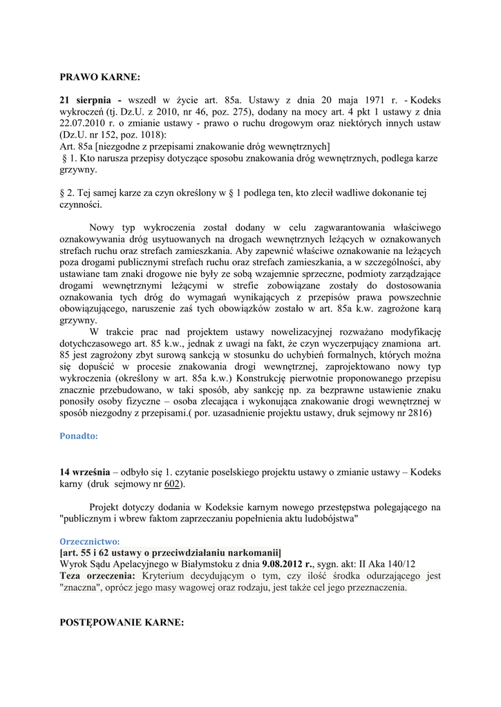 PRAWO KARNE: 21 sierpnia - wszedł w życie art. 85a. Ustawy z dnia 20 maja 1971 r. - Kodeks wykroczeń (tj. Dz.U. z 2010, nr 46, poz. 275), dodany na mocy art. 4 pkt 1 ustawy z dnia 22.07.2010 r. o zmianie ustawy - prawo o ruchu drogowym oraz niektórych innych ustaw (Dz.U. nr 152, poz. 1018): Art. 85a [niezgodne z przepisami znakowanie dróg wewnętrznych] § 1. Kto narusza przepisy dotyczące sposobu znakowania dróg wewnętrznych, podlega karze grzywny. § 2. Tej samej karze za czyn określony w § 1 podlega ten, kto zlecił wadliwe dokonanie tej czynności. Nowy typ wykroczenia został dodany w celu zagwarantowania właściwego oznakowywania dróg usytuowanych na drogach wewnętrznych leżących w oznakowanych strefach ruchu oraz strefach zamieszkania. Aby zapewnić właściwe oznakowanie na leżących poza drogami publicznymi strefach ruchu oraz strefach zamieszkania, a w szczególności, aby ustawiane tam znaki drogowe nie były ze sobą wzajemnie sprzeczne, podmioty zarządzające drogami wewnętrznymi leżącymi w strefie zobowiązane zostały do dostosowania oznakowania tych dróg do wymagań wynikających z przepisów prawa powszechnie obowiązującego, naruszenie zaś tych obowiązków zostało w art. 85a k.w. zagrożone karą grzywny. W trakcie prac nad projektem ustawy nowelizacyjnej rozważano modyfikację dotychczasowego art. 85 k.w., jednak z uwagi na fakt, że czyn wyczerpujący znamiona art. 85 jest zagrożony zbyt surową sankcją w stosunku do uchybień formalnych, których można się dopuścić w procesie znakowania drogi wewnętrznej, zaprojektowano nowy typ wykroczenia (określony w art. 85a k.w.) Konstrukcję pierwotnie proponowanego przepisu znacznie przebudowano, w taki sposób, aby sankcję np. za bezprawne ustawienie znaku ponosiły osoby fizyczne – osoba zlecająca i wykonująca znakowanie drogi wewnętrznej w sposób niezgodny z przepisami.( por. uzasadnienie projektu ustawy, druk sejmowy nr 2816) Ponadto: 14 września – odbyło się 1. czytanie poselskiego projektu ustawy o zmianie ustawy – Kodeks karny (druk sejmowy nr 602). Projekt dotyczy dodania w Kodeksie karnym nowego przestępstwa polegającego na "publicznym i wbrew faktom zaprzeczaniu popełnienia aktu ludobójstwa" Orzecznictwo: [art. 55 i 62 ustawy o przeciwdziałaniu narkomanii] Wyrok Sądu Apelacyjnego w Białymstoku z dnia 9.08.2012 r., sygn. akt: II Aka 140/12 Teza orzeczenia: Kryterium decydującym o tym, czy ilość środka odurzającego jest "znaczna", oprócz jego masy wagowej oraz rodzaju, jest także cel jego przeznaczenia. POSTĘPOWANIE KARNE: 18 sierpnia 2012 r. - weszła w życie Ustawa z dnia 13.7.2012 r. o zmianie ustawy – Kodeks postępowania karnego (Dz.U. z 2012 r. poz. 886), na mocy której po art. 632a k.p.k. dodany został art. 632b w brzmieniu: Art. 632b. [Orzeczenie zwrotu należności] Jeżeli w sprawach, o których mowa w art. 632 pkt 2, przyczyny umorzenia powstały w toku postępowania, sąd może orzec od Skarbu Państwa zwrot należności z tytułu ustanowienia jednego pełnomocnika. Nowelizacja przepisów Kodeksu postępowania karnego była wynikiem potrzeby dostosowania systemu prawa do wyroku Trybunału Konstytucyjnego z dnia 18 października 2011 r. (sygn. akt SK 39/09), stwierdzającego niezgodność art. 632 pkt 2 ustawy z dnia 6 czerwca 1997 r. – Kodeks postępowania karnego (Dz. U. Nr 89, poz. 555, z późn. zm.) z art. 45 ust. 1 Konstytucji Rzeczypospolitej Polskiej. Trybunał orzekł, że art. 632 pkt 2 k.p.k. w zakresie, w jakim w razie umorzenia postępowania karnego z powodu śmierci oskarżonego uniemożliwia zasądzenie na rzecz pokrzywdzonego i oskarżyciela posiłkowego należności z tytułu udziału w tym postępowaniu adwokata bądź radcy prawnego, ustanowionego w charakterze pełnomocnika, narusza standardy wywodzone z art. 45 ust. 1 ustawy zasadniczej. Badając zarzuty sformułowane w skardze konstytucyjnej Trybunał przypomniał bowiem, że uregulowania dotykające problematyki kosztów postępowania mieszczą się w tzw. prawie do sądu. W dotychczasowych wypowiedziach sąd konstytucyjny niejednokrotnie akcentował, iż pośród czynników ograniczających wyżej wymienioną gwarancję mogą znajdować się również bariery ekonomiczne, w szczególności mające postać wygórowanych opłat bądź wydatków, których pokrycie warunkuje wszczęcie oraz prowadzenie postępowania sądowego. Ponadto limitujący efekt mogą mieć także same reguły ostatecznego podziału kosztów między stronami postępowania, gdyż to one decydują o tym, czy ryzyko ekonomiczne zaangażowania w spór sądowy nie będzie nadmierne. Co więcej – zdaniem Trybunału dla uznania danego sposobu ponoszenia kosztów procesu za ograniczenie prawa do sądu nie ma znaczenia fakt, że do definitywnego obciążenia kosztami dochodzi dopiero po przeprowadzeniu całego postępowania (względnie jego określonego fragmentu), czyli w istocie wówczas, gdy prawo do sądu zostało już niejako „skonsumowane”. (por. uzasadnienie projektu ustawy, druk sejmowy nr 289). 23 sierpnia - Obwieszczenie Marszałka Sejmu Rzeczypospolitej Polskiej z 27.7.2012 r. w sprawie ogłoszenia jednolitego tekstu ustawy – Prawo o ustroju sądów wojskowych (Dz.U. z 2012 r. poz. 952); 14 września - Obwieszczenie Marszałka Sejmu Rzeczypospolitej Polskiej z 28.6.2012 r. w sprawie ogłoszenia jednolitego tekstu ustawy o wykonywaniu działalności gospodarczej w zakresie wytwarzania i obrotu materiałami wybuchowymi, bronią, amunicją oraz wyrobami i technologią o przeznaczeniu wojskowym lub policyjnym (Dz.U. z 2012 r. poz. 1017); Wybrane akty wykonawcze: 4 września - weszło w życie Rozporządzenie Ministra Spraw Wewnętrznych z dnia 16.8.2012 r. zmieniające rozporządzenie w sprawie wykroczeń, za które strażnicy straży gminnych są uprawnieni do nakładania grzywien w drodze mandatu karnego (Dz.U. z 2012 r. poz. 939). [§ 1 pkt 1 niniejszego rozporządzenia wszedł w życie 