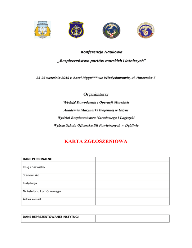 Konferencja Naukowa ,,Bezpieczeństwo portów morskich i lotniczych” 23-25 września 2015 r. hotel Rigga*** we Władysławowie, ul. Harcerska 7 Organizatorzy Wydział Dowodzenia i Operacji Morskich Akademia Marynarki Wojennej w Gdyni Wydział Bezpieczeństwa Narodowego i Logistyki Wyższa Szkoła Oficerska Sił Powietrznych w Dęblinie KARTA ZGŁOSZENIOWA DANE PERSONALNE Imię i nazwisko Stanowisko Instytucja Nr telefonu komórkowego Adres e-mail DANE REPREZENTOWANEJ INSTYTUCJI Nazwa instytucji Ulica i numer domu/lokalu Kod pocztowy, miejscowość Nr telefonu Adres e-mail DANE PODMIOTU, NA KTÓRY MA BYĆ WYSTAWIONA FAKTURA ZA UDZIAŁ W KONFERENCJI Nazwa instytucji Ulica i numer domu/lokalu Kod pocztowy, miejscowość NIP Uprzejmie prosimy przesyłać kartę zgłoszeniową na adres korespondencyjny komitetu organizacyjnego drogą elektroniczną albo listowną: Komitet Organizacyjny Konferencji Naukowej ,,Bezpieczeństwo portów morskich i lotniczych”, Wydział Dowodzenia i Operacji Morskich, Akademia Marynarki Wojennej, ul. Śmidowicza 69 81-103 Gdynia. Dr Paweł Zienkiewicz: tel. 887 663 490, mail: [email protected]; mgr Andrzej Ilkow: tel. 501 009 314 , mail: [email protected]; mgr Mateusz Łaski: tel. 797287934, mail: [email protected] Opłata konferencyjna wynosi 650 zł. Prosimy o dokonywanie wpłat na poniży numer rachunku bankowego, podając w tytule nazwę konferencji oraz imię i nazwisko uczestnika lub uczestników: Bank Zachodni WBK, filia nr 4 o/Gdynia 95150018811210200332510000