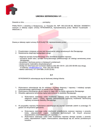 UMOWA SERWISOWA NR …….. Zawarta w dniu …………………………. pomiędzy: FINALTECH z siedzibą w Bydgoszczy, ul. Kossaka 64, NIP: 953-233-06-36, REGON: 093068741; zwanym w dalszej części umowy WYKONAWCĄ, reprezentowaną przez: Michał Tuczempski – właściciel, a: ……………………………………………………………………………………………………………………… Zwaną w dalszej części umowy ZLECAJĄCYM, reprezentowany przez: ………………………………….. §1 1. Przedmiotem niniejszej umowy jest świadczenie usług serwisowych dla Zlecającego. 2. Świadczenia obejmują następujące usługi: - diagnoza sprzętu komputerowego oraz określenie kosztów naprawy - usuwanie awarii sieci, sprzętu komputerowego powierzonego do obsługi serwisowej przez zlecającego - doradztwo i fachowa pomoc w bieŜących problemach - dostarczanie materiałów eksploatacyjnych - dostęp do informacji pod numerem telefonu (52) 561-00-61, (22) 203-58-88 oraz drogą e-mailową: [email protected] , FAX: (52) 561-00-62 - telefon alarmowy: 511-244-689 (10:00-22:00) §2 WYKONAWCA zobowiązuje się do fachowej obsługi klienta. §3 1. Wykonawca zobowiązuje się do solidnej i szybkiej diagnozy / naprawy / instalacji sprzętu komputerowego zgłoszonego na serwis przez Zlecającego. 2. Wykonawca zobowiązuje się do reakcji w ciągu 48h na kaŜde zgłoszenie Zlecającego 3. Wszelkie zgłoszenia serwisowe będą wykonywane w siedzibie Zlecającego a. Wykonawca zastrzega sobie moŜliwość naprawy poza siedzibą Zlecającego jeśli diagnoza usterki / próby naprawy jednoznacznie wykluczą moŜliwość techniczną naprawy na terenie siedziby Zlecającego 4. W przypadku naprawy Wykonawca zobowiązuje się usunąć zaistniałe usterki w przeciągu 72 godzin od otrzymania zgłoszenia. a. Wykonawca zastrzega sobie moŜliwość przedłuŜenia czasowo naprawy z powodu braku odpowiednich części, moŜliwości technicznych lub innych przyczyn bezpośrednio uniemoŜliwiających naprawę b. Wykonawca zastrzega sobie brak moŜliwości naprawy danego sprzętu z powodu braku odpowiednich części, równocześnie zobowiązuje się do zwrotu poniesionych kosztów. 1 §4 1. Wykonawca zobowiązuje się świadczyć usługi serwisowe na rzecz Zlecającego w liczbie godzin: ……………… w kaŜdym miesiącu kalendarzowym do dnia: ………………… 2. Kwota ustalona za świadczenie usług wynosi:……………………. zł netto 3. Kwota ustalona za kaŜdą dodatkową godzinę świadczenia usług ustalono na:………….. zł netto 4. Koszty dojazdu do siedziby Zlecającego pokrywa Wykonawca §5 1. Zlecający zobowiązuje się udostępnić Wykonawcy, na kaŜde wezwanie, wszystkie posiadane dokumenty techniczne sprzętu i oprogramowania. 2. Zlecający gwarantuje, Ŝe sprzęt oddany do naprawy nie pochodzi z kradzieŜy oraz oprogramowanie zainstalowane na sprzęcie oddanym do naprawy jest legalne w świetle obowiązującego prawa. §6 1. Za świadczenie usług, o których mowa w niniejszej umowie Zlecający będzie płacił Wykonawcy ustaloną w § 4 ad2 kwotę niezaleŜnie czy wykorzysta liczbę wykupionych godzin serwisowych w danym okresie rozliczeniowym. 2. Za kaŜdą dodatkową godzinę świadczonych usług przekraczającą liczbę wymienioną w § 4 ad1 zlecający będzie płacił Wykonawcy kwotę ustaloną w § 4 ad3 przy czym Wykonawca jest zobowiązany poinformować Zlecającego o wykorzystaniu liczby godzin określonej w § 4 ad1 przed naliczaniem dodatkowych opłat. 3. Kwoty wymienione w § 4 ad2 oraz ad3 nie obejmują kosztów zamówionego sprzętu jak i sprzętu podlegającego wymianie nie będącego na gwarancji Wykonawcy 4. Zlecający oświadcza, Ŝe jest płatnikiem VAT i upowaŜnia Wykonawcę do wystawiania faktur VAT bez podpisu. 5. Rozliczenie następuje na podstawie faktury VAT , wystawianej przez Wykonawcę na koniec miesiąca kalendarzowego, płatne przelewem w terminie 7 dni na konto firmowe Wykonawcy: Multibank: 64 1140 2017 0000 4602 0849 0973 §7 1. W przypadku niezapłacenia faktury przez Zlecającego w terminie przekraczającym 7 dni od ustalonej daty płatności, wszelkie obowiązki Wykonawcy zostają zawieszone do momentu uregulowania zobowiązań. §8 1. Niniejsza umowa moŜe być rozwiązana za 30 dniowym okresem wypowiedzenia, zgłoszonego drugiej stronie umowy pisemnie. §9 1. Umowa niniejsza moŜe być zmieniona lub uzupełniona w drodze pisemnego aneksu pod rygorem niewaŜności. § 10 1. W sprawach nieuregulowanych niniejszą umową mają zastosowanie przepisy Kodeksu Cywilnego. 2 § 11 1. Na wszystkie wykonane usługi Wykonawca udziela niezaleŜnej gwarancji na okres 12 miesięcy chyba Ŝe inaczej określono na fakturze. 2. Na kaŜdy dostarczony sprzęt Wykonawca udziela niezaleŜnej gwarancji na okres 12 miesięcy, chyba Ŝe inaczej określono na fakturze. § 12 1. Ewentualne spory wynikłe z niniejszej umowy będą rozstrzygane polubownie lub przez Sąd właściwy dla siedziby Wykonawcy. § 13 1. Umowę sporządzono w 2-ch jednobrzmiących egzemplarzach, po jednym dla kaŜdej ze stron. WYKONAWCA ……………………………………………. ZLECAJĄCY …………………………………………… 3