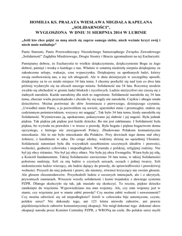 HOMILIA KS. PRAŁATA WIESŁAWA MIGDAŁA KAPELANA „SOLIDARNOŚCI”, WYGŁOSZONA W DNIU 31 SIERPNIA 2014 W LUBINIE „Jeśli kto chce pójść za mną niech się zaprze samego siebie, niech weźmie krzyż swój i niech mnie naśladuje” Panie Starosto, Panie Przewodniczący Niezależnego Samorządnego Związku Zawodowego „Solidarność” Zagłębia Miedziowego, Drogie Siostry i Bracia zgromadzeni na tej Eucharystii. Pamiętamy dobrze, że Eucharystia to wielkie dziękczynienie, dziękczynienie Bogu za Jego dobroć, pamięć i troskę o każdego z nas. Właśnie w ostatnią niedzielę sierpnia dziękujemy za zakończone urlopy, wakacje, czas wypoczynku. Dziękujemy za spotkanych ludzi, którzy swoją osobowością nas, a my ich ubogacali. Ale w dniu dzisiejszym w szczególny sposób, dziękujemy za to co miało miejsce 34 lata temu. I chcemy pochylić się nad tym co dwa lata później wydarzyło się na ulicach naszego miasta. Solidarność ma 34 lata. Rocznicę urodzin zwykło się obchodzić w gronie ludzi bliskich i życzliwych. Ludzie nieżyczliwi nie cieszą się z żadnych narodzin. Każde narodziny dla nich to zagrożenie. Solidarność narodziła się 34 lata temu, chociaż wielu przeszkadzało i chciało by się nigdy nie narodziła. Ciężkie i ubogie miała dzieciństwo. Można porównać do słów Jeremiasza z pierwszego, dzisiejszego czytania. „Uwiodłeś mnie Panie, a ja pozwoliłem się uwieść, ujarzmiłeś mnie i przemogłeś, stałem się codziennym pośmiewiskiem, wszyscy mi urągają”, Tak było 34 lata temu, kiedy narodziła się Solidarność. Wyśmiewano ją, upokarzano, pokazywano jej słabość i jej nagość. Była jednak piękna. Tak piękna jak piękne jest każde dziecko. Bo nie jest zakłamane. I Solidarność była piękna, bo wyrosła na prawdzie i w trosce o prawdę. Była bogata i piękna bogactwem domu ojczystego, z którego nie zrezygnowali Polacy. Zbudowano Polakom komunistyczne mieszkanie. Ale to nie było mieszkanie dla Polaków. Przy drzwiach tego domu stał obcy żołnierz, z karabinem w ręku. Do czego zdolny, widzimy dzisiaj na sąsiedniej Ukrainie. Solidarność natomiast była dla wszystkich uosobieniem szczytnych ideałów i prawości, wolności, godności człowieka i niepodległości. Wyrastała z polskiej, religijnej rodziny. Nie był jej obcy różaniec. Nie był jej obcy ołtarz. Nie była jej obca Ewangelia. Wiara była jej siłą, a Kościół fundamentem. Takiej Solidarności zawierzono 34 lata temu, w takiej Solidarności położono nadzieję. Szli za nią ludzie o czystych sercach, oczach i jednej twarzy. Szli niekoniecznie ludzie wierzący, ale ludzie dążący do prawdy, do sprawiedliwości i prawdziwej wolności. Przyszli do niej pokorni i prawi, ale niestety, również krzyczący nie swoim głosem. Ale głosem zleceniodawców. Przychodzili ludzie o szczerych intencjach, ale i o ukrytych, prywatnych zamiarach. Wreszcie weszły solidarność i konie trojańskie z dawnego systemu PZPR. Dlatego skończyło się tak, jak musiało się skończyć. To roczne, piękne dziecko zamknięto do więzienia. Wypowiedziano mu stan wojenny. Ale, czy stan wojenny jest w stanie, czy więzienie jest w stanie zabić prawdę? Czy można zabić wolność i suwerenność? Czy można odwrócić się od niepodległości? Jeżeli w człowieku bije autentyczne, czyste, polskie serce? Nie dokonały tego, ani 123 letnia niewola zaborów, ani prawie pięćdziesięciolecie zaborów komunistycznej okupacji. Nie mógł dokonać tego dokonać okres okupacji narodu przez Komitet Centralny PZPR, z WRONą na czele. Bo polskie serce myśli po polsku. Bo polskie serce wzrastało na podłożu wiary, Ewangelii, prawdy. Prawdą jest, że stan wojenny pochłonął niepotrzebne ofiary. Ale krew jednych jest siłą dla drugich. I oto drugi powód naszego, dzisiejszego spotkania przy Chrystusowym ołtarzu. Pamięć o ofiarach Zbrodni Lubińskiej. 32 lata temu, do ludzi pokojowo manifestujących niezadowolenie z wprowadzenia stanu wojennego wyprowadzono czołgi, użyto ostrej broni. Na ulicach naszego miasta zginęło trzech mężczyzn, a kilkudziesięciu zostało rannych. Dziś polecamy Ich w tej Eucharystii Bożemu Miłosierdziu. I wierzymy, że otrzymali nagrodę nieba. Dziś otaczamy modlitwą rodziny poległych na ulicach naszego miasta. I tych, którzy cierpią i będą cierpieć kalectwo aż do śmierci. Aby Bóg dał im siłę i moc do przetrwania. Ojczyzno ma, tyle razy pragnęłaś wolności, tyle razy tłumił je kat, ale zawsze czynili to obcy, a 32 lata temu uczynił to brat. I dlatego tym bardziej bolesne, że po gehennie II wojny Światowej, kiedy społeczeństwo coraz bardziej jednoczyło się na Ziemiach Zachodnich, wypowiedziano mu wojnę. Użyto broni, zamordowano niewinnych ludzi. Takie upokorzenia przeszła dzisiejsza Solidarność. Bo niewinnych i niepotrzebnych śmierciach, po niesłusznych wyrokach, i próbie zastraszenia Solidarność wstała z kolan. Czas próby zweryfikował i pokazał, kto jest kim. I myślę, że im dalej od tych wydarzeń, tym bardziej jesteśmy świadomi, komu zawdzięczamy te dzisiejsze niepowodzenia. Dziękujemy Bogu za 34 lata istnienia Solidarności, Ale czy to pełna radość? Powstało Europejskie Centrum Solidarności w Gdańsku, nie mające nic wspólnego z Solidarnością 80 roku. Centrum Solidarności, które zakończyło swoje działanie na Okrągłym Stole. Aparatczycy i sprzedawcy, zapewniający sobie ciepłe stołki. Prawdziwa Solidarność dalej jest, żyje i żyć będzie. I walczy o godność człowieka, o poszanowanie prawa, sprawiedliwość i godność, niepodległość Ojczyzny. I dlatego drodzy Bracia i Siostry miejmy otwarte oczy, nie dajmy się ukołysać pochlebstwom i nie zapominajmy, czego nie wolno nam zapomnieć. Nie zapominajmy, że istnieje starodawny wąż Pychy. On nie ustąpił, on wnika w serca każdego kto chce znaczenia za darmo. I dziś to widzimy. Nie ważny jest ideał Solidarnoś
