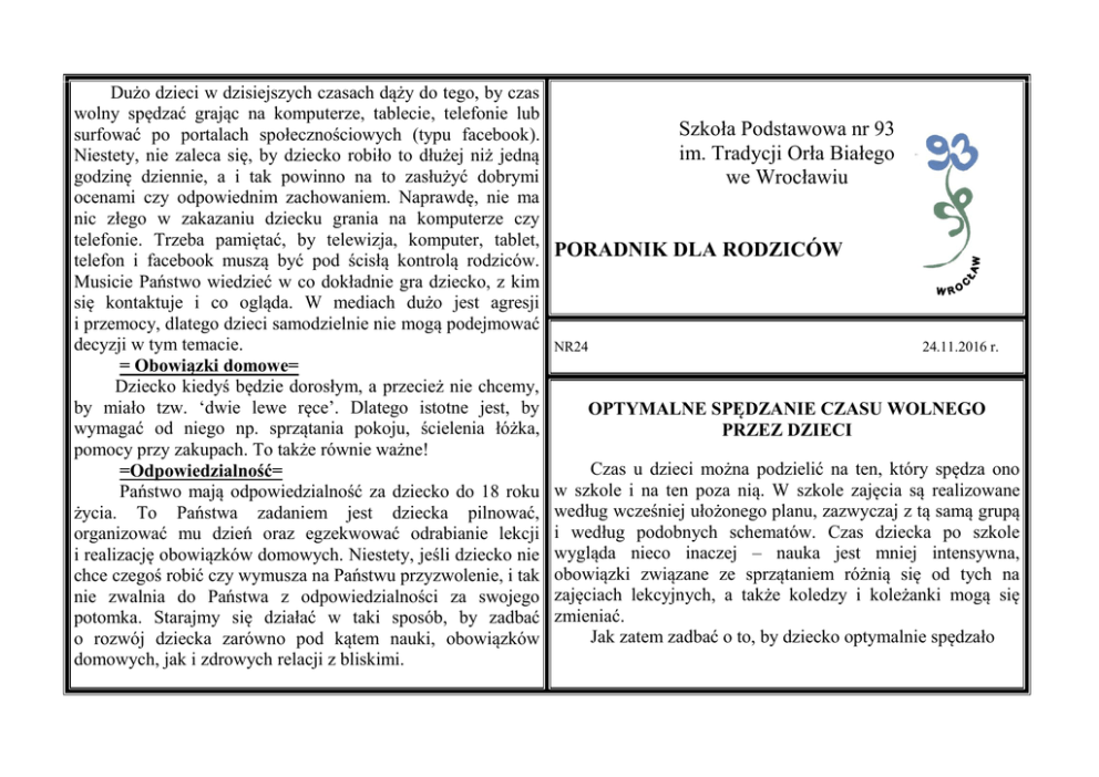 Dużo dzieci w dzisiejszych czasach dąży do tego, by czas wolny spędzać grając na komputerze, tablecie, telefonie lub surfować po portalach społecznościowych (typu facebook). Niestety, nie zaleca się, by dziecko robiło to dłużej niż jedną godzinę dziennie, a i tak powinno na to zasłużyć dobrymi ocenami czy odpowiednim zachowaniem. Naprawdę, nie ma nic złego w zakazaniu dziecku grania na komputerze czy telefonie. Trzeba pamiętać, by telewizja, komputer, tablet, telefon i facebook muszą być pod ścisłą kontrolą rodziców. Musicie Państwo wiedzieć w co dokładnie gra dziecko, z kim się kontaktuje i co ogląda. W mediach dużo jest agresji i przemocy, dlatego dzieci samodzielnie nie mogą podejmować decyzji w tym temacie. = Obowiązki domowe= Dziecko kiedyś będzie dorosłym, a przecież nie chcemy, by miało tzw. ‘dwie lewe ręce’. Dlatego istotne jest, by wymagać od niego np. sprzątania pokoju, ścielenia łóżka, pomocy przy zakupach. To także równie ważne! =Odpowiedzialność= Państwo mają odpowiedzialność za dziecko do 18 roku życia. To Państwa zadaniem jest dziecka pilnować, organizować mu dzień oraz egzekwować odrabianie lekcji i realizację obowiązków domowych. Niestety, jeśli dziecko nie chce czegoś robić czy wymusza na Państwu przyzwolenie, i tak nie zwalnia do Państwa z odpowiedzialności za swojego potomka. Starajmy się działać w taki sposób, by zadbać o rozwój dziecka zarówno pod kątem nauki, obowiązków domowych, jak i zdrowych relacji z bliskimi. Szkoła Podstawowa nr 93 im. Tradycji Orła Białego we Wrocławiu PORADNIK DLA RODZICÓW NR24 24.11.2016 r. OPTYMALNE SPĘDZANIE CZASU WOLNEGO PRZEZ DZIECI Czas u dzieci można podzielić na ten, który spędza ono w szkole i na ten poza nią. W szkole zajęcia są realizowane według wcześniej ułożonego planu, zazwyczaj z tą samą grupą i według podobnych schematów. Czas dziecka po szkole wygląda nieco inaczej – nauka jest mniej intensywna, obowiązki związane ze sprzątaniem różnią się od tych na zajęciach lekcyjnych, a także koledzy i koleżanki mogą się zmieniać. Jak zatem zadbać o to, by dziecko optymalnie spędzało czas po szkole? Na początku warto spytać samych siebie na czym zależy nam najbardziej? Czy na nauce dziecka? Na jego przestrzeganiu zasad? Realizacji obowiązków domowych? Dogadywaniu się z rodzeństwem? A może wszystko jest istotne w podobnym stopniu? Rozważmy więc spędzanie czasu wolnego przez dzieci w kilku aspektach. =Nauka = Najlepszym rozwiązaniem jest działanie w imię zasady: „najpierw obowiązki, a później przyjemności”. Kiedy dziecko po szkole np. zje obiad i chwilę odpocznie, powinno zasiąść do odrabiania lekcji. Najlepiej od razu odrabiać te zadania domowe, które były zadane konkretnego dnia, niż zostawiać je na dzień przed lekcją. Po odrobieniu lekcji dziecko powinno się przygotowywać do odpowiedzi, sprawdzianów czy kartkówek. Oczywiście, zalecane są przerwy w toku nauki, jednak warto zadbać o to, by były krótkie i skupiały się na rzeczywistym odpoczynku (np. wyjście na podwórko zamiast gry na tablecie). Każda osoba uczy się w różnym tempie, jednak dziennie nie powinno uczyć się łącznie krócej niż godzinę. W przypadku zaległości – nauka powinna trwać o wiele dłużej. Zdarza się, że dzieciaki nie chcą odrabiać lekcji i mówią rodzicom, że nic nie jest zadane. Nieważne. Trzeba wtedy sprawdzić w zeszytach, ćwiczeniach i książkach czy jest zaznaczone zadanie domowe, a jeśli nie, to stanowczo zdecydować, że dziecko i tak ma się uczyć. Zawsze przecież można podać mu podobne jak na dzisiejszej lekcji przykłady z matematyki, zalecić napisanie krótkiego wypracowania czy przygotowania się do odpowiedzi. Dobrym rozwiązaniem jest również zapisać dziecko do świetlicy takiej jak Iskierka czy Akson, gdzie wychowawcy pomogą mu to wszystko zrobić. =Zabawa= Najwspanialszą i najbardziej stymulującą rozwój dziecka aktywnością jest aktywność fizyczna na świeżym powietrzu: granie w piłkę, w chowanego, gonienie się itd. Oczywiście nie może być tak, że uczeń robi to całymi dniami i w żaden sposób nie realizuje obowiązków dotyczących nauki. Jednakże po odrobieniu lekcji najlepiej zadbać o to, by dziecko spędzało czas na dworze, oczywiście w odpowiednim towarzystwie i pod kontrolą rodziców. Ponadto warto wspierać zainteresowania uczniów: umożliwić im uczestniczenie w dodatkowych zajęciach, zachęcać do robienia prac plastycznych, technicznych czy innego typu aktywności. Pomocne mogą okazać się książki: „Co robić, gdy dzieci się nudzą?” [ E. Rozkrut] – podająca ponad 100 pomysłów na zabawy tanim kosztem oraz „50 gier i zabaw, które pomogą dzieciom poskromić ADHD” [P. Quinn, J. M. Stern] – niekoniecznie dla uczniów za ADHD, lecz dla wszystkich, którzy chcą poprawić koncentrację i spostrzegawczość dziecka. Dla każdego dziecka najważniejszy jest czas spędzony z rodzicem, więc najlepiej wspólnie rozmawiać, piec czy gotować i budować w ten sposób jak najlepszą z nim relację.