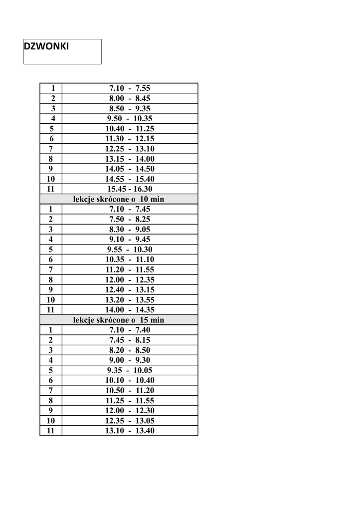 DZWONKI 1 2 3 4 5 6 7 8 9 10 11 1 2 3 4 5 6 7 8 9 10 11 1 2 3 4 5 6 7 8 9 10 11 7.10 - 7.55 8.00 - 8.45 8.50 - 9.35 9.50 - 10.35 10.40 - 11.25 11.30 - 12.15 12.25 - 13.10 13.15 - 14.00 14.05 - 14.50 14.55 - 15.40 15.45 - 16.30 lekcje skrócone o 10 min 7.10 - 7.45 7.50 - 8.25 8.30 - 9.05 9.10 - 9.45 9.55 - 10.30 10.35 - 11.10 11.20 - 11.55 12.00 - 12.35 12.40 - 13.15 13.20 - 13.55 14.00 - 14.35 lekcje skrócone o 15 min 7.10 - 7.40 7.45 - 8.15 8.20 - 8.50 9.00 - 9.30 9.35 - 10.05 10.10 - 10.40 10.50 - 11.20 11.25 - 11.55 12.00 - 12.30 12.35 - 13.05 13.10 - 13.40