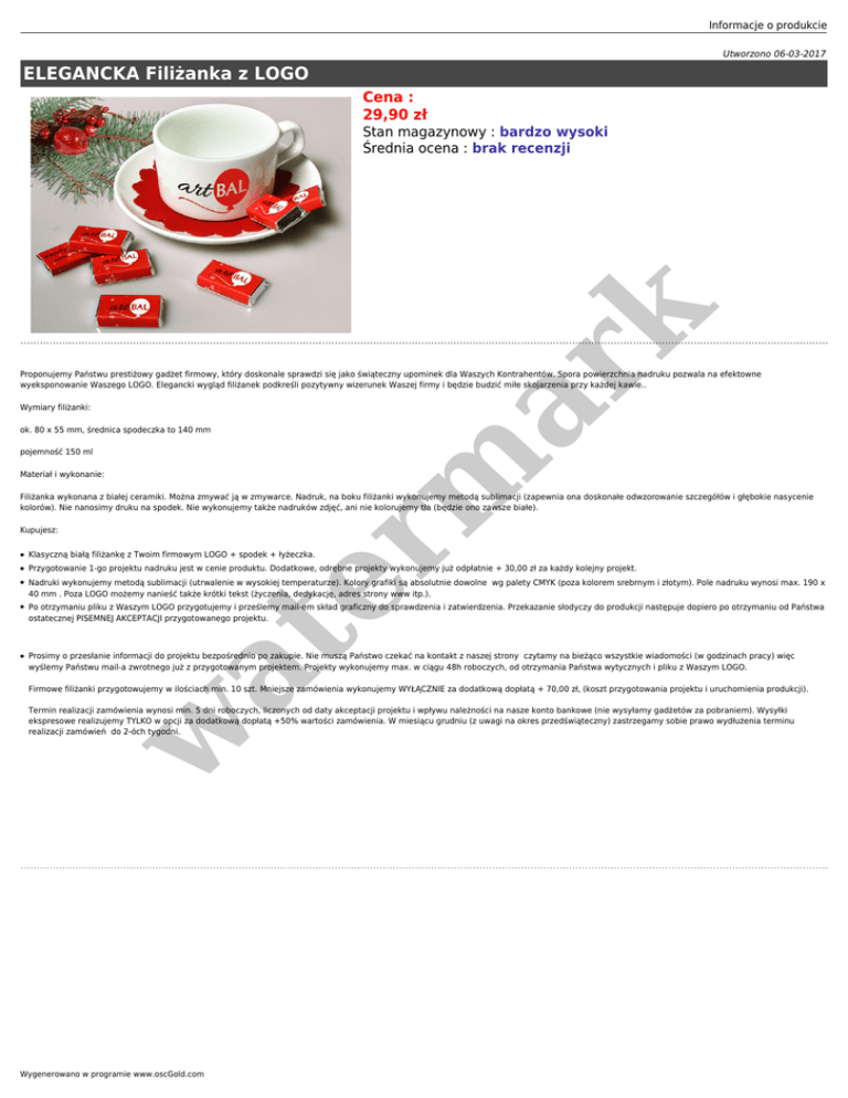 Informacje o produkcie Utworzono 06-03-2017 ELEGANCKA Filiżanka z LOGO Cena : 29,90 zł er m ar k Stan magazynowy : bardzo wysoki Średnia ocena : brak recenzji Proponujemy Państwu prestiżowy gadżet firmowy, który doskonale sprawdzi się jako świąteczny upominek dla Waszych Kontrahentów. Spora powierzchnia nadruku pozwala na efektowne wyeksponowanie Waszego LOGO. Elegancki wygląd filiżanek podkreśli pozytywny wizerunek Waszej firmy i będzie budzić miłe skojarzenia przy każdej kawie.. Wymiary filiżanki: ok. 80 x 55 mm, średnica spodeczka to 140 mm pojemność 150 ml Materiał i wykonanie: Filiżanka wykonana z białej ceramiki. Można zmywać ją w zmywarce. Nadruk, na boku filiżanki wykonujemy metodą sublimacji (zapewnia ona doskonałe odwzorowanie szczegółów i głębokie nasycenie kolorów). Nie nanosimy druku na spodek. Nie wykonujemy także nadruków zdjęć, ani nie kolorujemy tła (będzie ono zawsze białe). Kupujesz: ● Klasyczną białą filiżankę z Twoim firmowym LOGO + spodek + łyżeczka. ● Przygotowanie 1-go projektu nadruku jest w cenie produktu. Dodatkowe, odrębne projekty wykonujemy już odpłatnie + 30,00 zł za każdy kolejny projekt. ● ● Nadruki wykonujemy metodą sublimacji (utrwalenie w wysokiej temperaturze). Kolory grafiki są absolutnie dowolne wg palety CMYK (poza kolorem srebrnym i złotym). Pole nadruku wynosi max. 190 x 40 mm . Poza LOGO możemy nanieść także krótki tekst (życzenia, dedykację, adres strony www itp.). Po otrzymaniu pliku z Waszym LOGO przygotujemy i prześlemy mail-em skład graficzny do sprawdzenia i zatwierdzenia. Przekazanie słodyczy do produkcji następuje dopiero po otrzymaniu od Państwa ostatecznej PISEMNEJ AKCEPTACJI przygotowanego projektu. at ● Prosimy o przesłanie informacji do projektu bezpośrednio po zakupie. Nie muszą Państwo czekać na kontakt z naszej strony czytamy na bieżąco wszystkie wiadomości (w godzinach pracy) więc wyślemy Państwu mail-a zwrotnego już z przygotowanym projektem. Projekty wykonujemy max. w ciągu 48h roboczych, od otrzymania Państwa wytycznych i pliku z Waszym LOGO. Firmowe filiżanki przygotowujemy w ilościach min. 10 szt. Mniejsze zamówienia wykonujemy WYŁĄCZNIE za dodatkową dopłatą + 70,00 zł, (koszt przygotowania projektu i uruchomienia produkcji). w Termin realizacji zamówienia wynosi min. 5 dni roboczych, liczonych od daty akceptacji projektu i wpływu należności na nasze konto bankowe (nie wysyłamy gadżetów za pobraniem). Wysyłki ekspresowe realizujemy TYLKO w opcji za dodatkową dopłatą +50% wartości zamówienia. W miesiącu grudniu (z uwagi na okres przedświąteczny) zastrzegamy sobie prawo wydłużenia terminu realizacji zamówień do 2-óch tygodni. Wygenerowano w programie www.oscGold.com
