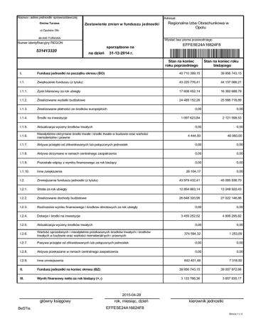Nazwa i adres jednostki sprawozdawczej Gmina Turawa ul.Opolska 39c Zestawienie zmian w funduszu jednostki 46-045 TURAWA Numer identyfikacyjny REGON 531413320 na dzień sporządzone na 31-12-2014 r. Adresat: Regionalna Izba Obrachunkowa w Opolu Wysłać bez pisma przewodniego EFFE5E24A16624F8 Stan na koniec roku poprzedniego Stan na koniec roku bieżącego I. Fundusz jednostki na początku okresu (BO) 40 710 399,15 39 956 743,15 I.1. Zwiększenie funduszu (z tytułu) 43 225 776,41 44 137 066,21 I.1.1. Zysk bilansowy za rok ubiegły 17 608 452,14 16 382 688,79 I.1.2. Zrealizowane wydatki budżetowe 24 489 152,26 25 586 718,89 I.1.3. Zrealizowane płatności ze środków europejskich I.1.4. Środki na inwestycje I.1.5. Aktualizacja wyceny środków trwałych 0,00 1 097 623,84 0,00 2 121 598,53 0,00 0,00 4 444,00 46 060,00 Aktywa przejęte od zlikwidowanych lub połączonych jednostek 0,00 0,00 I.1.8. Aktywa otrzymane w ramach centralnego zaopatrzenia 0,00 0,00 I.1.9. Pozostałe odpisy z wyniku finansowego za rok bieżący 0,00 0,00 I.1.10. Inne zwiększenia 26 104,17 0,00 I.2. Zmniejszenia funduszu jednostki (z tytułu) 43 979 432,41 45 085 936,70 I.2.1. Strata za rok ubiegły 12 854 863,14 13 248 922,43 I.2.2. Zrealizowane dochody budżetowe 26 648 320,95 27 022 146,86 I.2.3. Rozliczenie wyniku finansowego i środków obrotowych za rok ubiegły I.2.4. Dotacje i środki na inwestycje I.2.5. Aktualizacja wyceny środków trwałych I.1.6. I.1.7. Nieodpłatnie otrzymane środki trwałe i środki trwałe w budowie oraz wartości niematerialne i prawne 0,00 3 459 252,52 0,00 4 806 295,82 0,00 0,00 374 594,32 1 253,09 Pasywa przejęte od zlikwidowanych lub połączonych jednostek 0,00 0,00 I.2.8. Aktywa przekazane w ramach centralnego zaopatrzenia 0,00 0,00 I.2.9. Inne zmniejszenia 642 401,48 7 318,50 II. Fundusz jednostki na koniec okresu (BZ) 39 956 743,15 39 007 872,66 III. Wynik finansowy netto za rok bieżący (+,-) 3 133 766,36 3 657 830,17 I.2.6. I.2.7. BeSTia Wartość sprzedanych i nieodpłatnie przekazanych środków trwałych i środków trwałych w budowie oraz wartości niematerialnych i prawnych główny księgowy 2015-04-28 rok, miesiąc, dzień EFFE5E24A16624F8 kierownik jednostki Strona 1 z 3 III.1. zysk netto (+) 16 382 688,79 17 105 381,85 III.2. strata netto (-) -13 248 922,43 -13 447 551,68 IV. V. Nadwyżka dochodów jednostek budżetowych, nadwyżka środków obrotowych samorządowych zakładków budżetowych Fundusz (II+,-III-IV) 0,00 43 090 509,51 0,00 42 665 702,83 Informacje uzupełniające istotne dla oceny rzetelności i przejrzystości sytuacji finansowej : BeSTia główny księgowy 2015-04-28 rok, miesiąc, dzień EFFE5E24A16624F8 kierownik jednostki Strona 2 z 3 Wyjaśnienia do sprawozdania BeSTia główny księgowy 2015-04-28 rok, miesiąc, dzień EFFE5E24A16624F8 kierownik jednostki Strona 3 z 3