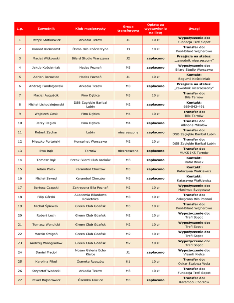 L.p. Zawodnik Klub macierzysty Grupa transferowa Opłata za wystawienie na listę Uwagi 1 Patryk Statkiewicz Arkadia Tczew J1 10 zł Wypożyczenie do: Fundacja Trefl Sopot 2 Konrad Kleinszmit Ósma Bila Kościerzyna J3 10 zł Transfer do: Pool-Bilard Wejherowo 3 Maciej Witkowski Bilard Studio Warszawa J2 zapłacono Przejście na status: „zawodnik niezrzeszony” 4 Jakub Kościelniak Hades Poznań M3 zapłacono Wypożyczenie do: Bilard Studio Warszawa 5 Adrian Borowiec Hades Poznań J1 10 zł Kontakt: Bogumił Kościelniak 6 Andrzej Fandrejewski Arkadia Tczew M3 zapłacono Przejście na status: „zawodnik niezrzeszony” 7 Maciej Auguścik Pino Dębica M3 10 zł Transfer do: Bila Tarnów 8 Michał Lichodziejewski DSB Zagłębie Baribal Lubin M2 zapłacono Kontakt: 669-542-491 9 Wojciech Gosk Pino Dębica M4 10 zł Transfer do: Bila Tarnów 10 Jerzy Regieli Pino Dębica M4 zapłacono Transfer do: Allinone Mikołów 11 Robert Zachar Lubin niezrzeszony zapłacono Transfer do: DSB Zagłębie Baribal Lubin 12 Mieszko Fortuński Konsalnet Warszawa M2 10 zł Transfer do: DSB Zagłębie Baribal Lubin 13 Ewa Bąk Tarnów niezrzeszona zapłacono Transfer do: MUKS IKS Tarnów 14 Tomasz Bąk Break Bilard Club Kraków M3 zapłacono Kontakt: Rafał Biniek 15 Adam Polak Karambol Chorzów M3 zapłacono Kontakt: Katarzyna Wałkiewicz 16 Michał Szwed Karambol Chorzów M3 zapłacono Kontakt: Katarzyna Wałkiewicz 17 Bartosz Czapski Zakręcona Bila Poznań M2 10 zł Wypożyczenie do: Maximus Bydgoszcz 18 Filip Górski Akademia Bilardowa Rokietnica M3 10 zł Transfer do: Zakręcona Bila Poznań 19 Michał Śpiewak Green Club Gdańsk M3 10 zł Transfer do: Pool-Bilard Wejherowo 20 Robert Lech Green Club Gdańsk M2 10 zł Wypożyczenie do: Trefl Sopot 21 Tomasz Wendicki Green Club Gdańsk M2 10 zł Wypożyczenie do: Trefl Sopot 22 Marcin Swigoń Green Club Gdańsk M2 10 zł Wypożyczenie do: Trefl Sopot 23 Andrzej Winogradow Green Club Gdańsk M2 10 zł Wypożyczenie do: Trefl Sopot 24 Daniel Macioł Nosan Galeria Echo Kielce J1 zapłacono Wypożyczenie do: Visanti Kielce 25 Karolina Pikul Ósemka Rzeszów K1 10 zł Transfer do: Oskar Stalowa Wola 26 Krzysztof Wodecki Arkadia Tczew M3 10 zł Transfer do: Fundacja Trefl Sopot 27 Paweł Bajsarowicz Ósemka Gliwice M3 zapłacono Transfer do: Karambol Chorzów 28 Damian Wędzonka Ósemka Gliwice M3 zapłacono Transfer do: Karambol Chorzów 29 Dawid Cieślak Sezam Wrocław M4 zapłacono Kontakt: Dawid Cieślak 30 Piotr Twerdyk Karambol Chorzów M4 zapłacono Transfer do: Ósemka Gliwice 31 Enkhbayar Osorgochoo Karambol Chorzów M3 10 zł Kontakt: Katarzyna Wałkiewicz 32 Lesław Łukaszewicz Frame Łódź M4 10 zł Transfer do: Arena Warszawa 33 Artur Pawłowski Trefl Sopot M2 10 zł Wypożyczenie do: Fundacja Trefl Sopot 34 Hubert Łopotko Metal Fach LP Sokółka M4 10 zł Kontakt: Lech Piekarski tel.: 602 249 388 35 Honorata Hurnik UKS Dąbrowa Łódź J3 10 zł Wypożyczenie do: Junior Frame Łódź 36 Paweł Hurnik UKS Dąbrowa Łódź J3 10 zł Wypożyczenie do: Junior Frame Łódź 37 Artur Czarnowski UKS 193 Łódź J3 10 zł Wypożyczenie do: Junior Frame Łódź 38 Adam Czapliński UKS 193 Łódź J2 10 zł Transfer do: Junior Frame Łódź 39 Sebastian Ryłko Break Ball Bielsko Biała M3 10 zł Wypożyczenie do: Balabushka Wodzisław 40 Piotr Grygierczyk Break Ball Bielsko Biała M3 10 zł Wypożyczenie do: Balabushka Wodzisław 41 Maksymilian Król UKS Olimp Kielce J3 10 zł Wypożyczenie do: Nosan Galeria Echo II Kielce 42 Dominik Wójcik UKS Olimp Kielce J3 10 zł Wypożyczenie do: Nosan Galeria Echo II Kielce 43 Łukasz Mokrzycki Hades Poznań M4 10 zł Transfer do: Loft Bilard Club Złotoryja 44 Roksana Siekierska UKS Olimpek Połaniec J2 10 zł Transfer do: UKS Żaczek Połaniec 45 Kamil Sadowski Frame Łódź M3 10 zł Wypożyczenie do: DSB Bandaclub Sky Tower Wrocław