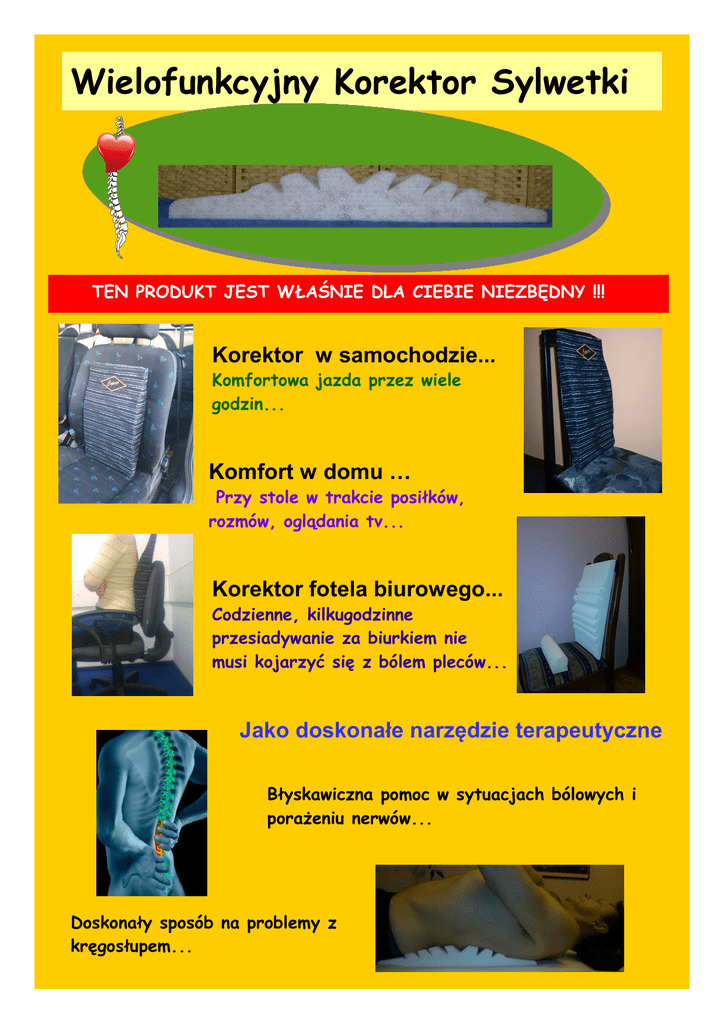 Wielofunkcyjny Korektor Sylwetki TEN PRODUKT JEST WŁAŚNIE DLA CIEBIE NIEZBĘDNY !!! Korektor w samochodzie... Komfortowa jazda przez wiele godzin... Komfort w domu … Przy stole w trakcie posiłków, rozmów, oglądania tv... Korektor fotela biurowego... Codzienne, kilkugodzinne przesiadywanie za biurkiem nie musi kojarzyć się z bólem pleców... Jako doskonałe narzędzie terapeutyczne Błyskawiczna pomoc w sytuacjach bólowych i porażeniu nerwów... Doskonały sposób na problemy z kręgosłupem... Większość współczesnych dolegliwości kręgosłupa, wiąże się z czynnościami dnia codziennego. Współczesny człowiek spędza coraz więcej czasu w pozycji siedzącej. Rozwój cywilizacji i nowoczesnych technik informatycznych, spowodowała że bardzo duża ilość pracowników zmuszona jest obsługiwać urządzenia medialne. Pozycja siedząca nie jest korzystna dla naszego kręgosłupa. Znaczne pochylenie sylwetki w przód, powoduje protrakcję ramion i głowy. Krążki międzykręgowe, przybierają postać klinowatą, skierowaną w kierunku przednim. Jądro miażdżyste krążka międzykręgowego przemieszcza się w kierunku wyrostków kolczystych, powoduje zwężenie przedniej części przestrzeni międzykręgowej. Najczęściej skutkiem jest mniejsze lub większe wypuklenie j krążka międzykręgowego, w kierunku zgodnym z linia wyrostków kolczystych , bądź przy bardziej złożonych przypadkach z jednoczesną rotacją w kierunku wyrostków poprzecznych. Taki stan drażni nerwy wychodzące z rdzenia kręgowego. Towarzyszy temu zjawisku generowanie bólu, w zależności od stopnia pochylenia. To najczęściej spotykane formy bólowe z jakimi zgłaszają się pacjenci do lekarzy i gabinetów terapii. Utrwalone wzorce ruchowe od wczesnego dzieciństwa, najczęściej potęgują skalę problemu. Istnieje wiele metod i możliwości do walki z tym dość często spotykanym zjawiskiem dnia codziennego. Rysunki przedstawiają dwie sylwetki człowieka. Lewa pokazuje najczęściej spotykaną sylwetkę podczas pracy . Kierowcy, pracownicy biur, młodzież przed komputerem, a także sylwetka podczas oglądania programów telewizyjnych. Skutkiem przyjmowania takiej sylwetki podczas pracy jest utrata anatomicznych krzywizn kręgosłupa. Kolejnym etapem, prócz pojawiającego się okresowo bólu, będzie stałe podrażnianie nerwów obwodowych, które wpływają na pracę większości organów wewnętrznych człowieka. Prowadzi to również do zachwiania równowagi psychicznej. Kiedy dodamy stres w jakim żyjemy, usztywnienie mięśni i powięzi, zauważymy że naszemu ciało przybiera czasami bardzo dziwne kształty. Wtedy okazuje się że systematycznie i stopniowo budujemy sobie schorzenia i choroby. W końcu po latach tortur nasze ciało mówi – dość!!!. Ból bowiem jest rozpaczliwym wołaniem o pomoc. Czy m o żna za pobie c t a k im syt ua c jom ? Ta k za st osow a ć Wie lofunk c yjny Kore k t or Sylw e t k i Przywraca anatomiczn e krzywizny kręgosłupa Zmniejsza napięcie powięziowo mięśniowe Korekta wad postawy Łagodzi i likwiduje wszelkie bóle i dysfunkcje kręgosłupa w bardzo krótkim czasie Zdjęcie przedstawia sylwetkę przed i po użyciu Wielofunkcyjnego Korektora Sylwetki Jak działa Wielofunkcyjny Korektor Sylwetki Napadowy i przewlekły ból pleców spowodowany jest deformacją i utrata krzywizn anatomicznych kregosłupa. Prowadzi to do znacznego napięcia struktur mięśniowo – powięziowych, oraz uciskiem nerwów leżących pomiędzy kręgami kręgosłupa. Korektor ma bardzo szeroki zakres działania. Odpowiednie ułożenie na korektorze powoduje, że ,,przyjmuje” on nasze ciało na specjalny profil. Profil tworzą skierowane w przeciwnych kierunkach nacięcia, na zastosowanej specjalnej piance. To właśnie daje efekt ,,cudownego” i kojącego działania. Stopniowe rozluźnianie tkanek i rodzaj specyficznego masażu, wykonuje pracę podobną do wielu godzin pracy masażysty czy fizjoterapeuty. Wycięty profil korektora masuje mięśnie pleców, przywracając ich normalne napięcie, podobnie jak to się dzieje w trakcie tradycyjnego japońskiego masażu shiatsu. Jednocześnie, zwiększamy stopniowo przestrzeń pomiędzy kręgami i umożliwiamy krążkom międzykręgowym uzyskanie prawidłowych kształtów. Ciało jest rozluźnione, sylwetka wraca do normy i ból zanika. Cudowne działanie profilu trwa od kilkudziesięciu sekund do kilku minut. To niespotykane do tej pory działanie, zawdzięcza wyjątkowej budowie i odpowiednio skonstruowanemu profilowi. Trakcja wywołana poprzez warstwę skóry, tkankę mięśniowo – powięziową i wyrostki kolczyste, w krótkim czasie zastępuje wielogodzinną pracę masażysty czy fizjoterapeuty. Lekkie objawy bólowe potwierdzają tylko pozytywne działanie profilu korektora. W pozycji siedzącej, korektor wymusza lordozę lędźwiową. Kręgosłup jest konstrukcja połączoną, dlatego pozostałe krzywizny powracają do anatomicznej postaci. Wszystko dzieje się praktycznie bez naszego udziału, samoczynnie pod wpływem profilu korektora. Dolna część profilu dociska dolny odcinek lordozy do siedzenia i ogranicza ruchy mimowolne. Górna część profilu powoduje prostowanie pochylonej do przodu sylwetki. Trakcja jest zbawiennym zjawiskiem dla kręgosłupa. Cały czas kręgosłup chroniony jest przed utratą lordozy i pochyleniem do przodu, poprzez aktywne działanie profilu. Jakie korzyści daje używanie Wielofunkcyjnego Korektora Sylwetki Pozbycie się uporczywych problemów z kręgosłupem biodrami przynosi ogromne korzyści. Skupiamy swą uwagę wyłącznie na wykonywanych czynnościach, lepiej śpimy, jesteśmy zdrowsi odzyskujemy chęci do działania. Nie czujemy fizycznych ograniczeń, jesteśmy bardziej mobilni. Nasza postawa jest prawidłowa, jesteśmy wyprostowani i pełni energii do życia. Po krótkiej chwili leżenia na korektorze, poczujemy się zrelaksowani, wolni od stresu, a większość nas