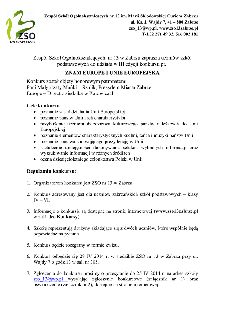 Zespół Szkół Ogólnokształcących nr 13 im. Marii Skłodowskiej Curie w Zabrzu ul. Ks. J. Wajdy 7, 41 – 800 Zabrze [email protected], www.zso13zabrze.pl Tel.32 271 49 32, 516 082 181 Zespół Szkół Ogólnokształcących nr 13 w Zabrzu zaprasza uczniów szkół podstawowych do udziału w III edycji konkursu pt.: ZNAM EUROPĘ I UNIĘ EUROPEJSKĄ Konkurs został objęty honorowym patronatem: Pani Małgorzaty Mańki – Szulik, Prezydent Miasta Zabrze Europe – Direct z siedzibą w Katowicach. Cele konkursu poznanie zasad działania Unii Europejskiej poznanie państw Unii i ich charakterystyka przybliżenie uczniom dziedzictwa kulturowego państw należących do Unii Europejskiej poznanie elementów charakterystycznych kuchni, tańca i muzyki państw Unii poznanie państwa sprawującego prezydencję w Unii kształcenie umiejętności dokonywania selekcji wybranych informacji oraz wyszukiwanie informacji w różnych źródłach ocena dziesięcioletniego członkostwa Polski w Unii Regulamin konkursu: 1. Organizatorem konkursu jest ZSO nr 13 w Zabrzu. 2. Konkurs adresowany jest dla uczniów zabrzańskich szkół podstawowych – klasy IV – VI. 3. Informacje o konkursie są dostępne na stronie internetowej (www.zso13zabrze.pl w zakładce Konkursy). 4. Szkołę reprezentują drużyny składające się z dwóch uczniów, które wspólnie będą odpowiadać na pytania. 5. Konkurs będzie rozegrany w formie kwizu. 6. Konkurs odbędzie się 29 IV 2014 r. w siedzibie ZSO nr 13 w Zabrzu przy ul. Wajdy 7 o godz.13 w sali nr 305. 7. Zgłoszenia do konkursu prosimy o przesyłanie do 25 IV 2014 r. na adres szkoły [email protected] wysyłając zgłoszenie konkursowe (załącznik nr 1) oraz oświadczenie (załącznik nr 2), dostępne na stronie internetowej. Zespół Szkół Ogólnokształcących nr 13 im. Marii Skłodowskiej Curie w Zabrzu ul. Ks. J. Wajdy 7, 41 – 800 Zabrze [email protected], www.zso13zabrze.pl Tel.32 271 49 32, 516 082 181 8. Zakres materiału: Pochodzenie nazwy Europa Kraje UE (położenie, władze, stolice, symbole, waluty państw (euro i narodowe) kiedy przystąpiły do Unii, tańce, muzyka, kuchnia) - ze szczególnym uwzględnieniem Grecji – państwa sprawującego prezydencję w Radzie Unii Europejskiej i Włoch – państwa, które będzie sprawowało prezydencję od 1 lipca 2014 r. Unia Europejska – historia, struktura (instytucje), siedziba, symbole. Dziedzictwo kulturowe krajów UE (np. Koloseum Luwr, Zamek Windsor, Big Ben, Wieża Eiffla, Most Karola, Brama Brandenburska, Tower Bridge, Stonehenge, Wersal, Notre – Dame, Watykan, Partenon, Zamek Królewski w Warszawie, Wawel, Zamek krzyżacko w Malborku, Ostra Brama 9. Organizator zastrzega sobie zmiany w regulaminie. 10. O wynikach końcowych decyduje komisja konkursowa. 11. W sprawach nieuregulowanych niniejszym regulaminem decyzje podejmują organizatorzy konkursu. 12. W miarę dostępnych środków laureaci mogą otrzymać pamiątkowe nagrody rzeczowe. Wszyscy uczestnicy otrzymają dyplomy potwierdzające ich udział w etapie finałowym, a ich opiekunowie podziękowania za przygotowanie do konkursu. 13. Osoby nagrodzone wyrażają automatycznie zgodę na wyrażenie swojego imienia i nazwiska oraz danych szkoły na stronie internetowej organizatora konkursu. 14. Przez przystąpienie w regulaminie. do konkursu uczestnicy akceptują zasady 15. W razie pytań lub wątpliwości prosimy o kontakt z organizatorami Ko m isj a k o nk ur s ow a w sk ła dz ie : mgr Anna Znajomska 604 073 879 mgr Bożena Parchańska mgr Iwona Czubaj zawarte