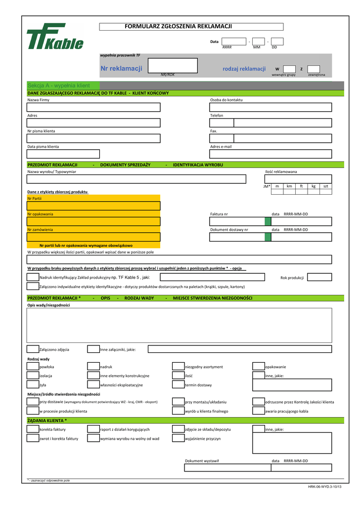 FORMULARZ ZGŁOSZENIA REKLAMACJI Data RRRR MM DD wypełnia pracownik TF rodzaj reklamacji Nr reklamacji NR/ROK W Z wewnątrz grupy zewnętrzna Sekcja A - wypełnia klient DANE ZGŁASZAJĄCEGO REKLAMACJĘ DO TF KABLE - KLIENT KOŃCOWY Nazwa Firmy Osoba do kontaktu Adres Telefon Nr pisma klienta Fax. Data pisma klienta Adres e-mail PRZEDMIOT REKLAMACJI - DOKUMENTY SPRZEDAŻY - IDENTYFIKACJA WYROBU Nazwa wyrobu/ Typowymiar Ilość reklamowana JM* m km ft kg szt Dane z etykiety zbiorczej produktu Nr Partii Nr opakowania Faktura nr data RRRR-MM-DD Nr zamówienia Dokument dostawy nr data RRRR-MM-DD Nr partii lub nr opakowania wymagane obowiązkowo W przypadku większej ilości partii, opakowań wpisać dane w poniższe pole W przypadku braku powyższych danych z etykiety zbiorczej proszę wybrać i uzupełnić jeden z poniższych punktów * - opcja Nadruk identyfikujący Zakład produkcyjny np. TF Kable 5 , jaki: Rok produkcji Załączono indywidualne etykiety identyfikacyjne - dotyczy produktów dostarczanych na paletach (krążki, szpule, kartony) PRZEDMIOT REKLAMACJI * - OPIS - RODZAJ WADY - MIEJSCE STWIERDZENIA NIEZGODNOŚCI Opis wady/niezgodności Załączono zdjęcia Inne załączniki, jakie: Rodzaj wady powłoka nadruk niezgodny asortyment opakowanie izolacja inne elementy konstrukcyjne ilość inne, jakie: żyła własności eksploatacyjne termin dostawy Miejsce/źródło stwierdzenia niezgodności przy dostawie (wymagany dokument potwierdzający WZ - kraj, CMR - eksport) przy montażu/układaniu odrzucone przez Kontrolę Jakości klienta w procesie produkcji klienta wyrób u klienta finalnego awaria pracującego kabla inne, jakie: ŻĄDANIA KLIENTA * korekta faktury raport z działań korygujących zdjęcie ze składu/depozytu zwrot i korekta faktury wymiana wyrobu na wolny od wad wyjaśnienie przyczyn Dokument wystawił data RRRR-MM-DD * - zaznaczyć odpowednie pole HRK-06-WYD.3-10/13