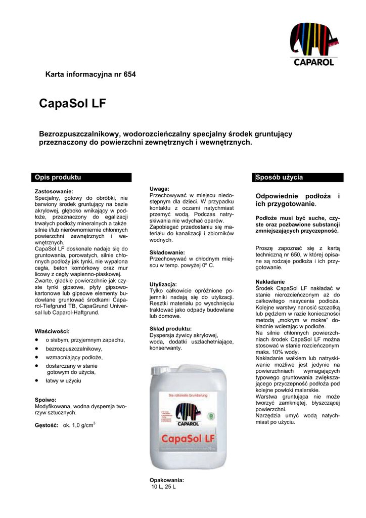 Karta informacyjna nr 654 CapaSol LF Bezrozpuszczalnikowy, wodorozcieńczalny specjalny środek gruntujący przeznaczony do powierzchni zewnętrznych i wewnętrznych. Opis produktu Sposób użycia Zastosowanie: Specjalny, gotowy do obróbki, nie barwiony środek gruntujący na bazie akrylowej, głęboko wnikający w podłoże, przeznaczony do egalizacji trwałych podłoży mineralnych a także silnie i/lub nierównomiernie chłonnych powierzchni zewnętrznych i wewnętrznych. CapaSol LF doskonale nadaje się do gruntowania, porowatych, silnie chłonnych podłoży jak tynki, nie wypalona cegła, beton komórkowy oraz mur licowy z cegły wapienno-piaskowej. Zwarte, gładkie powierzchnie jak czyste tynki gipsowe, płyty gipsowokartonowe lub gipsowe elementy budowlane gruntować środkami Caparol-Tiefgrund TB, CapaGrund Universal lub Caparol-Haftgrund. Właściwości: • • • • o słabym, przyjemnym zapachu, • łatwy w użyciu bezrozpuszczalnikowy, Uwaga: Przechowywać w miejscu niedostępnym dla dzieci. W przypadku kontaktu z oczami natychmiast przemyć wodą. Podczas natryskiwania nie wdychać oparów. Zapobiegać przedostaniu się materiału do kanalizacji i zbiorników wodnych. Składowanie: Przechowywać w chłodnym miejscu w temp. powyżej 0º C. Utylizacja: Tylko całkowicie opróżnione pojemniki nadają się do utylizacji. Resztki materiału po wyschnięciu traktować jako odpady budowlane lub domowe. Skład produktu: Dyspersja żywicy akrylowej, woda, dodatki uszlachetniające, konserwanty. wzmacniający podłoże, dostarczany w stanie gotowym do użycia, Spoiwo: Modyfikowana, wodna dyspersja tworzyw sztucznych. 3 Gęstość: ok. 1,0 g/cm Opakowania: 10 L, 25 L Odpowiednie podłoża ich przygotowanie. i Podłoże musi być suche, czyste oraz pozbawione substancji zmniejszających przyczepność. Proszę zapoznać się z kartą techniczną nr 650, w której opisane są rodzaje podłoża i ich przygotowanie. Nakładanie Środek CapaSol LF nakładać w stanie nierozcieńczonym aż do całkowitego nasycenia podłoża. Kolejne warstwy nanosić szczotką lub pędzlem w razie konieczności metodą „mokrym w mokre” dokładnie wcierając w podłoże. Na silnie chłonnych powierzchniach środek CapaSol LF można stosować w stanie rozcieńczonym maks. 10% wody. Nakładanie wałkiem lub natryskiwanie możliwe jest jedynie na powierzchniach wymagających typowego gruntowania zwiększającego przyczepność podłoża pod kolejne powłoki malarskie. Warstwa gruntująca nie może tworzyć zamkniętej, błyszczącej powierzchni. Narzędzia umyć wodą natychmiast po użyciu. Zużycie: Ok. 150 - 200 ml/m2 w zależności od chłonności podłoża. Dokładne zużycie sprawdzić na podstawie próby na obiekcie. Sposób nakładania: CapaSol LF nakładać typowymi pędzlami, wałkami lub aparatami natryskowymi, również typu airless. Natrysk airless: kąt natrysku : 20 - 50° dysza : 0,015" ciśnienie : 60 bar Narzędzia natychmiast po użyciu myć wodą. Doradztwo techniczne W karcie niniejszej niemożliwe jest opisanie sposobów przygotowania wszystkich występujących w praktyce podłoży. W przypadkach, które nie zostały opisane powyżej, pomocnym może okazać się kontakt z naszym Działem technicznym. Chętnie udzielimy Państwu szczegółowych informacji związanych z konkretnym obiektem. Tel. (22) 544 20 40 Fax (22) 544 20 41 [email protected] Rozcieńczenie: W razie konieczności rozcieńczyć woda. Minimalna temperatura użycia: +5° C (otoczenia, podłoża i materiału). Czas schnięcia: W temp. +20°C i względnej wilgotności powietrza 65% warstwa jest powierzchniowo sucha i nadaje się do powtórnego malowania po 12 godz. W niższych temperaturach i przy wyższej wilgotności powietrza czas ten ulega wydłużeniu. Uwaga: Nie stosować na powierzchniach poziomych narażonych na długotrwałe działanie wody. Techniczna karta informacyjna Nr 654. Stan: kwiecień 2007 2 Niniejsza karta informacyjna została sporządzona na bazie najnowszych osiągnięć techniki i naszych doświadczeń. Ze względu na różnorodność możliwych podłoży i warunków wykonawstwa każdorazowy Kupujący / Użytkownik jest zobowiązany sprawdzić na własną odpowiedzialność przydatność naszych produktów do zamierzonego celu przy każdorazowym uwzględnieniu warunków obiektowych wykonawstwa oraz wymogów i zasad sztuki i rzemiosła. Po ukazaniu się następnej wersji niniejsza karta traci swoją ważność. Caparol Polska Sp. z o. o.; ul. Baletowa 5C; PL – 02-867 Warszawa; tel. 022 544 20 40, faks 022 544 20 41; internet: www.caparol.com.pl Caparol Farben Lacke Bautenschutz GmbH; Roßdörfer Straße 50; D – 64372 Ober Ramstadt; tel. +49 6154 71-0; faks +49 6154 711391; internet: www.caparol.de